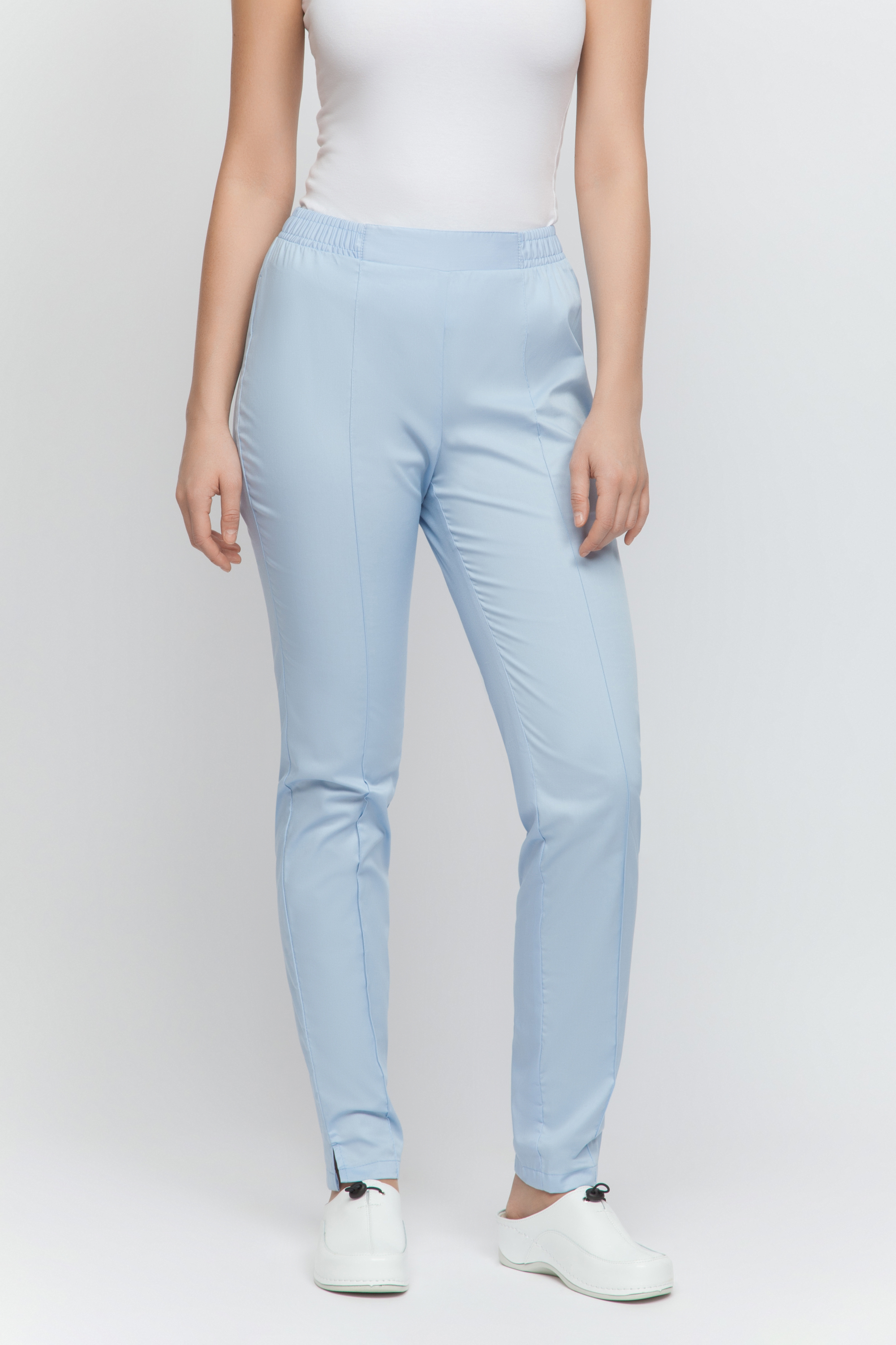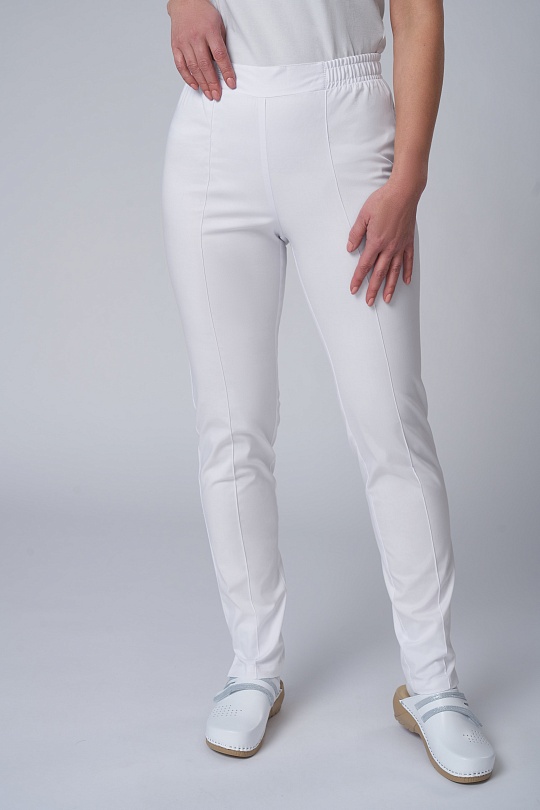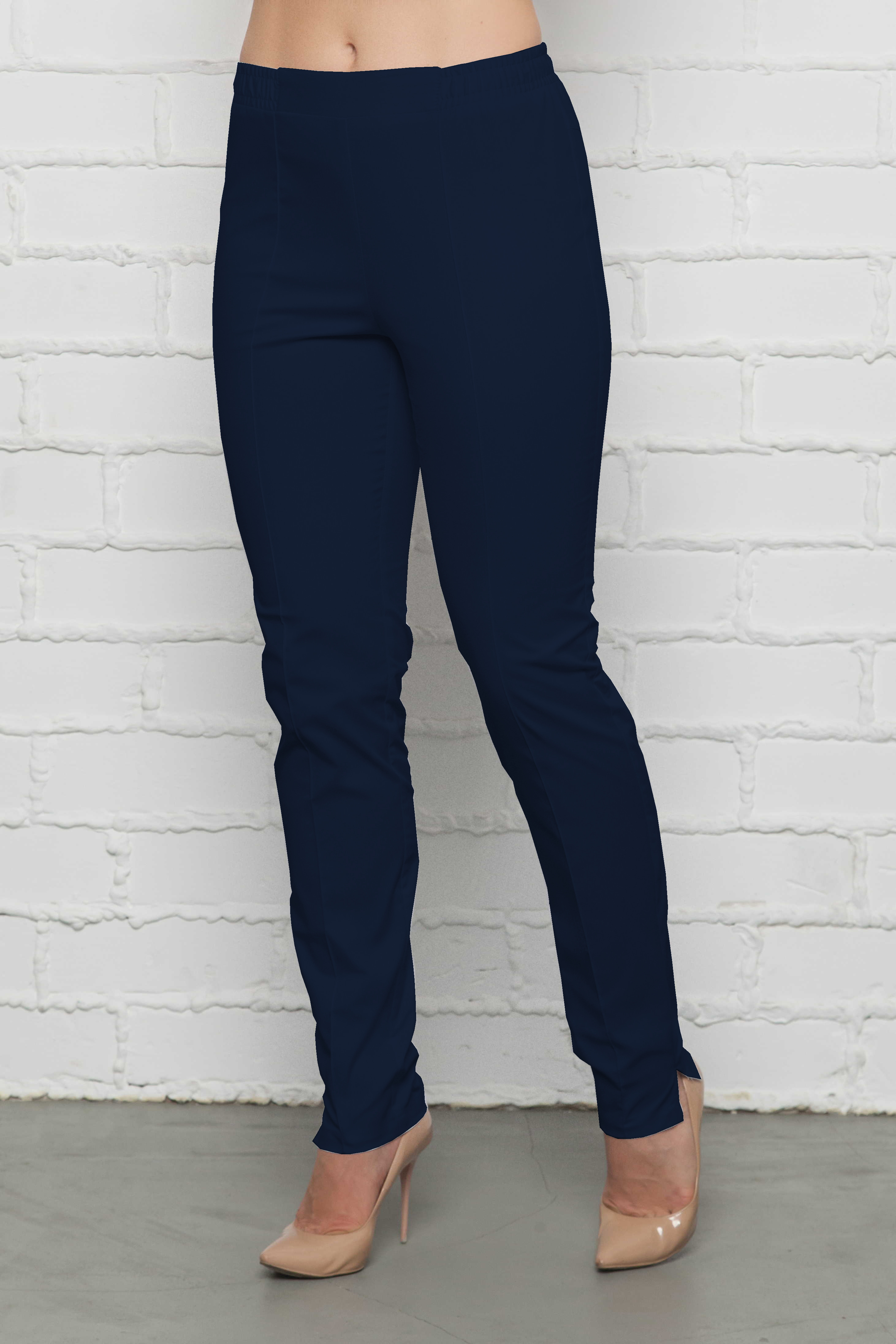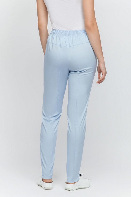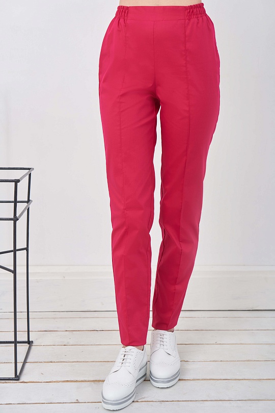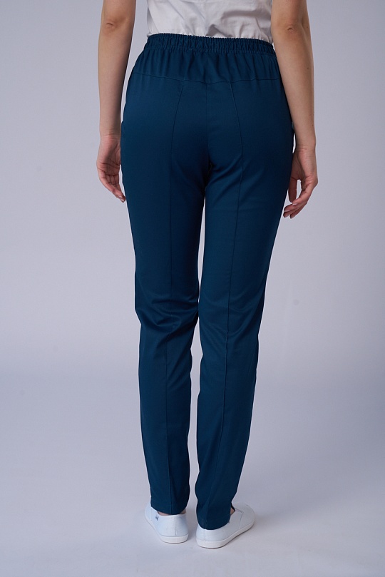Брюки женские, зауженные к низу, на притачном поясе с продернутой эластичной резиной, по низу в боковых швах разрезы. По передним и задним половинкам брюк застрочены стрелки. На задней части брюк отрезная кокетка