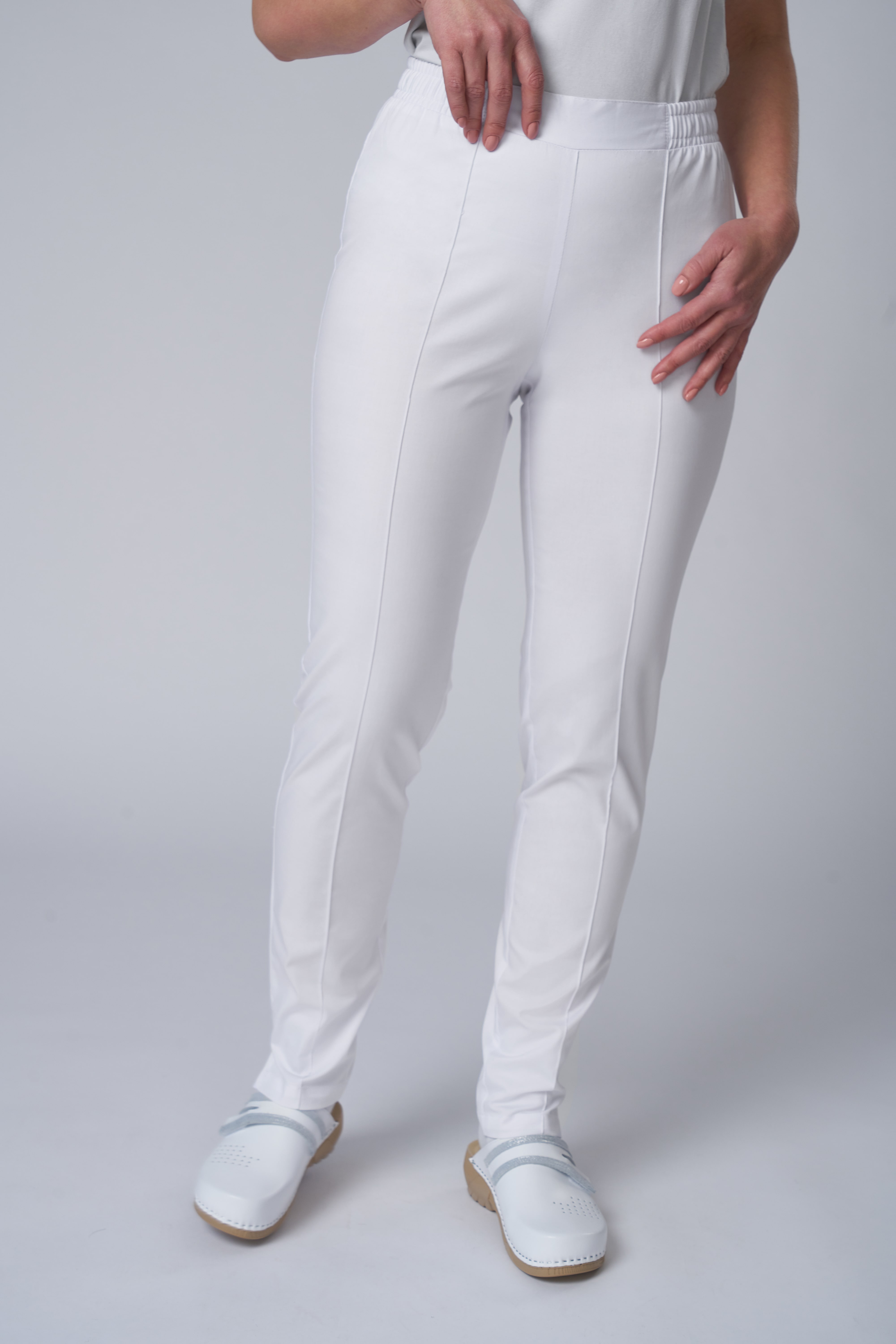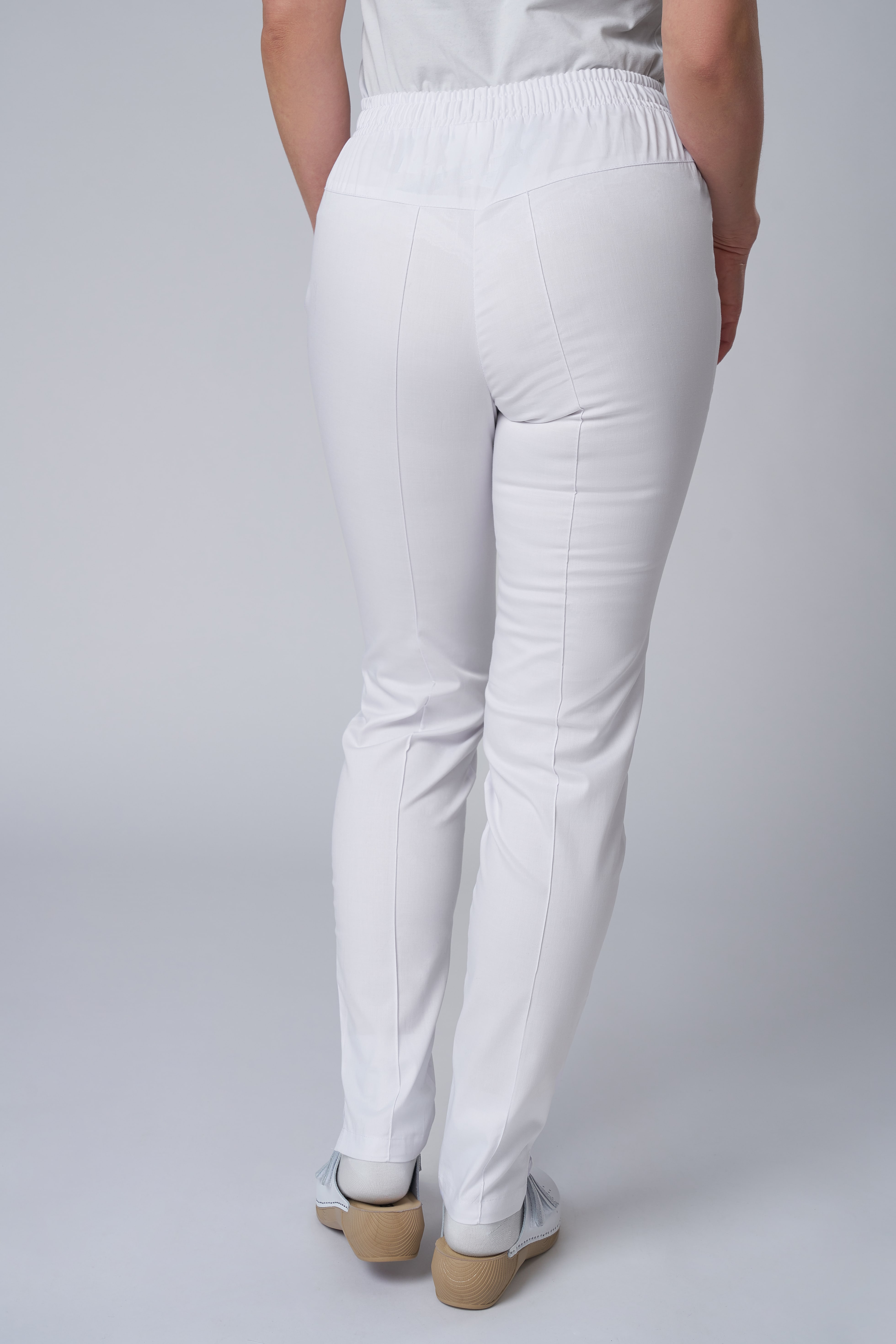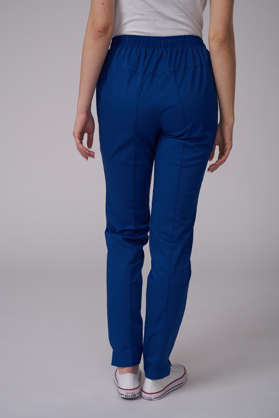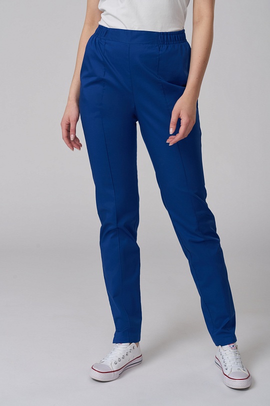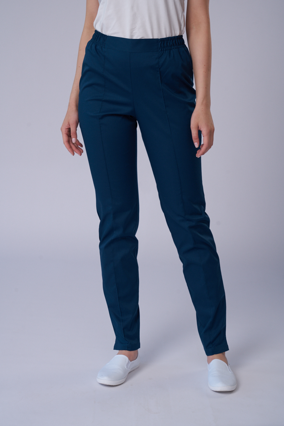 Брюки женские, зауженные к низу, на притачном поясе с продернутой эластичной резиной, по низу в боковых швах разрезы. По передним и задним половинкам брюк застрочены стрелки. На задней части брюк отрезная кокетка