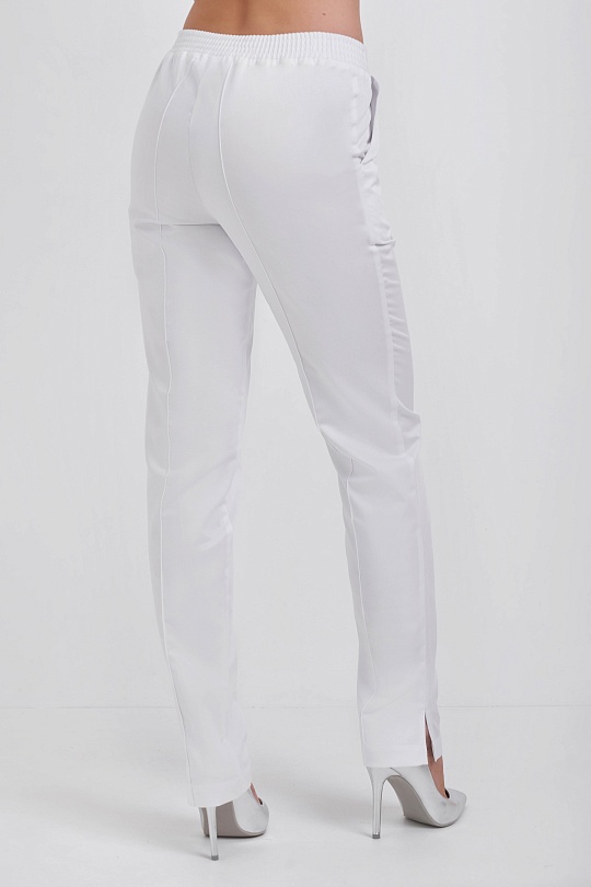 Брюки женские прямого силуэта, с отстроченными стрелками, поясом по талии. Пояс брюк с продернутой эластичной резиной, две строчки, фиксирующие резину проложены на расстоянии 2,0 см друг от друга. На передних половинках брюк расположены боковые карманы
