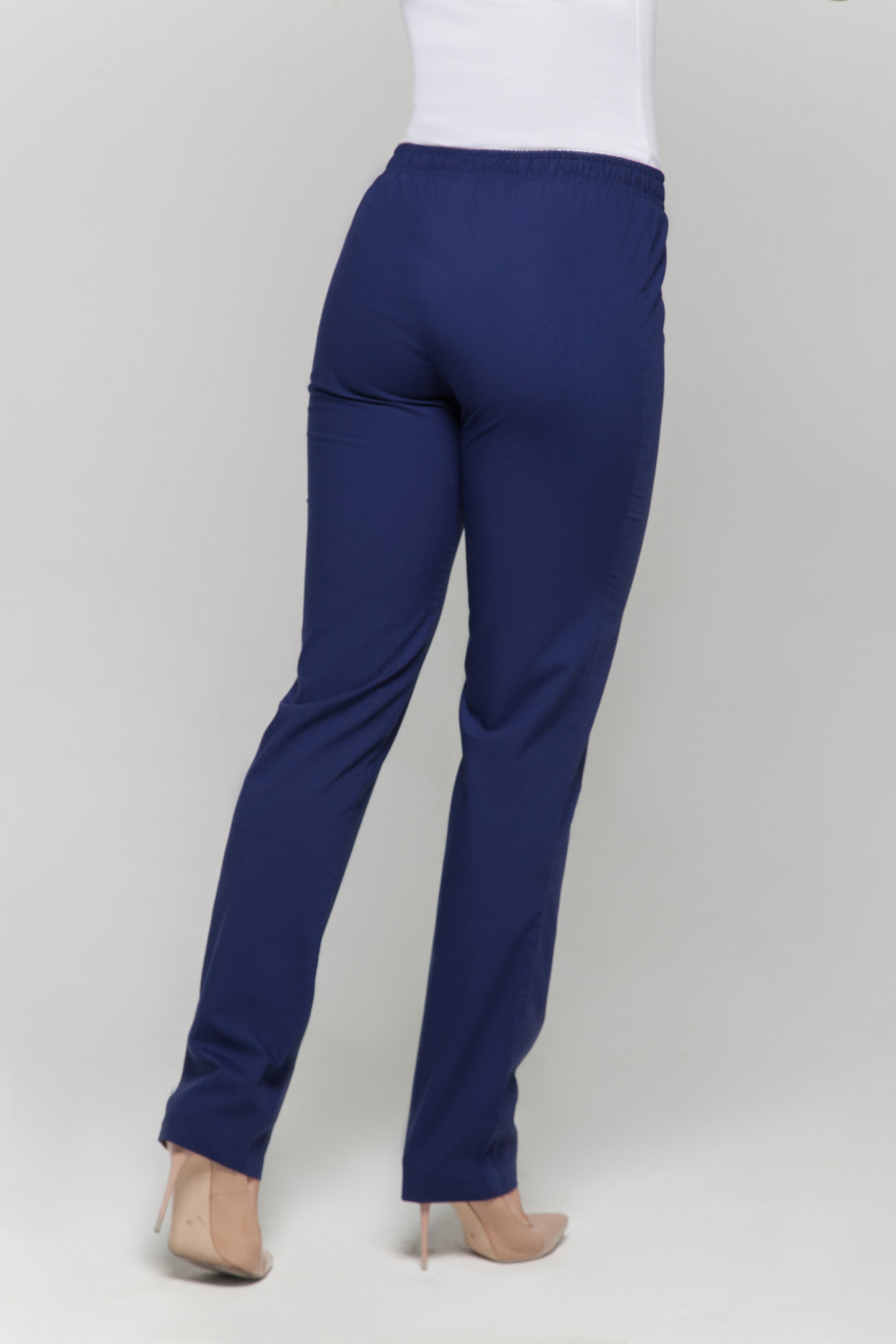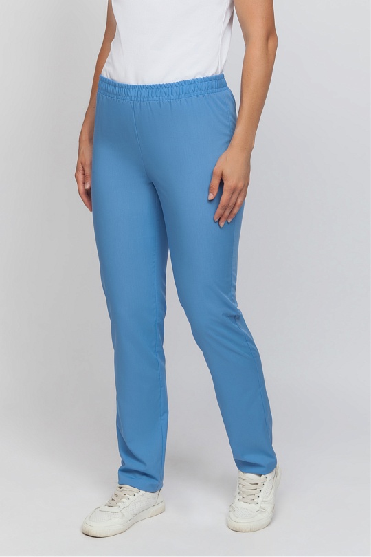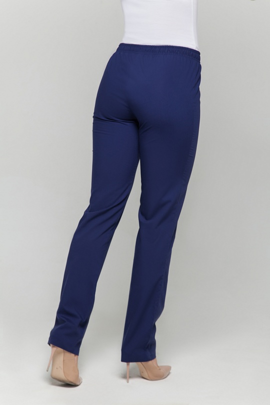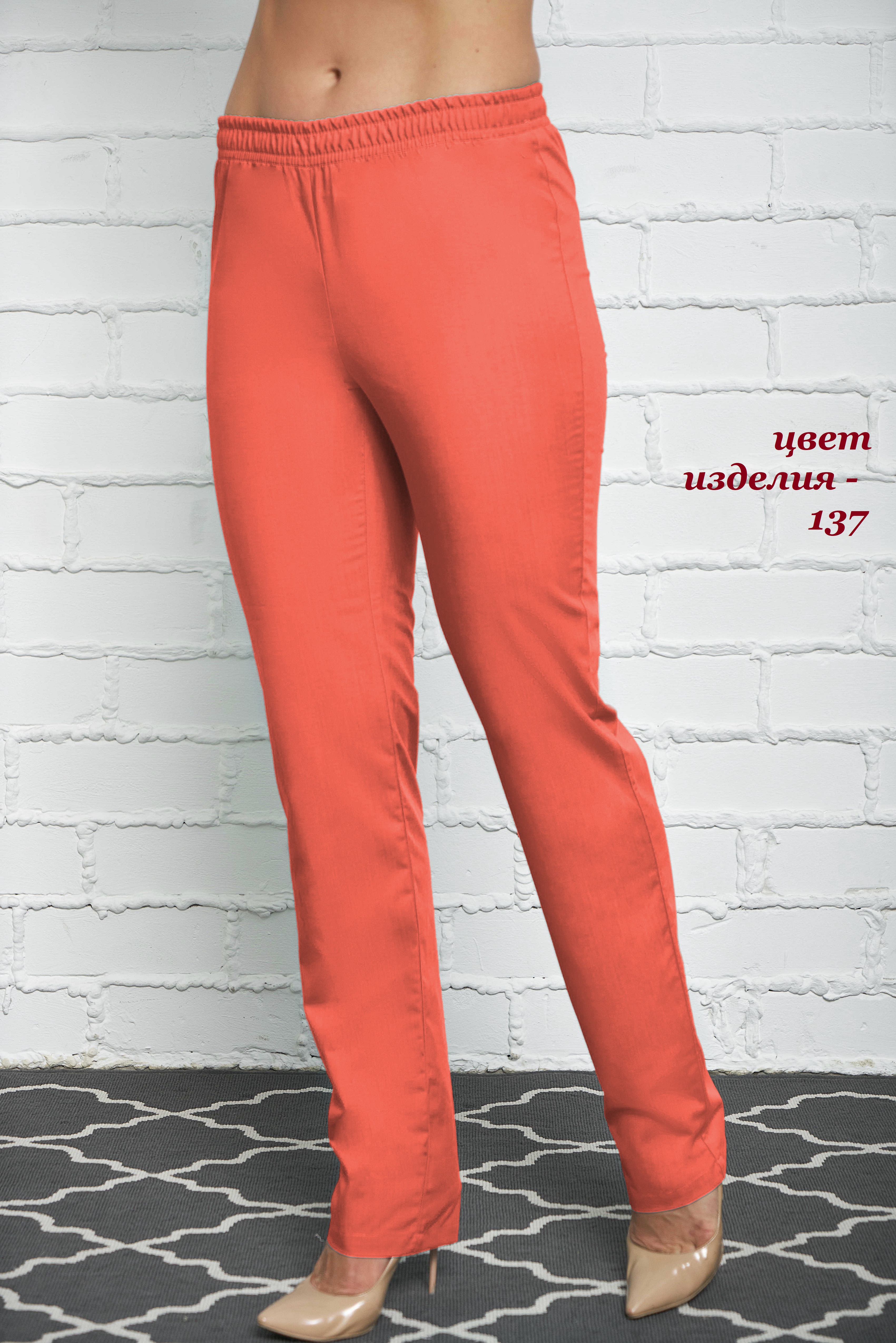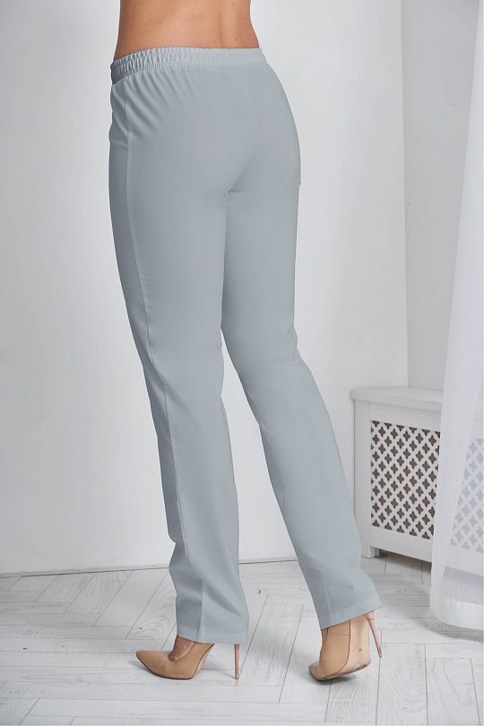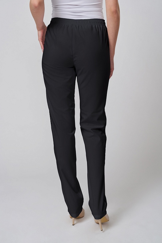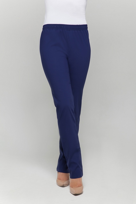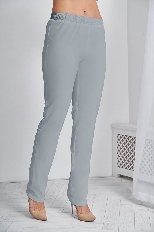 Брюки женские прямого силуэта, с поясом по талии. Пояс брюк с продернутой эластичной резинкой, две строчки, фиксирующие резину проложены на расстоянии 2,0 см друг от друга.