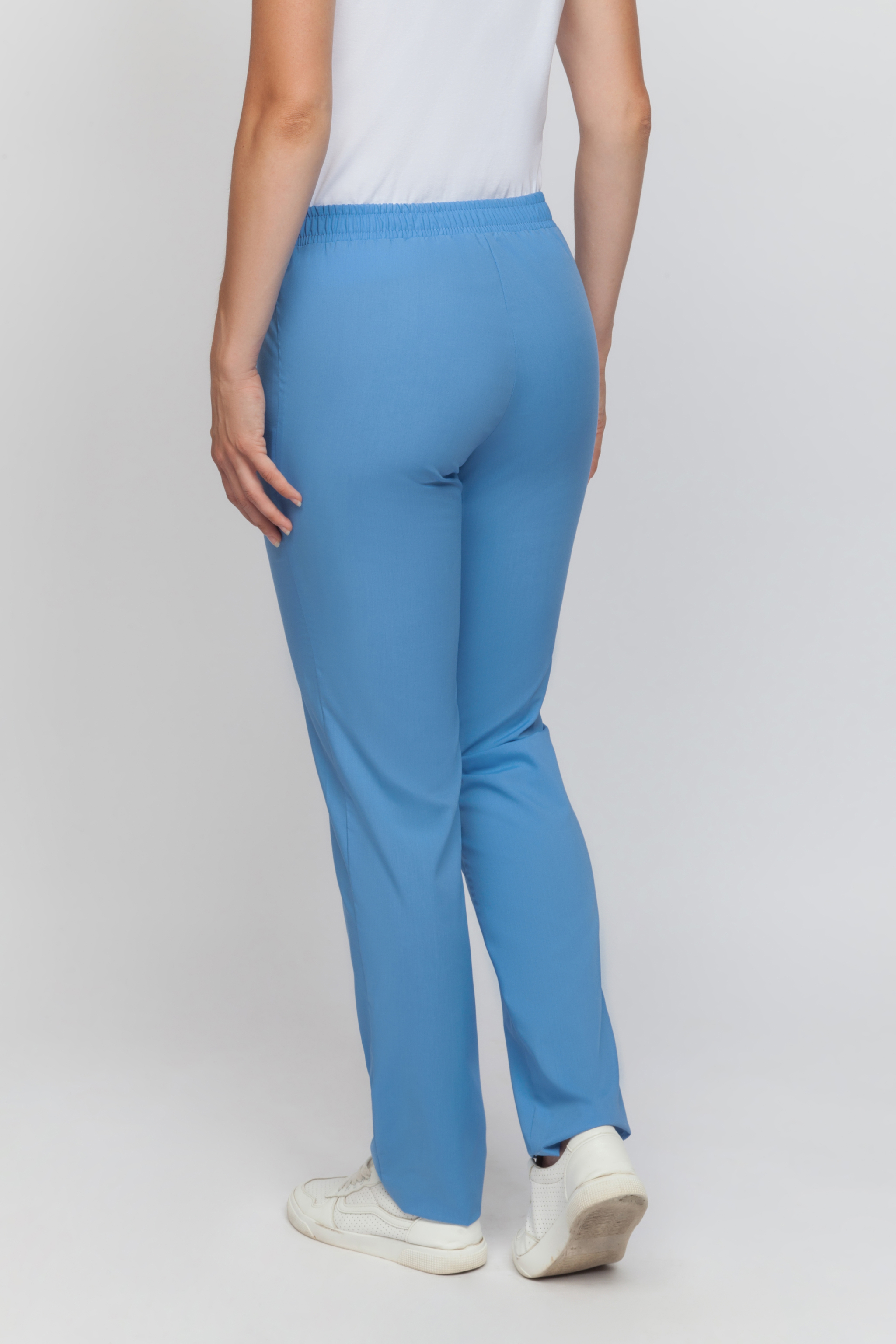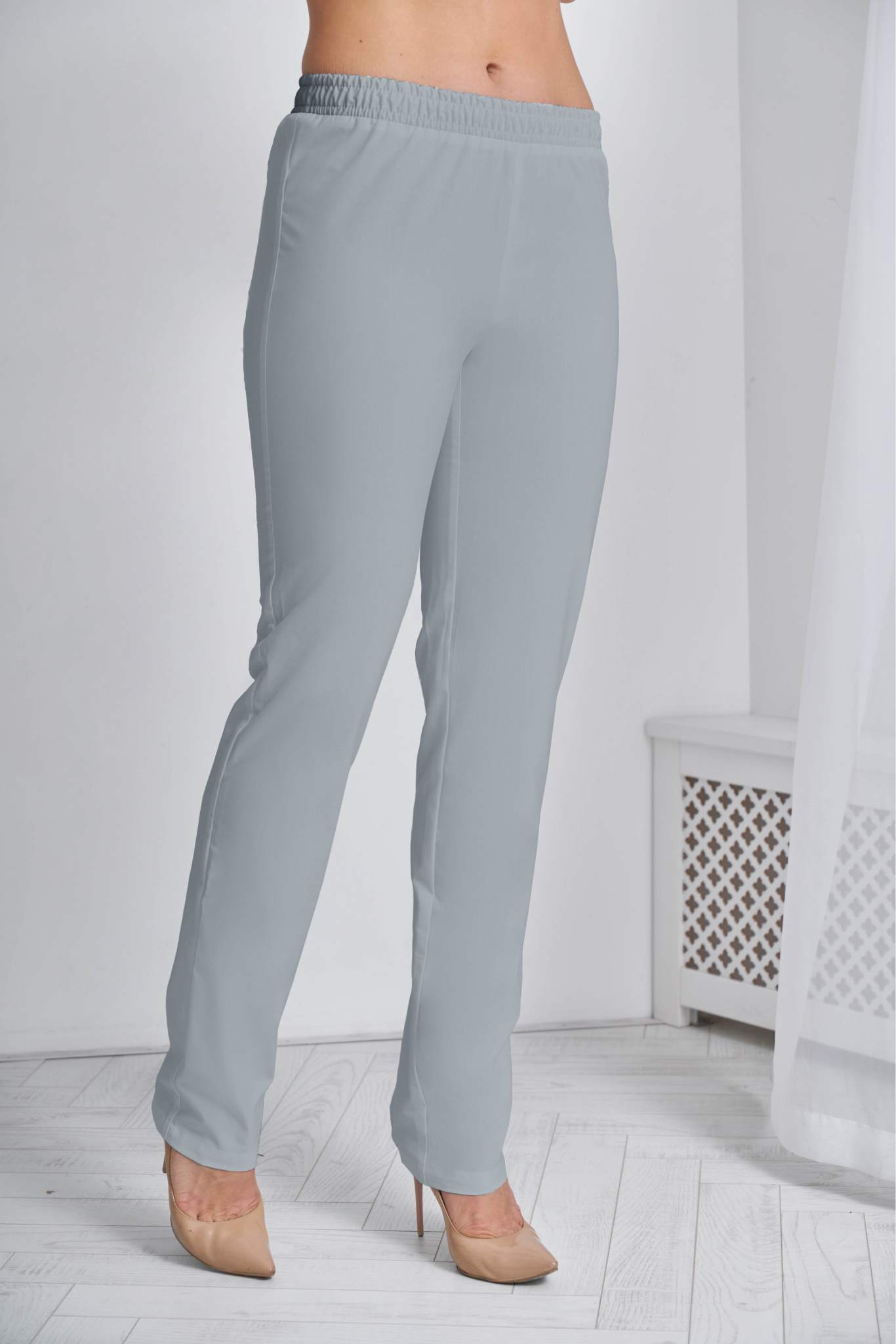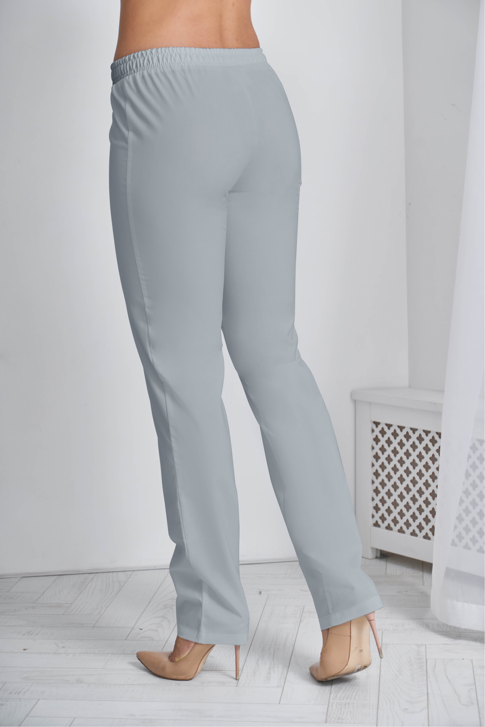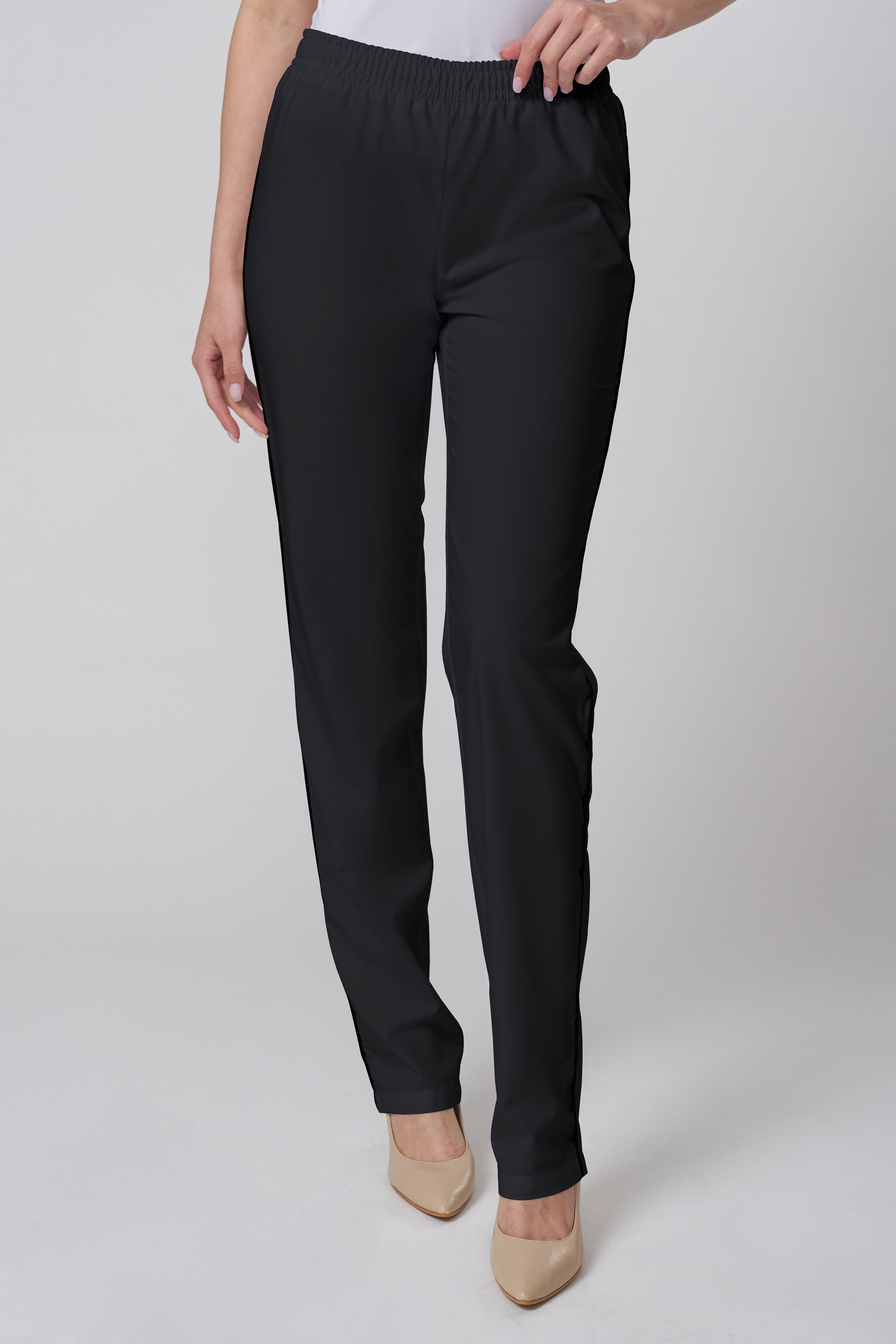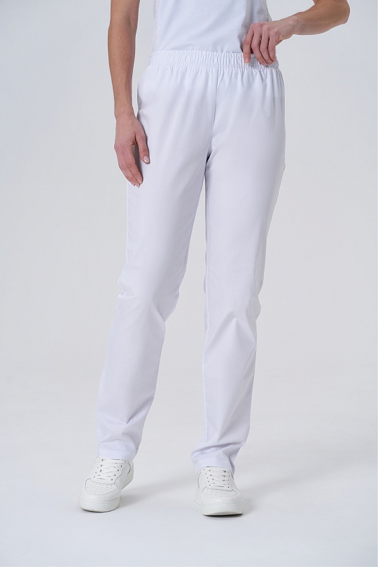 Брюки женские прямого силуэта, с поясом по талии. Пояс брюк с продернутой эластичной резинкой, две строчки, фиксирующие резину проложены на расстоянии 2,0 см друг от друга.