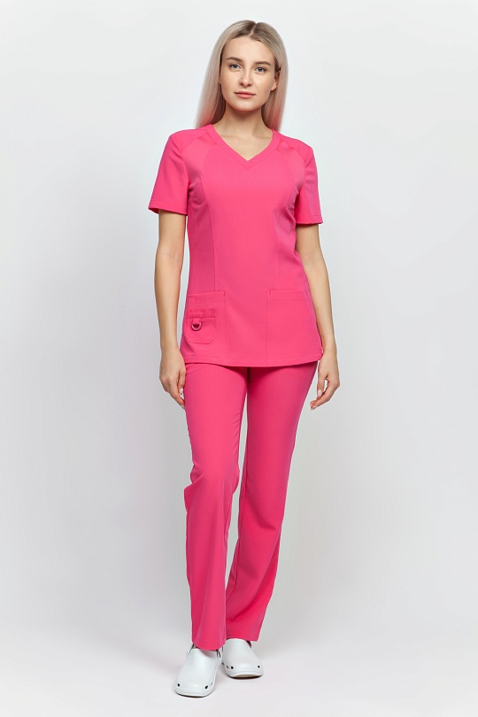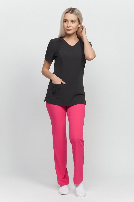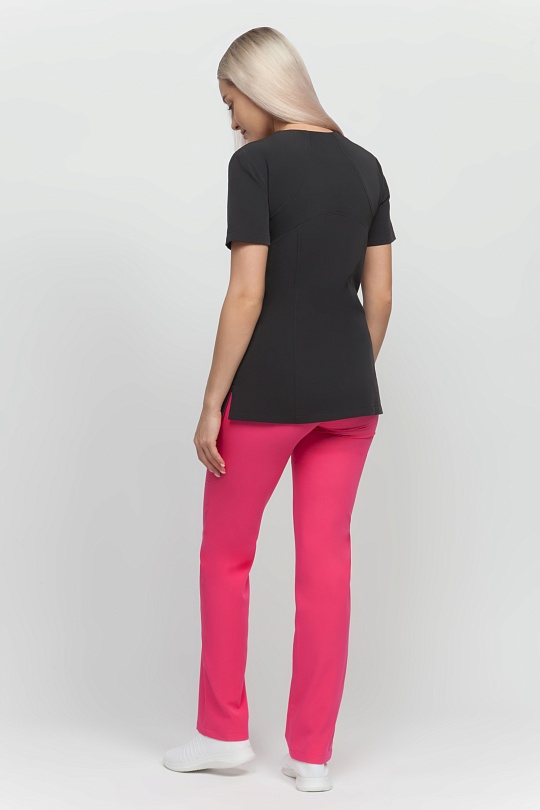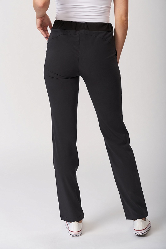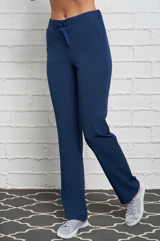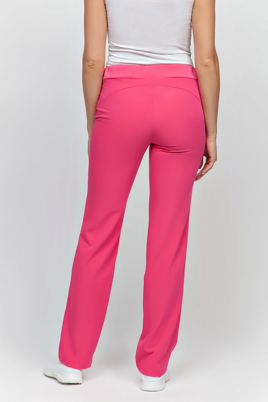 Брюки женские, слегка зауженные к низу, с при тачным поясом, состоящим из двух частей: задней из интерлока с резинкой и передней подкройной с тесьмой, регулирующей объем по талии. На передних половинках боковые карманы с кантом по шву от пояса до бокового шва . На задних половинках фигурные кокетки от среднего шва до бокового.
