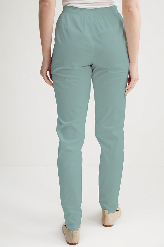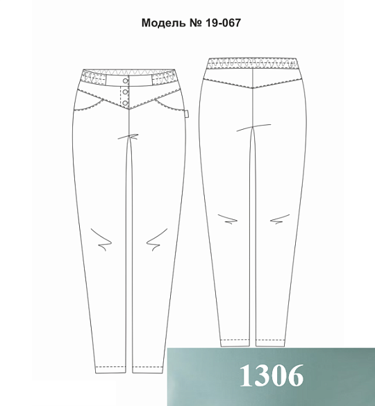 Брюки женские на притачном поясе, зауженные к низу. Передние половинки брюк с имитацией застежки на 3 кнопки, с наклонными притачными кокетками и боковыми карманами с фигурным входом от шва кокетки до бокового шва. Задние половинки брюк с наклонными притачными кокетками. Пояс притачной с надставком по переду, продернутой эластичной резиной, фиксированной тремя строчками. Низ брюк обработан швом в подгибку с закрытым срезом.
