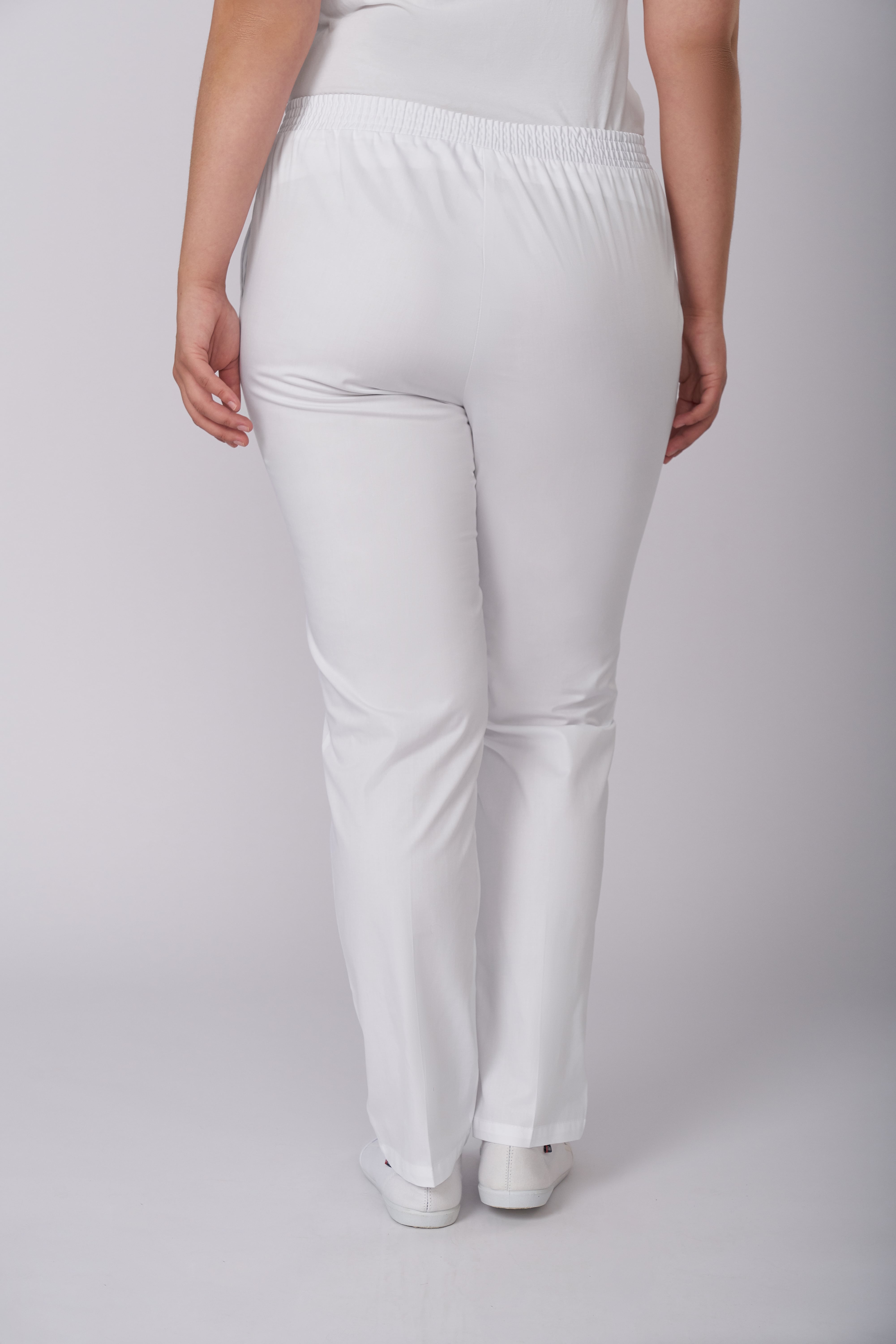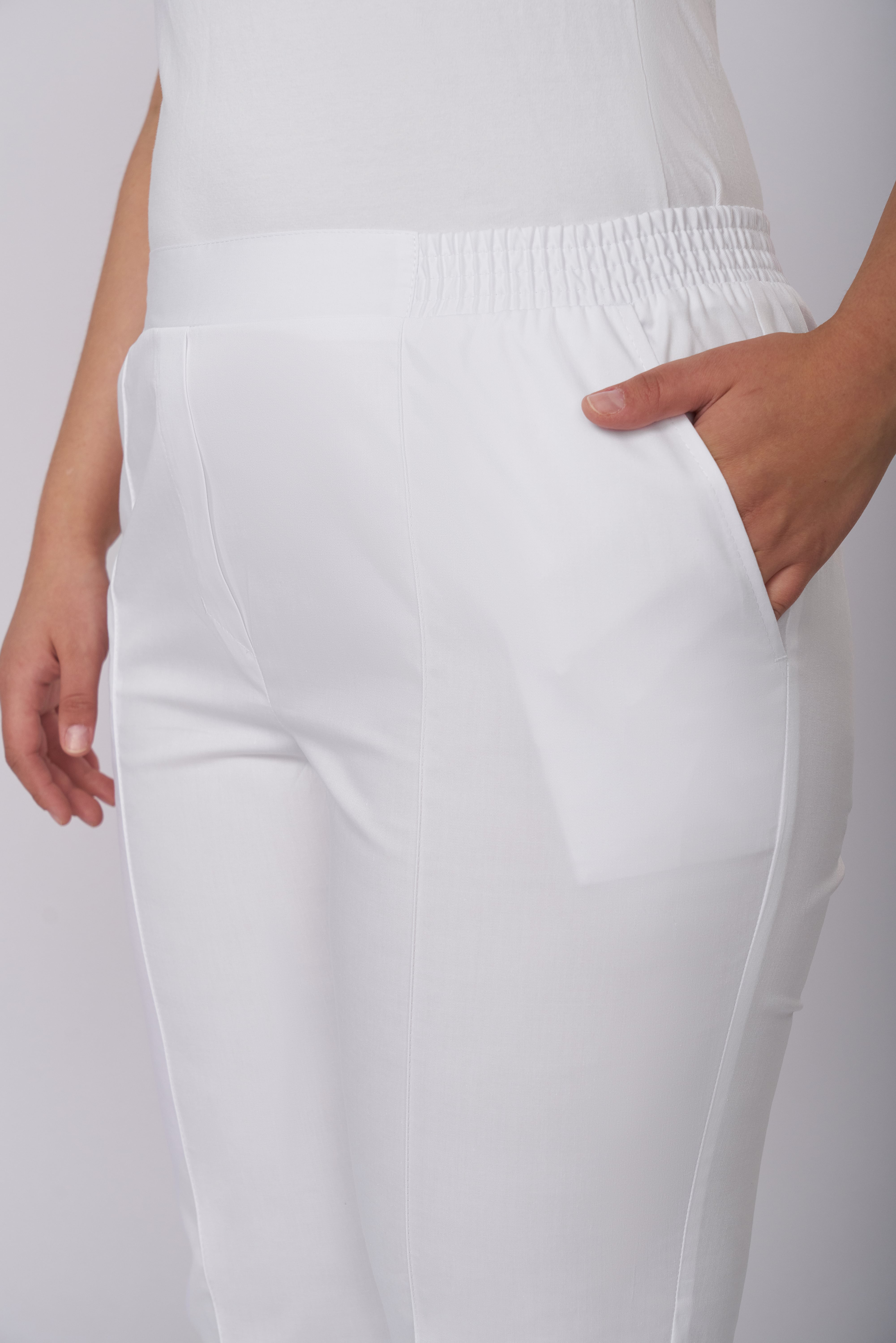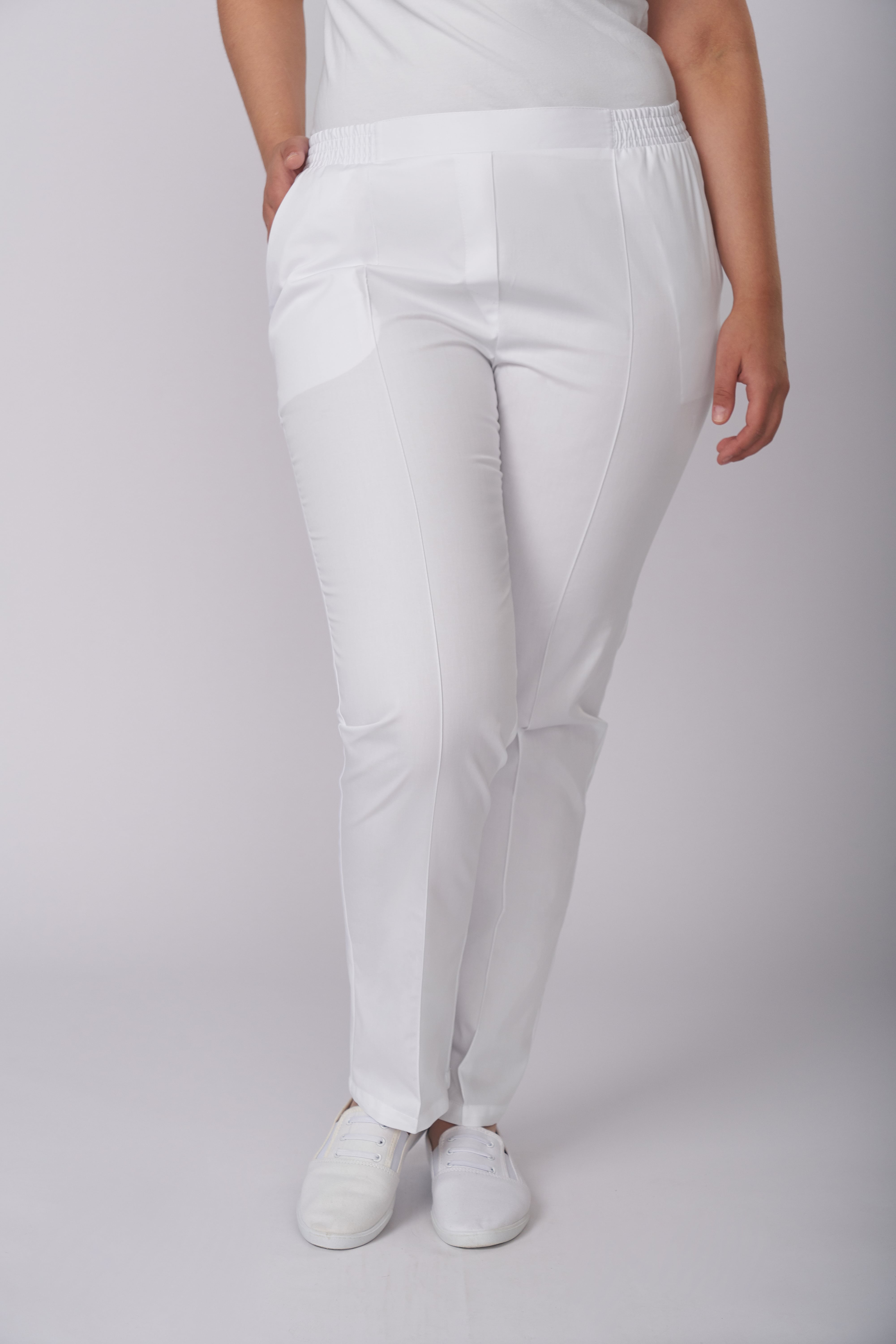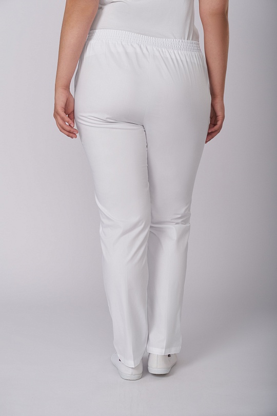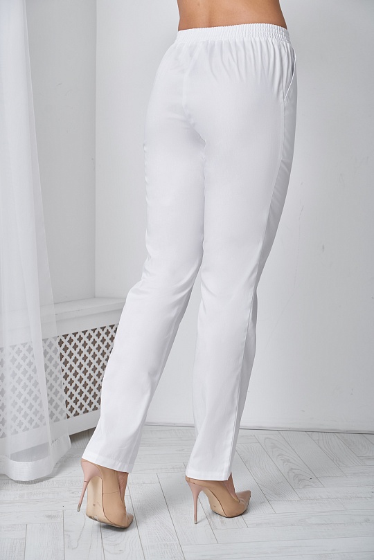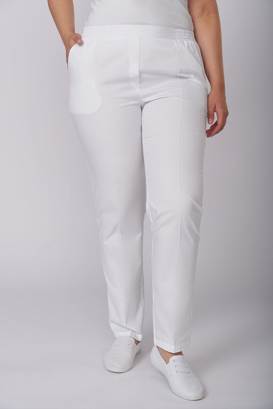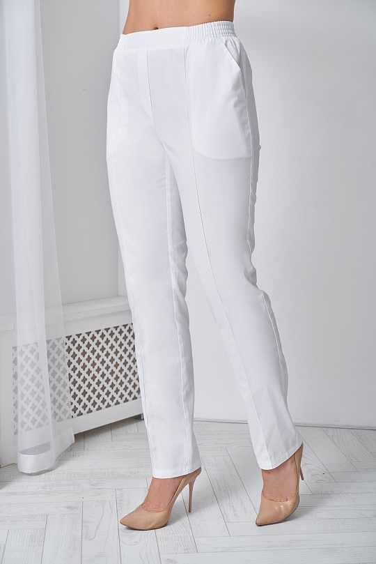 Брюки женские , слегка зауженные к низу, с притачным поясом, имитация застёжки «гульфик», застроченными «стрелками» на передних половинках, карманы под наклоном от пояса до бока. Пояс с эластичной резиной, по середине вставка