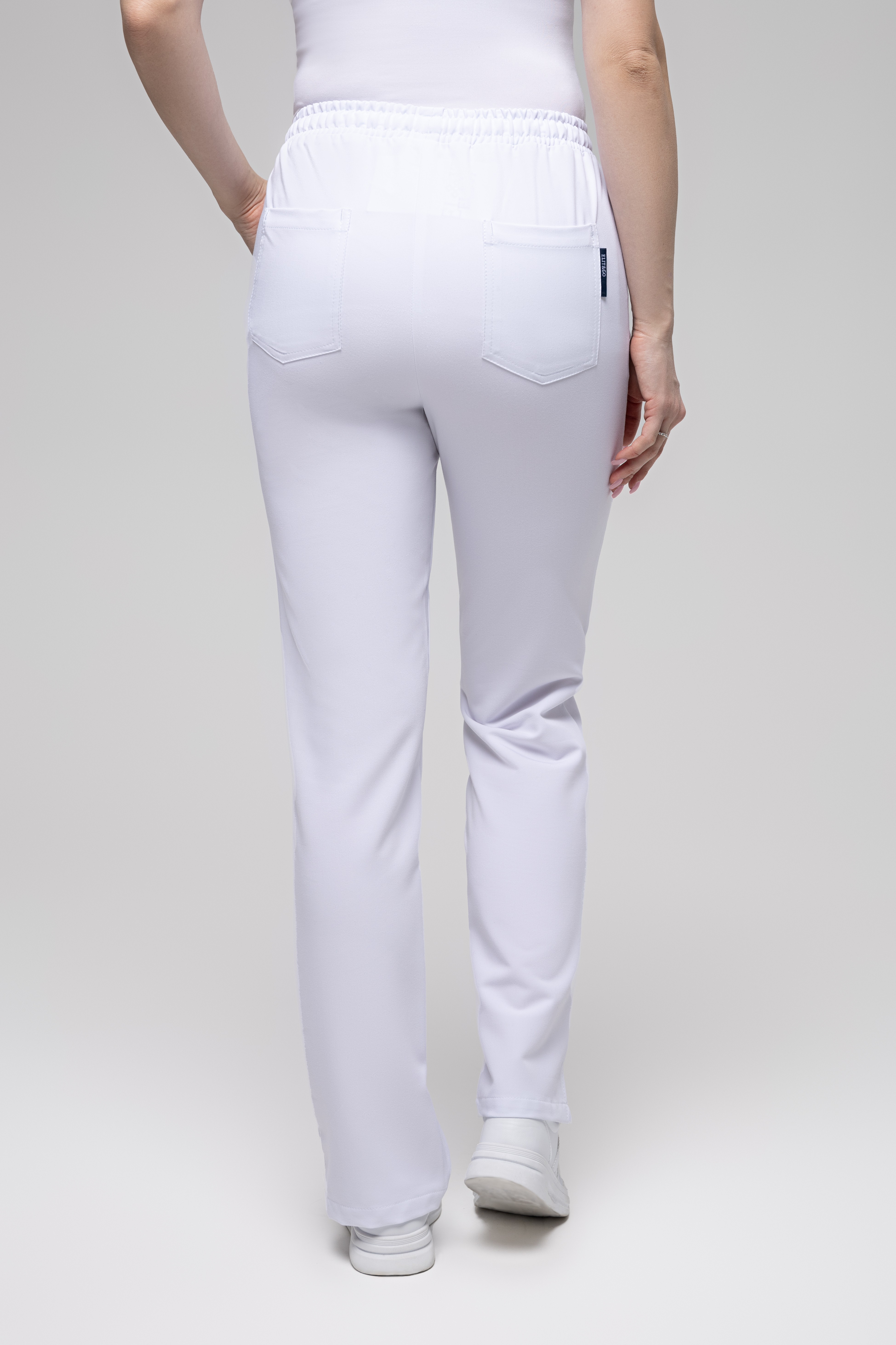 Брюки женские, прямые, на притачной поясе с эластичной тесьмой, с боковыми карманами. На задних половинках накладные карманы, по низу разрезы в боковых швах