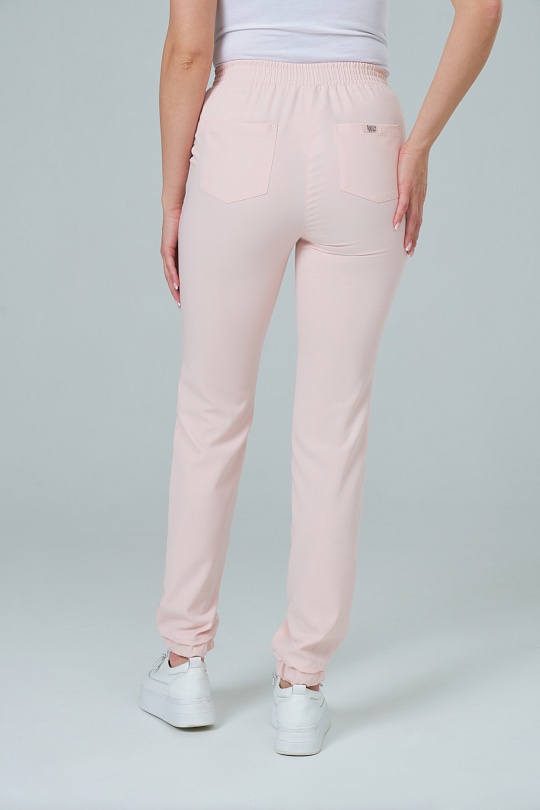Брюки женские, зауженные к низу, с отрезным поясом и вставкой, объем пояса регулирует продернутая эластичная тесьма, отрезными манжетами по низу регулируемые продернутой эластичной тесьмой. Передние половинки с боковыми карманами от пояса до боковых швов, с правом нижним накладным карманом. Задние половинки с настрочеными накладными карманами на уровне бедер