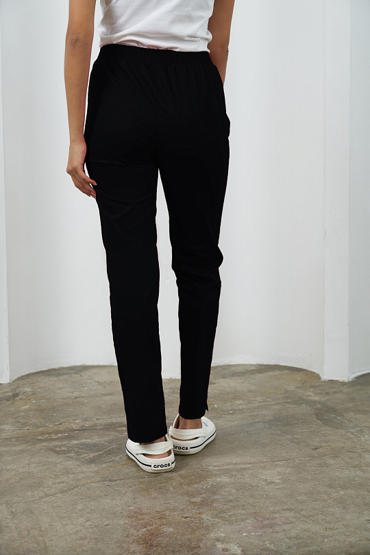 Брюки женские, зауженные к низу, на притачном поясе со вставкой посередине и с продернутой эластичной резиной. Брюки с разрезами в боковых швах. На задних половинках брюк накладные карманы.