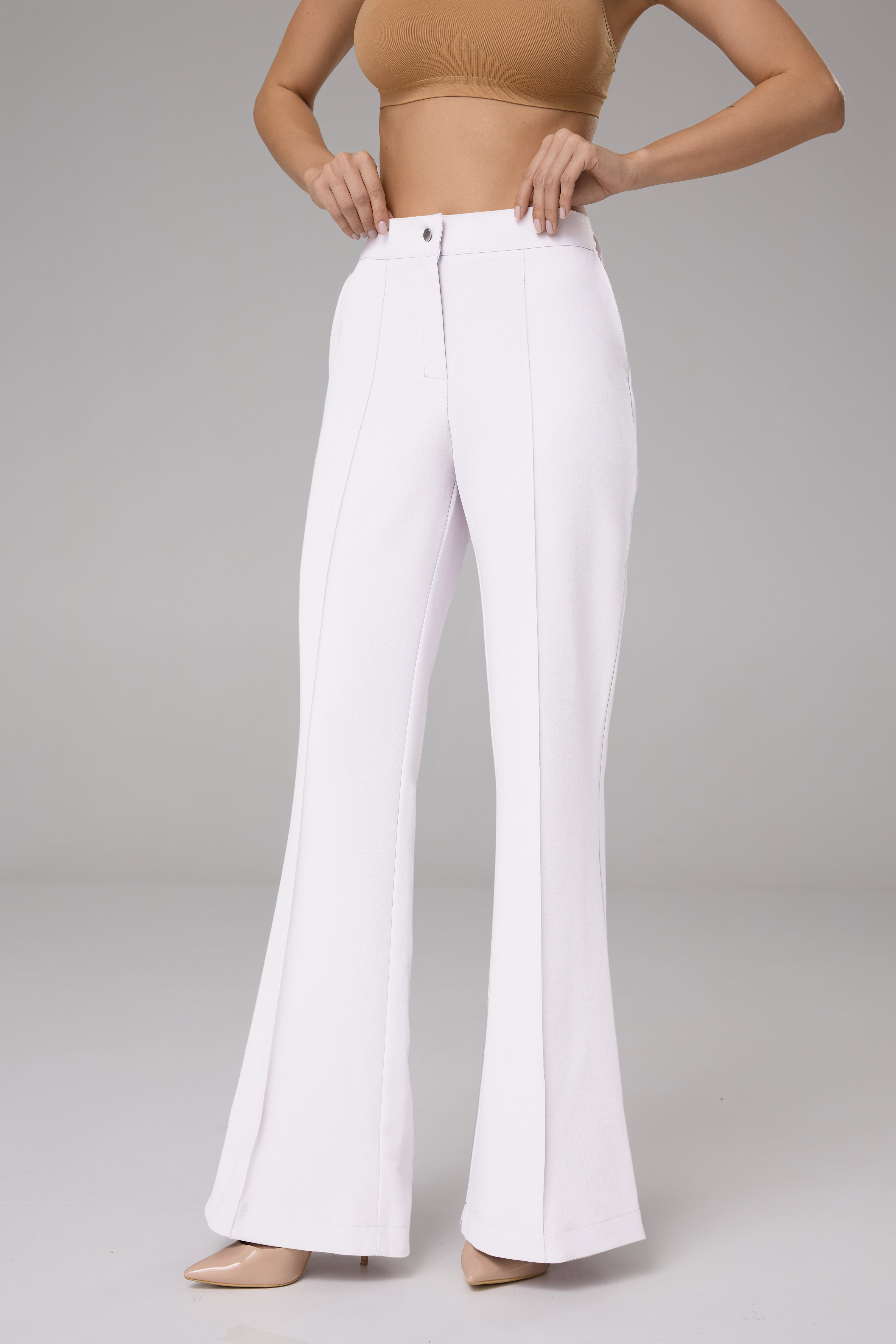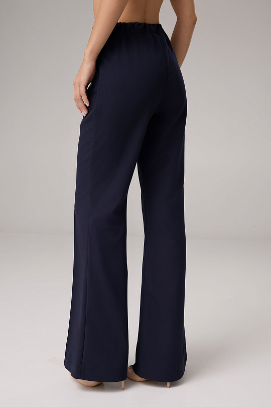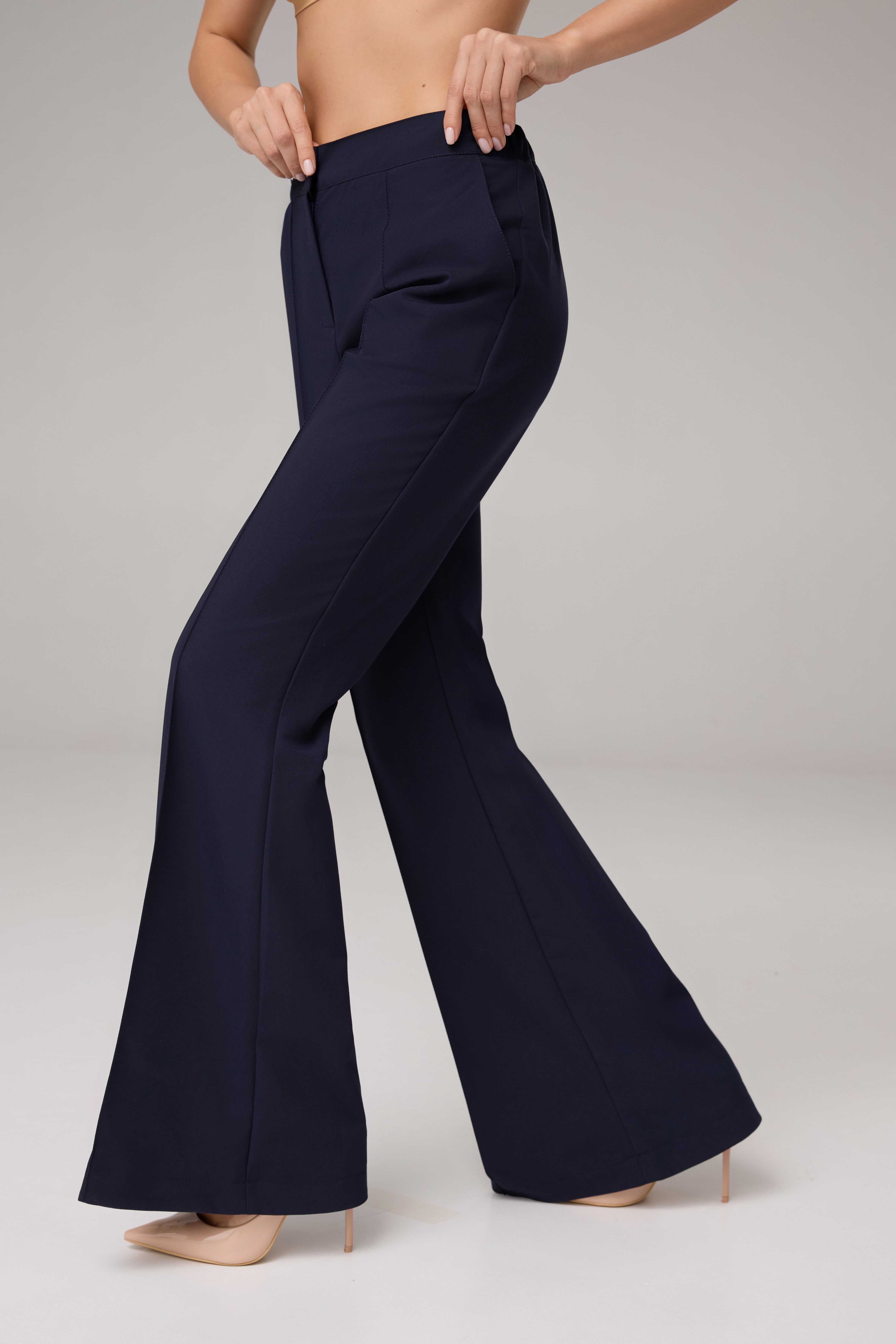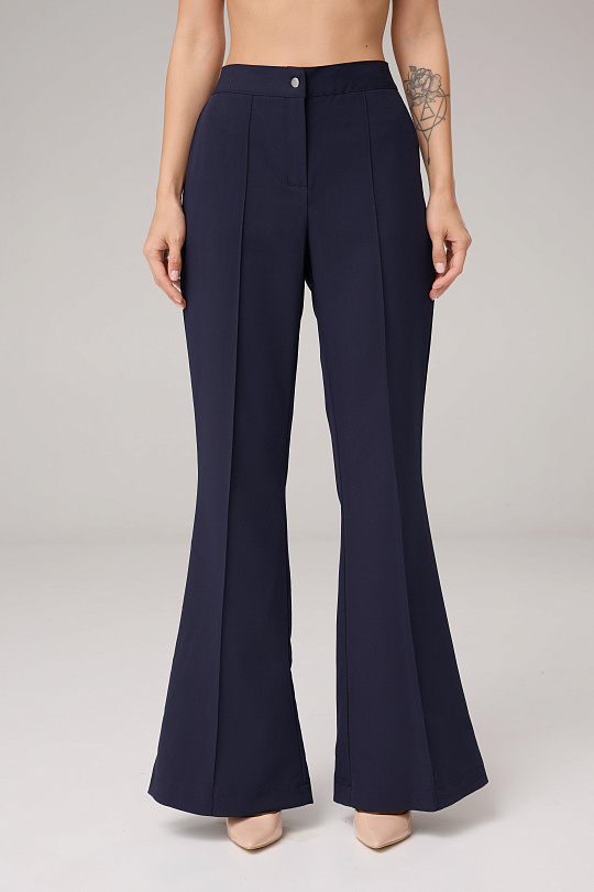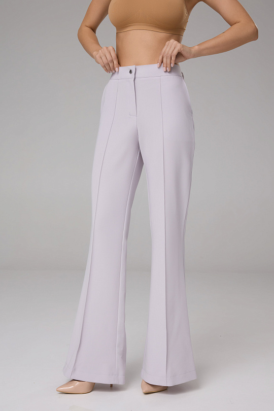 Брюки женские на поясе, с застежкой на молнию, расклешенные от колена до низа Передние половинки брюк с застроченные стрелками, с внутренними карманами с наклонным входом от пояса до бокового шва. Пояс притачной, застегивающийся на петлю и пуговицу, с продернутой эластичной тесьмой по задней части. По низу брюки обработаны обтачкой с фиксированной строчкой на 3см от низа По поясу и входу в карман проложена отделочная строчка