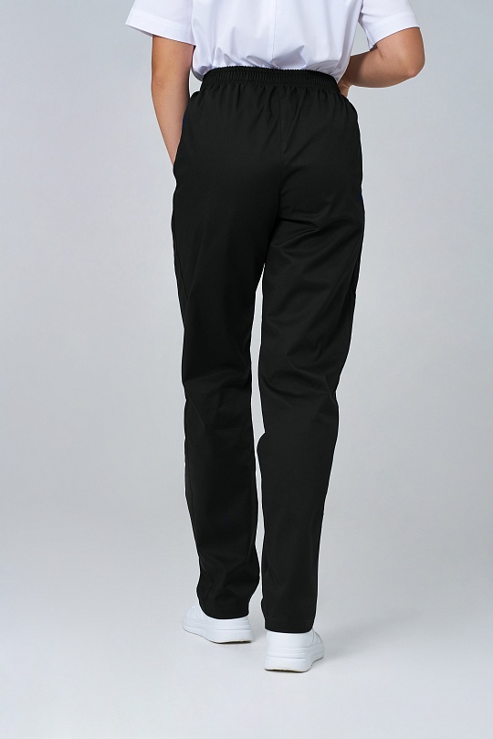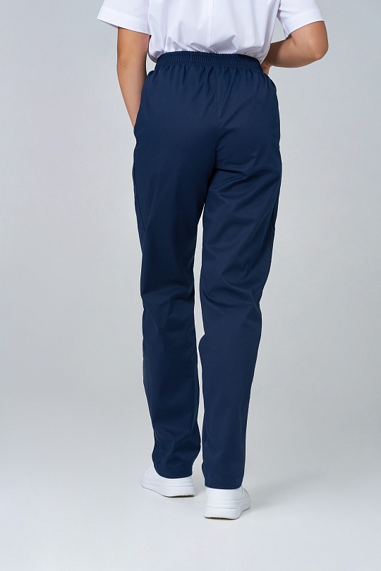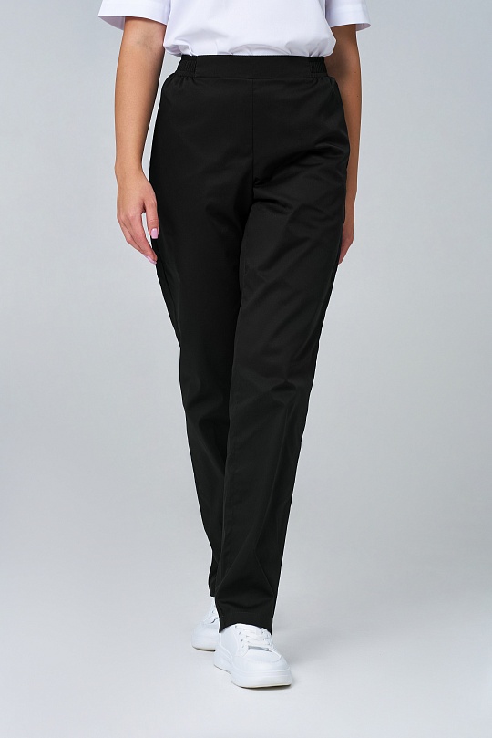 Брюки женские, чуть зауженные к низу, с отрезным притачным поясом с продернутой эластичной тесьмой. Брюки с лампасом в боковом шве.