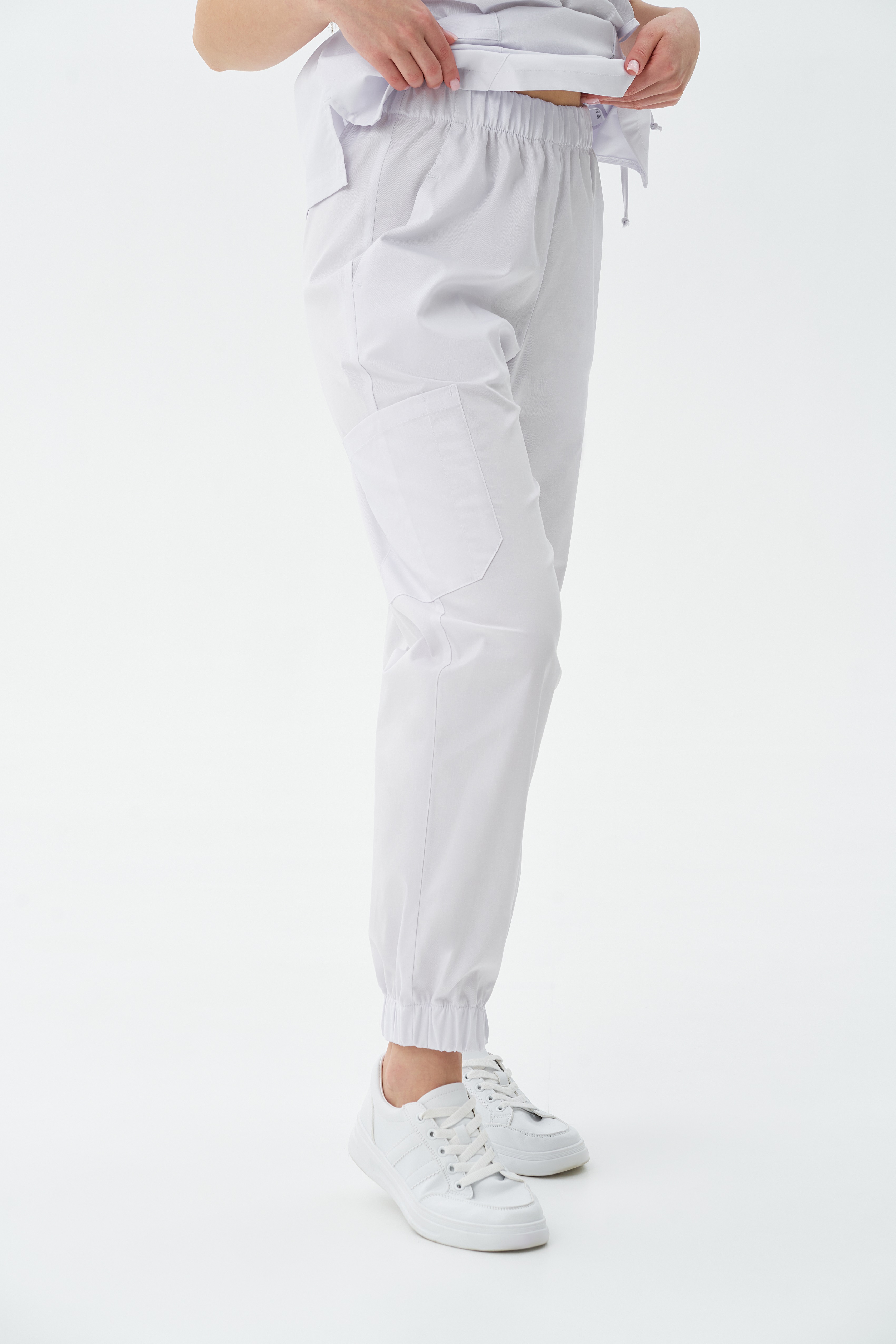Брюки женские ,зауженные к низу ,с цельнокройным поясом с эластичной тесьмой ,без застежки. На передних половинках брюк боковые карманы от талии до бока. По низу брюк цельнокройная манжета с эластичной тесьмой. По правому боку расположен накладной карман фигурной формы