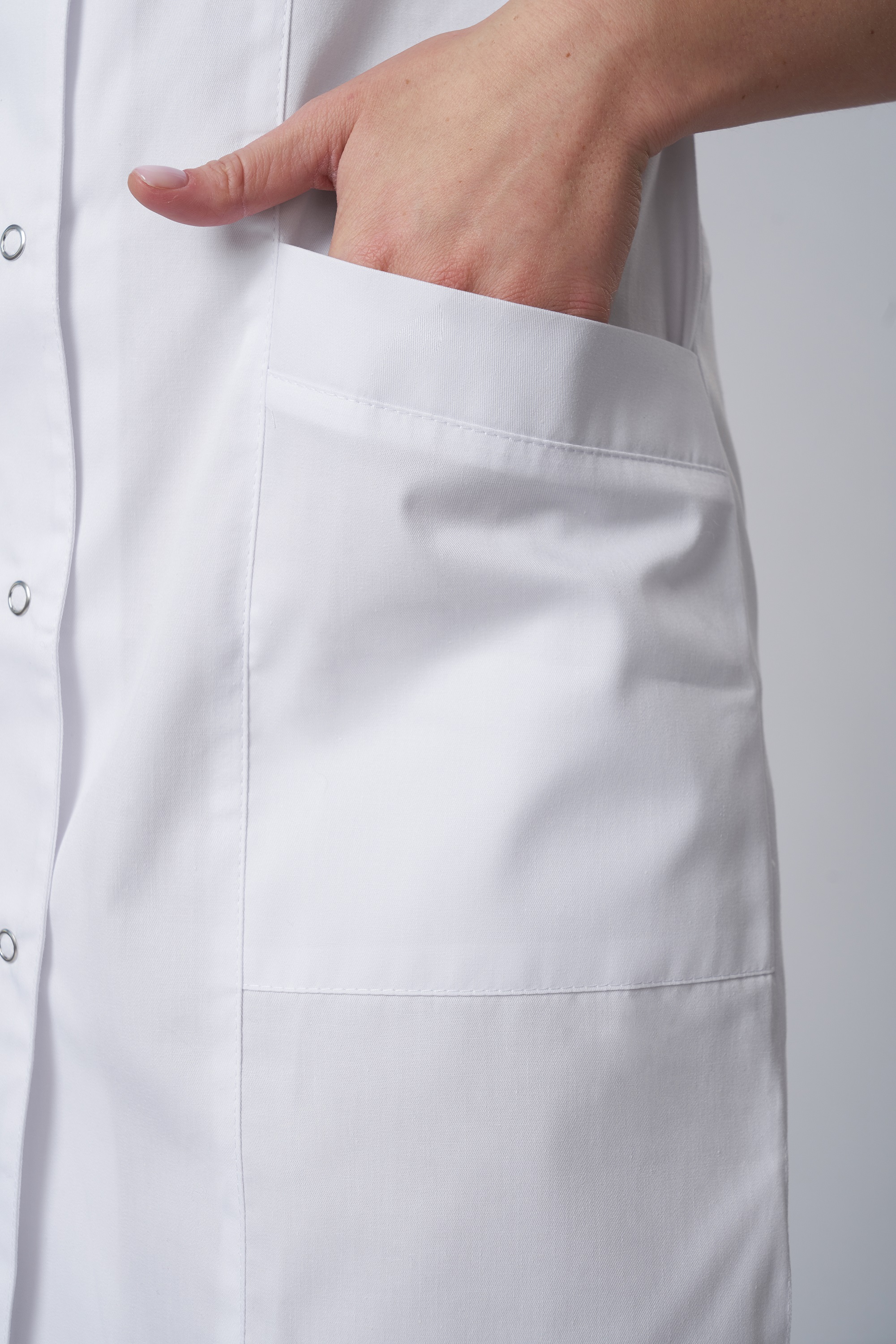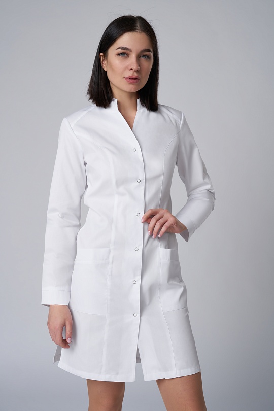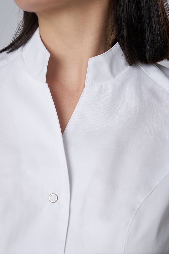 Халат женский укороченный, с застежкой на шесть кнопок, с разрезами в боковых швах. Полочки с рельефами от проймы до низа изделия и с кокетками. Спинка со средним швом и кокетками. По талии хлястики выходящие из боковых швов, застегивающиеся на две кнопки. Воротник втачной-стойка. Рукава втачные, одношовные