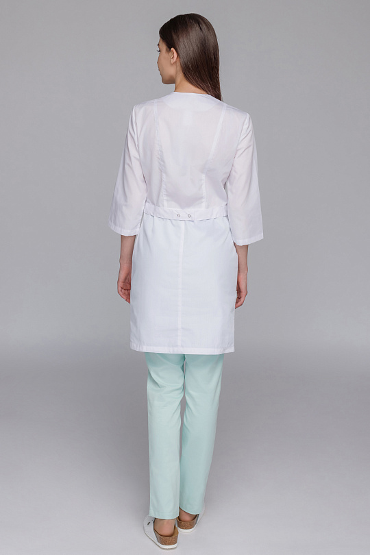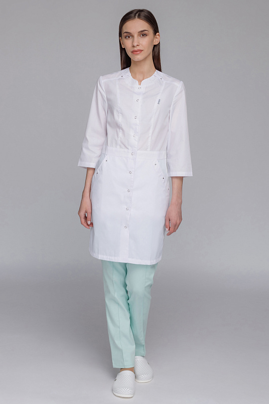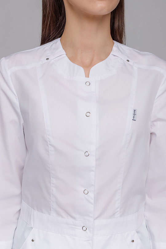 Халат женский укороченный, полуприлегающего силуэта с центральной бортовой застежкой на 9 открытых кнопок; перед: с отрезной кокеткой, отрезной вставкой по линии талии от бокового шва до борта, рельефными швами от кокетки до вставки, двумя нижними боковыми карманами с фигурными планками и металлической фурнитурой; спинка: с отрезной кокеткой, отрезная по линии талии, рельефными швами от кокетки до талии и средним швом по юбке. В боковых швах полупояса, застегивающиеся на две закрытых кнопки; горловина с фигурными планками. На планках расположены шлевки с металлической фурнитурой; рукава — втачные, одношовные