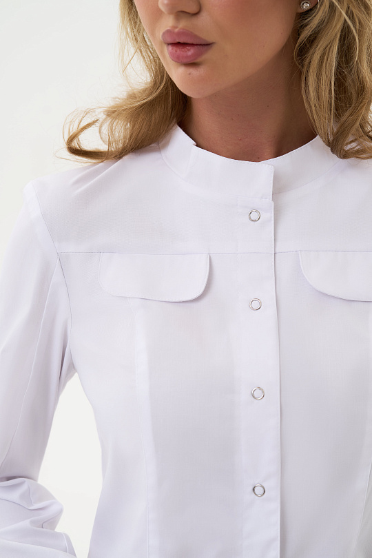 Халат женский, полуприлегающего силуэта, длинной до колен, с разрезами в боковых швах. Перед с центральной бортовой застежкой на 9 кнопок, с отрезной кокеткой, с декоративными клапанами, расположенными в шве кокетки, с рельефами от линии кокетки переходящие в подрез до бокового шва, с боковыми карманами расположенные между рельефами и боковыми швами. Спинка с кокеткой, со средним швом и рельефами от линии кокетки до низа изделия, с хлястиками на талии между рельефами. Воротник втачной стойка. Рукава втачные, двухшовные