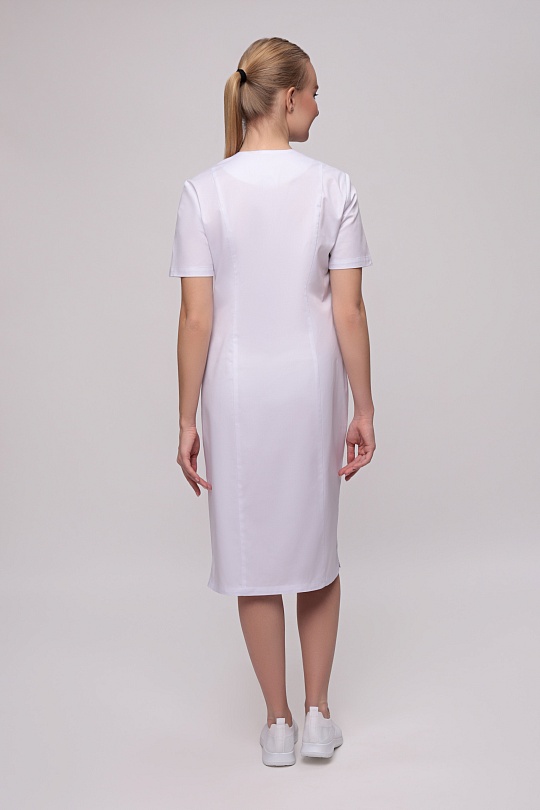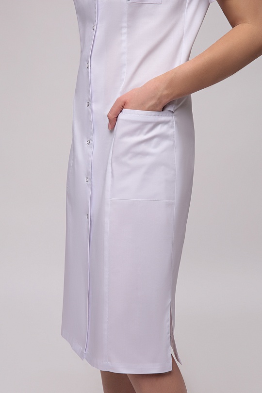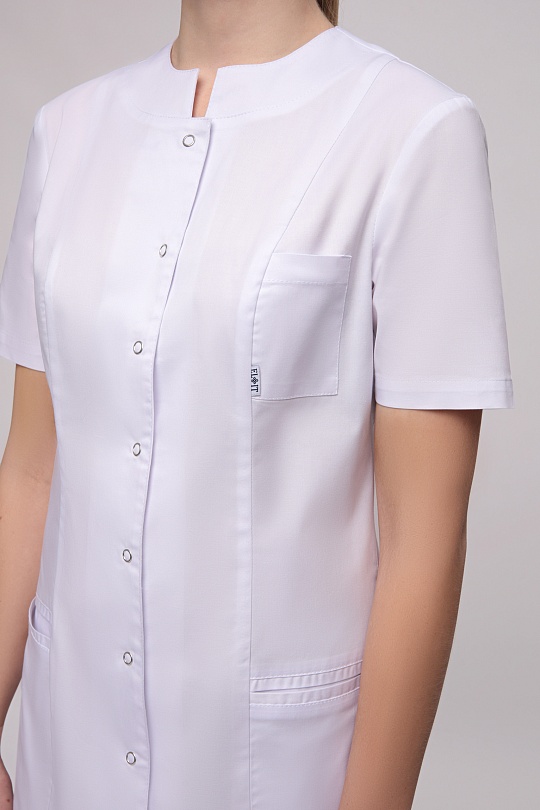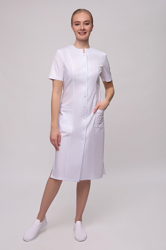 Халат женский полуприлегающего силуэта, с бортовой застежкой на 9 кнопок, с разрезами в боковых швах. Полочки с рельефными швами от проймы до низа, двумя нижними боковыми карманами. Вход карманов обработан отделочными планками. На левой полочке нагрудный карман входящий в рельеф. Спинка с вертикальными рельефными швами от плеча до низа. Горловина обработана фигурными притачными планками; Рукава одношовные, втачные. Низ рукавов обработан притачной манжетой в боковые срезы которой вставлены отделочные детали.
