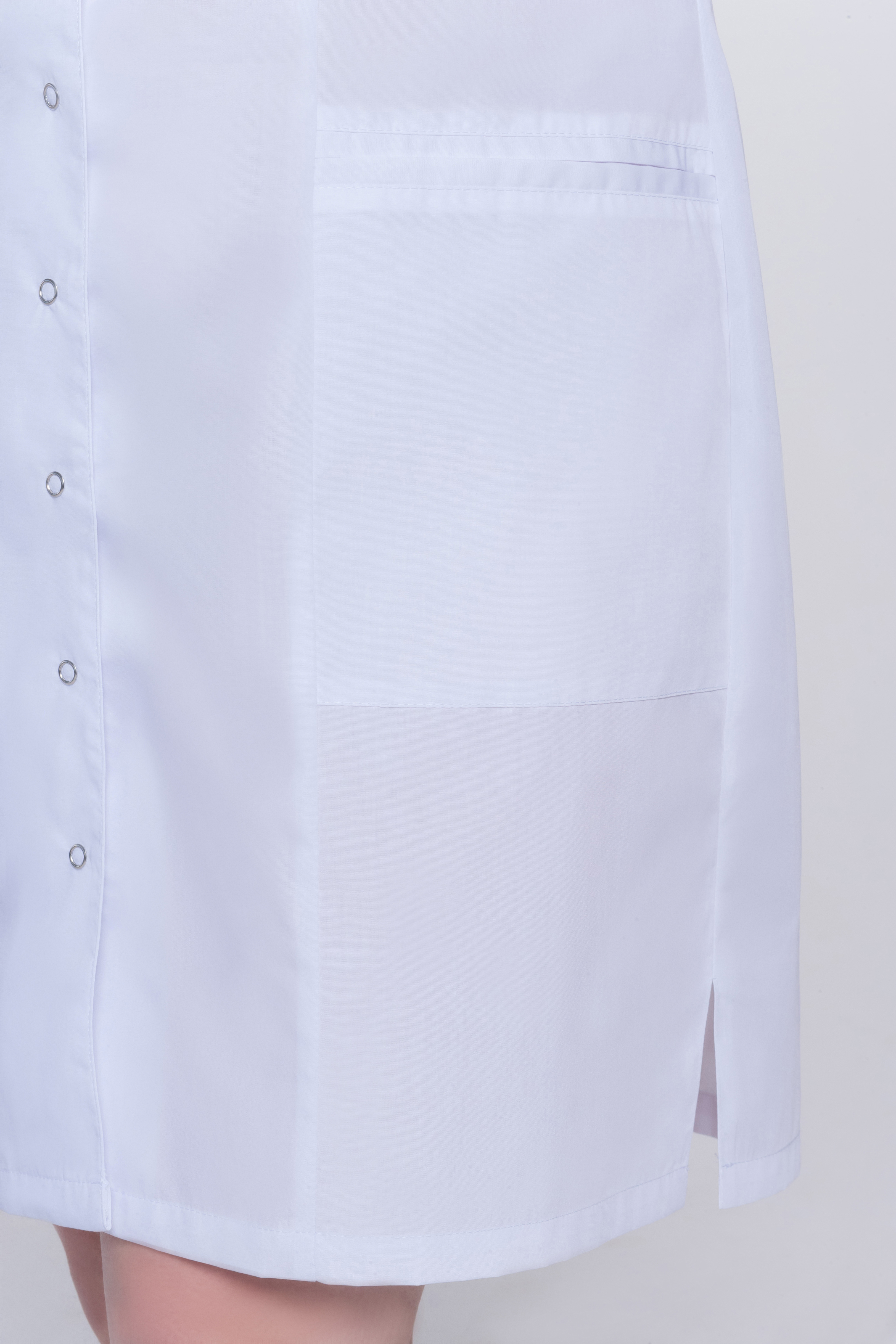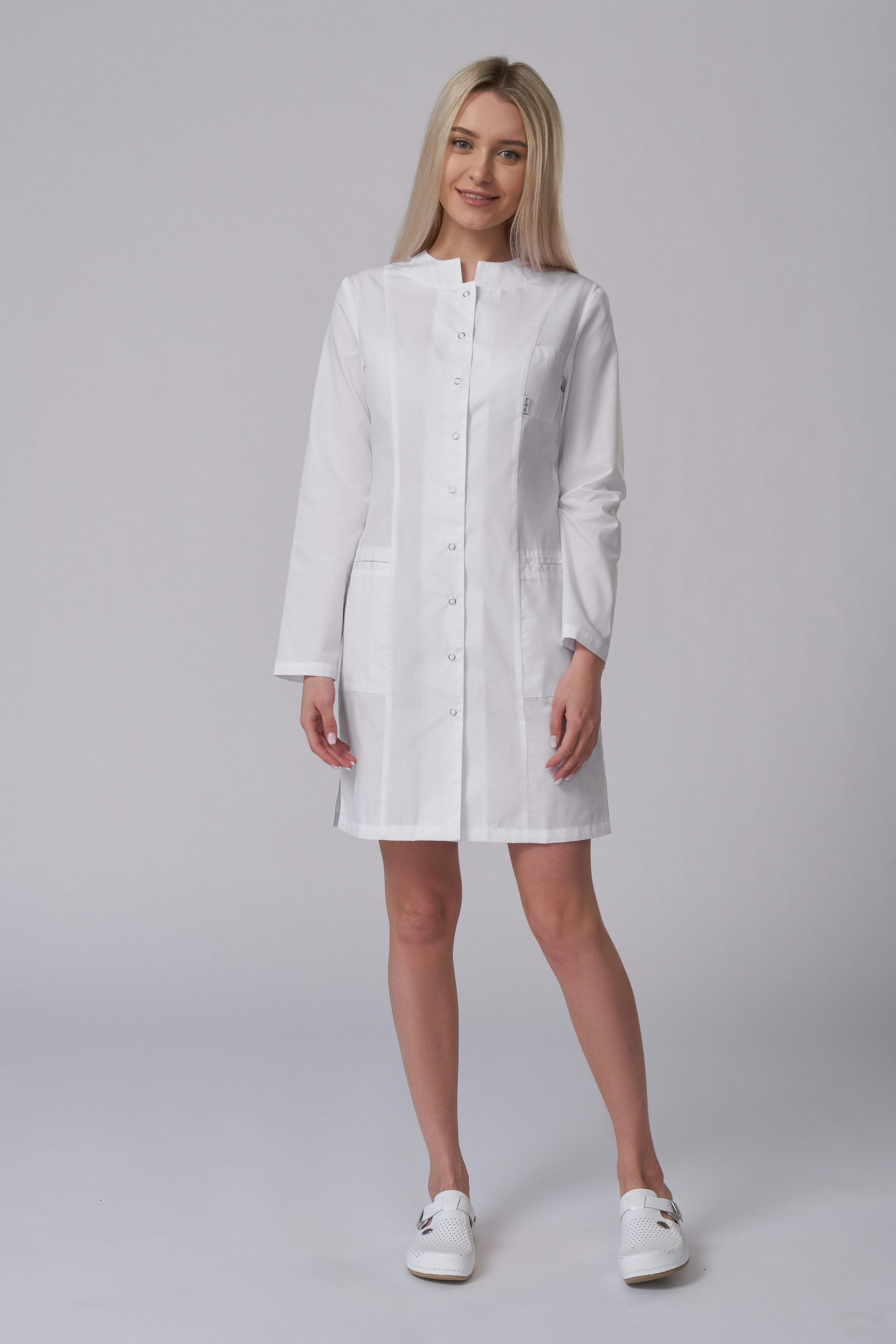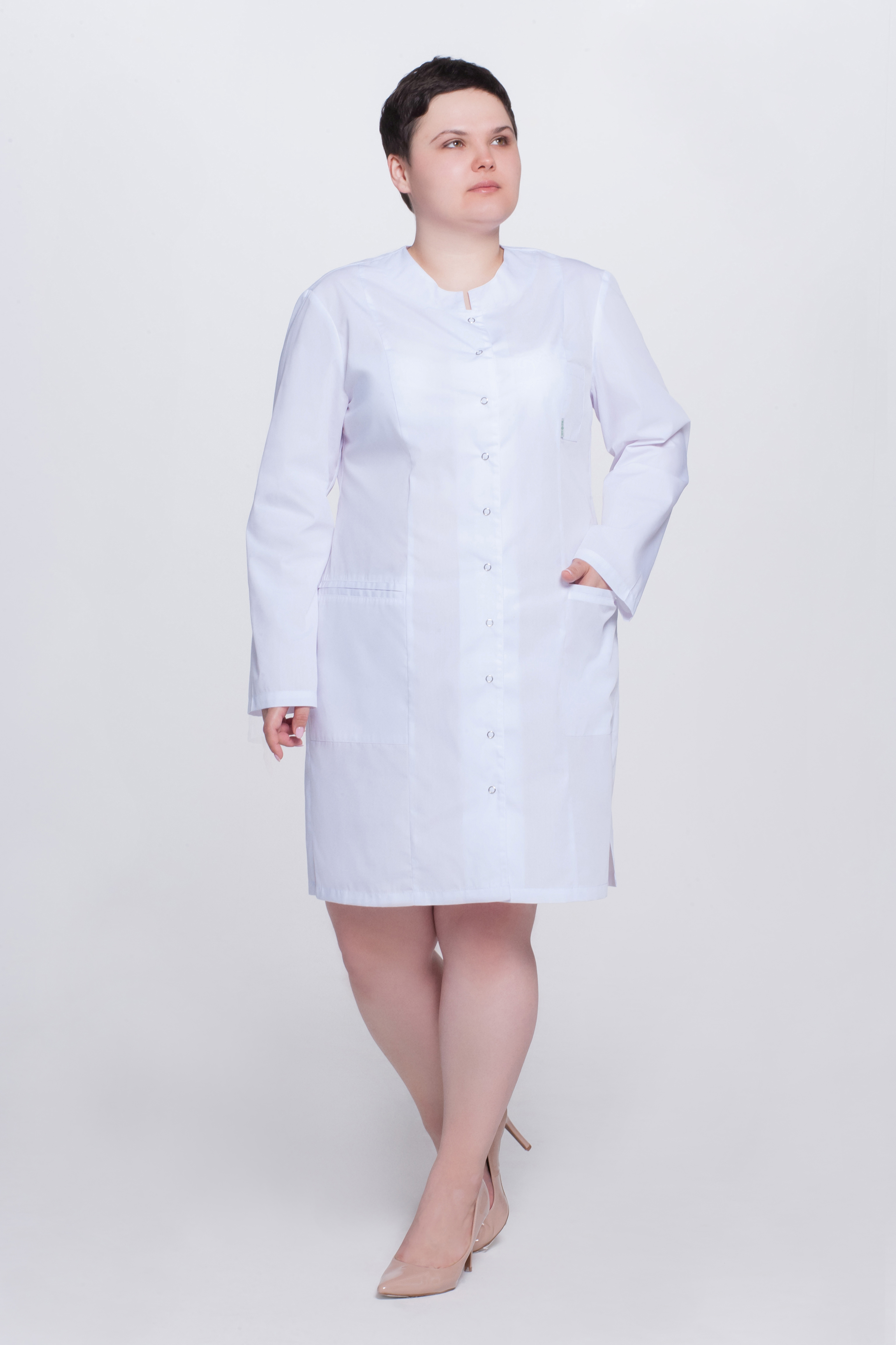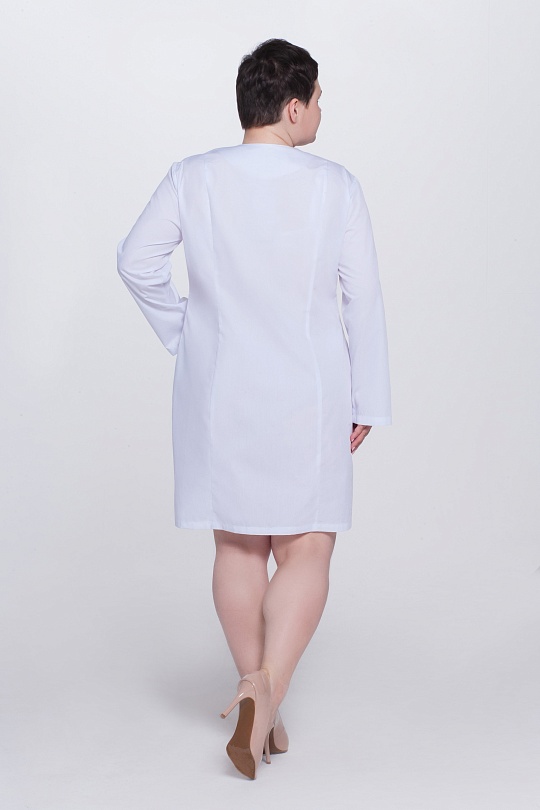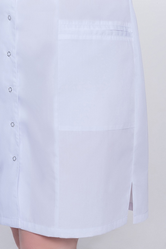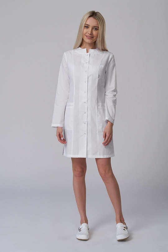 Халат женский укороченный полуприлегающего силуэта, с бортовой застежкой на 9 кнопок, с разрезами в боковых швах. Полочки с рельефными швами от проймы до низа, двумя нижними боковыми карманами. Вход карманов обработан отделочными планками. На левой полочке нагрудный карман входящий в рельеф. Спинка с вертикальными рельефными швами от плеча до низа. Горловина обработана фигурными притачными планками; Рукава одношовные, втачные.