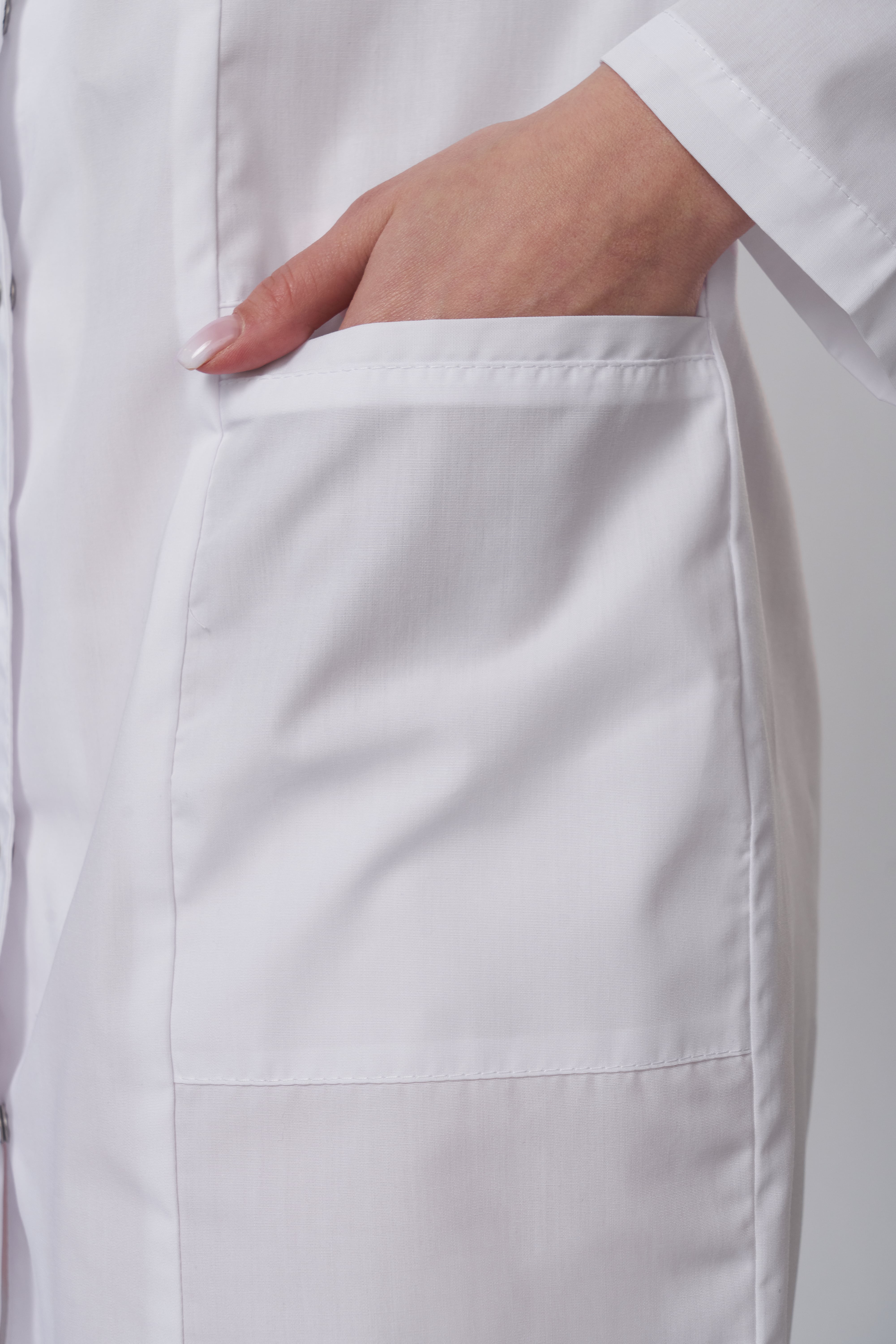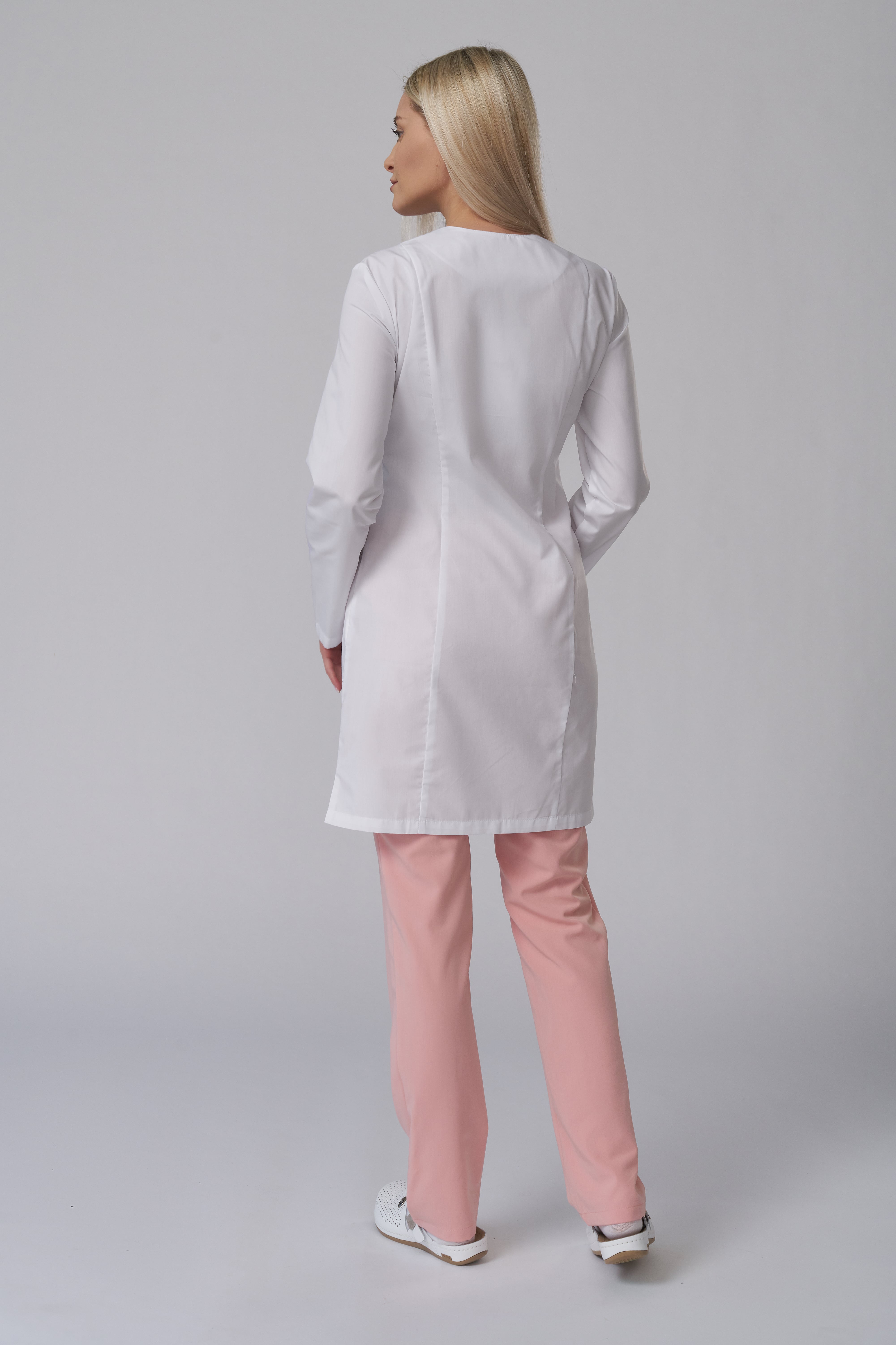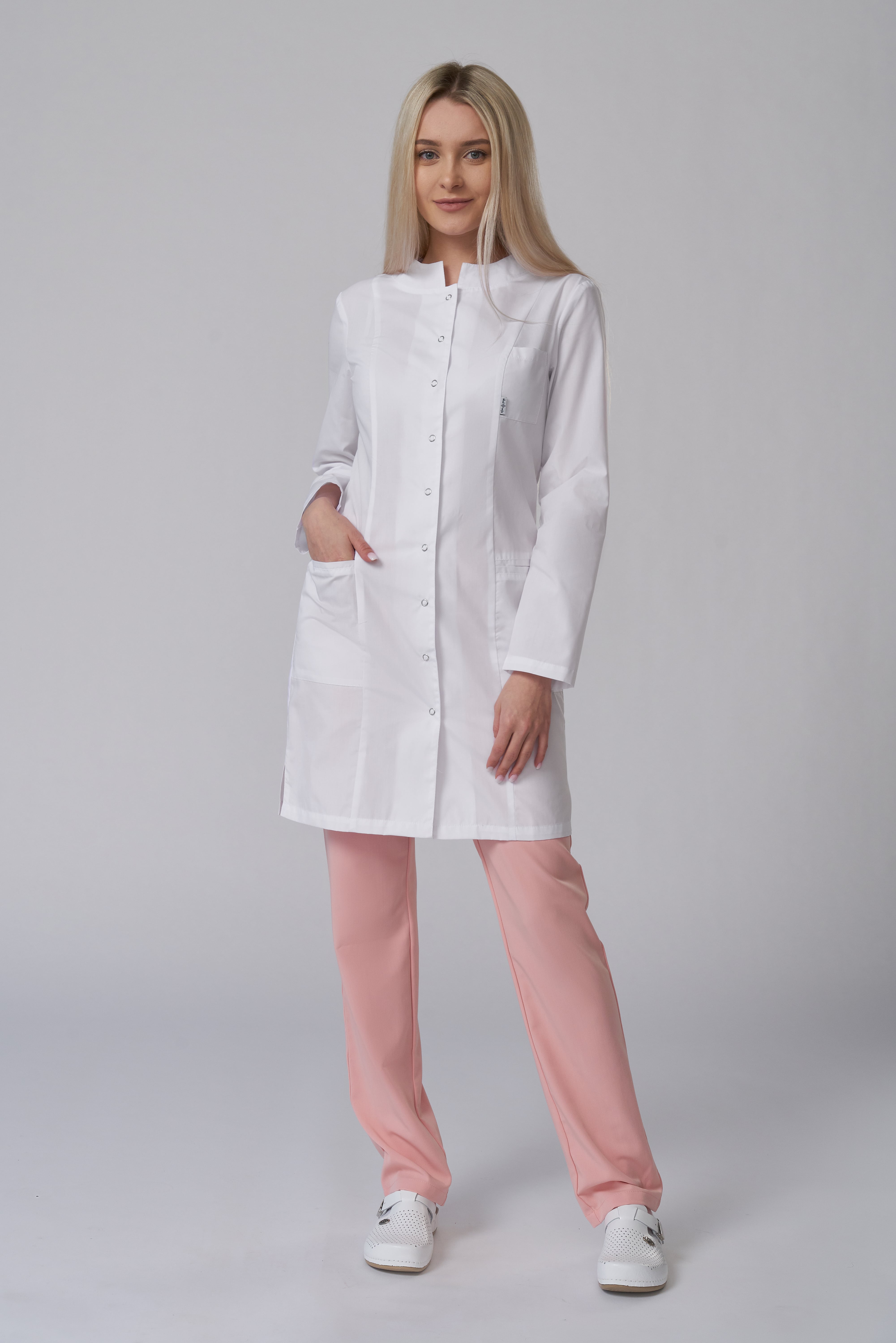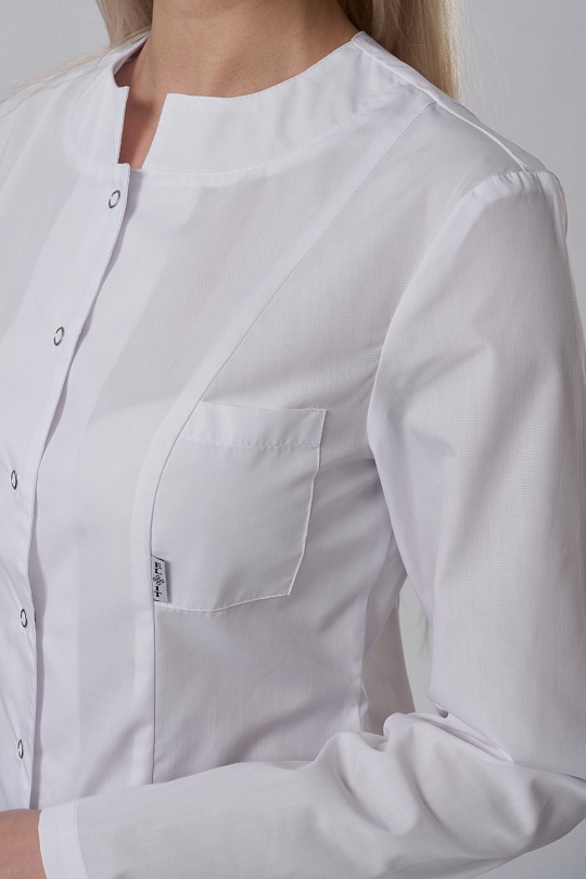 Халат женский укороченный полуприлегающего силуэта, с бортовой застежкой на 9 кнопок, с разрезами в боковых швах. Полочки с рельефными швами от проймы до низа, двумя нижними боковыми карманами. Вход карманов обработан отделочными планками. На левой полочке нагрудный карман входящий в рельеф. Спинка с вертикальными рельефными швами от плеча до низа. Горловина обработана фигурными притачными планками; Рукава одношовные, втачные.