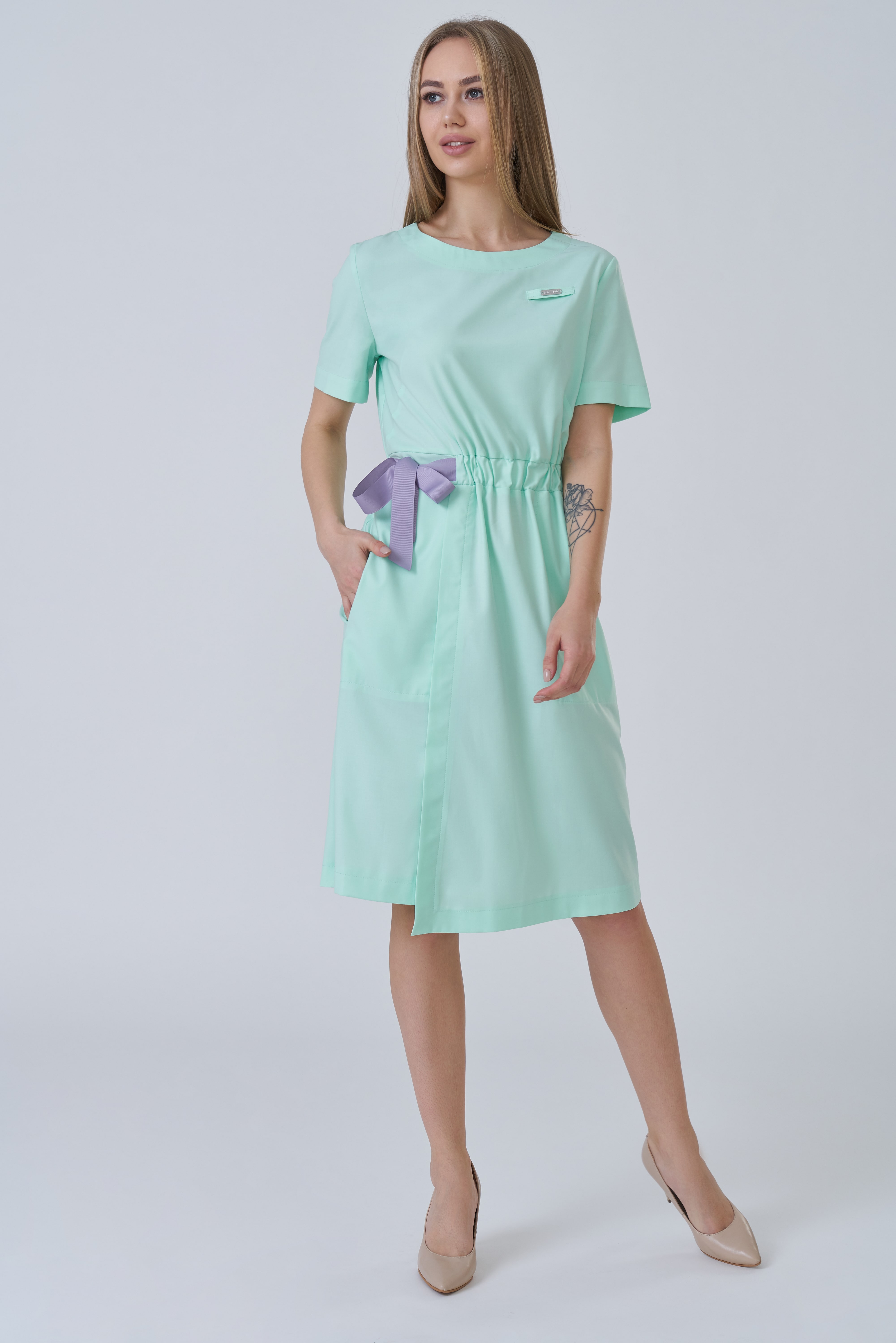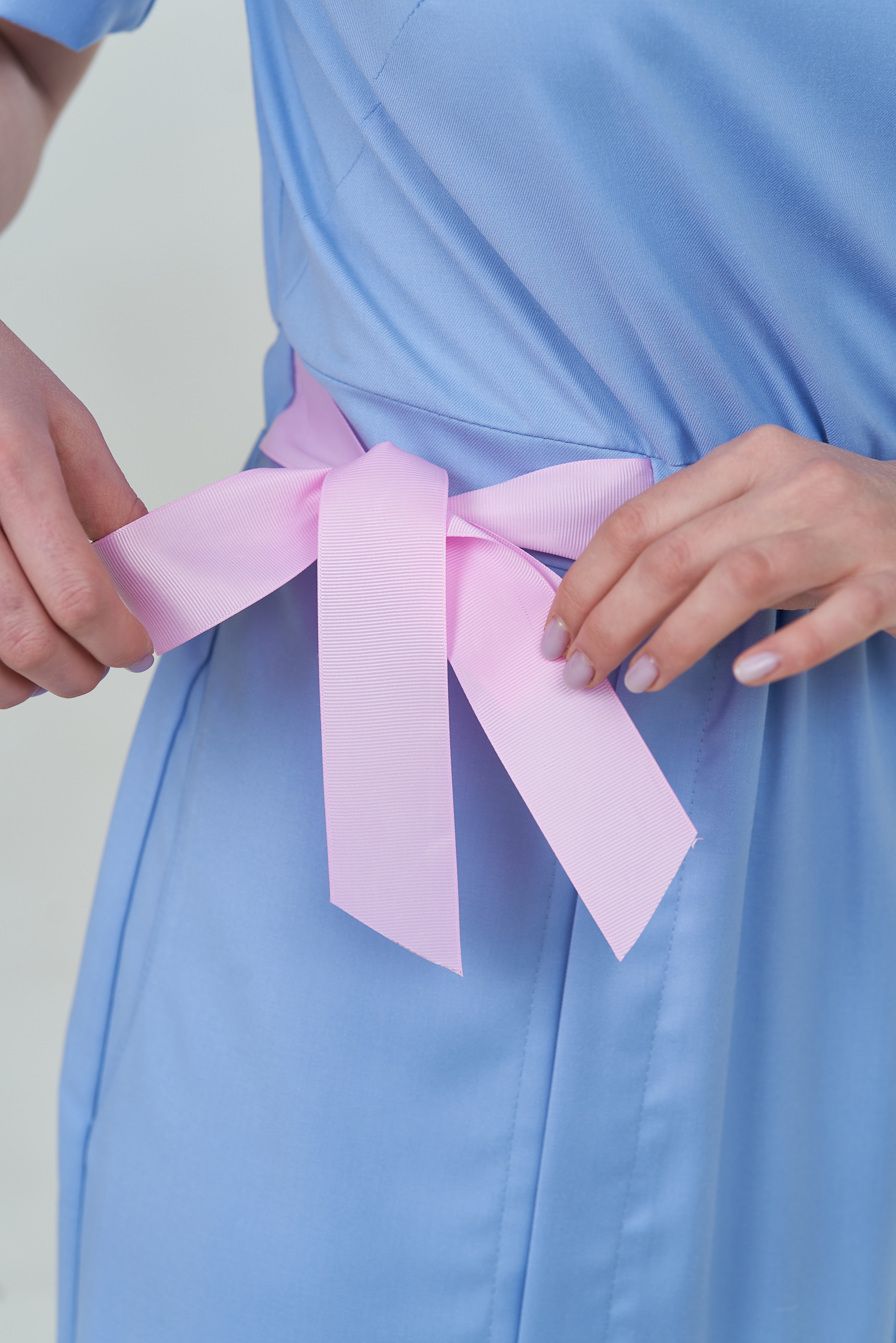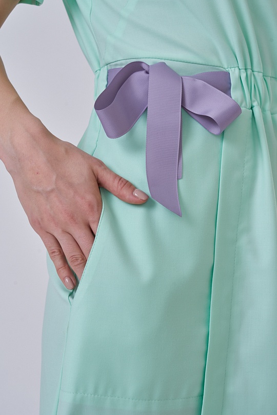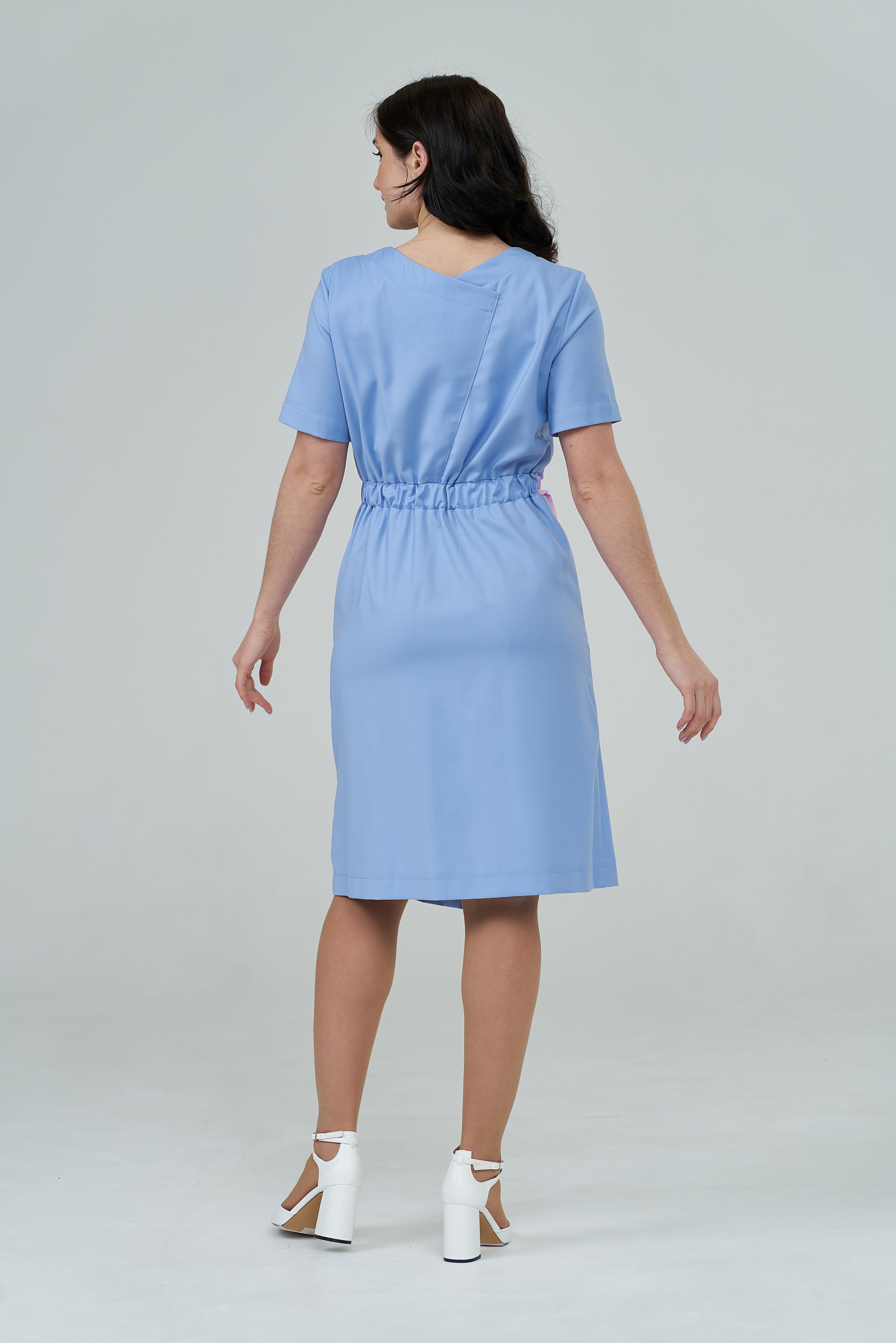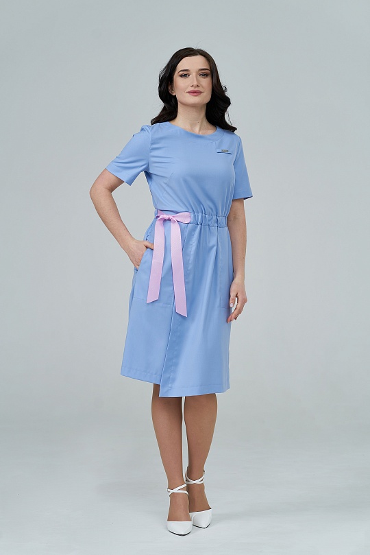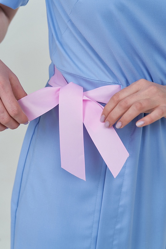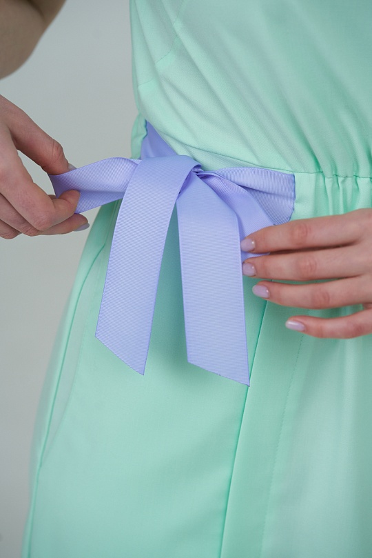 Халат женский, полуприлегающего силуэта, отрезной по линии талии. Верхняя часть полочки с нагрудными выточками, нижняя часть полочки из двух частей с ассиметричным низом и имитацией запаха. Боковые карманы в швах. Спинка верхняя часть ассиметричная. Горловина круглая ,обработана обтачкой. В подрез по талии вставлена резинка и декоративная тесьма. Рукава втачные, одношовные