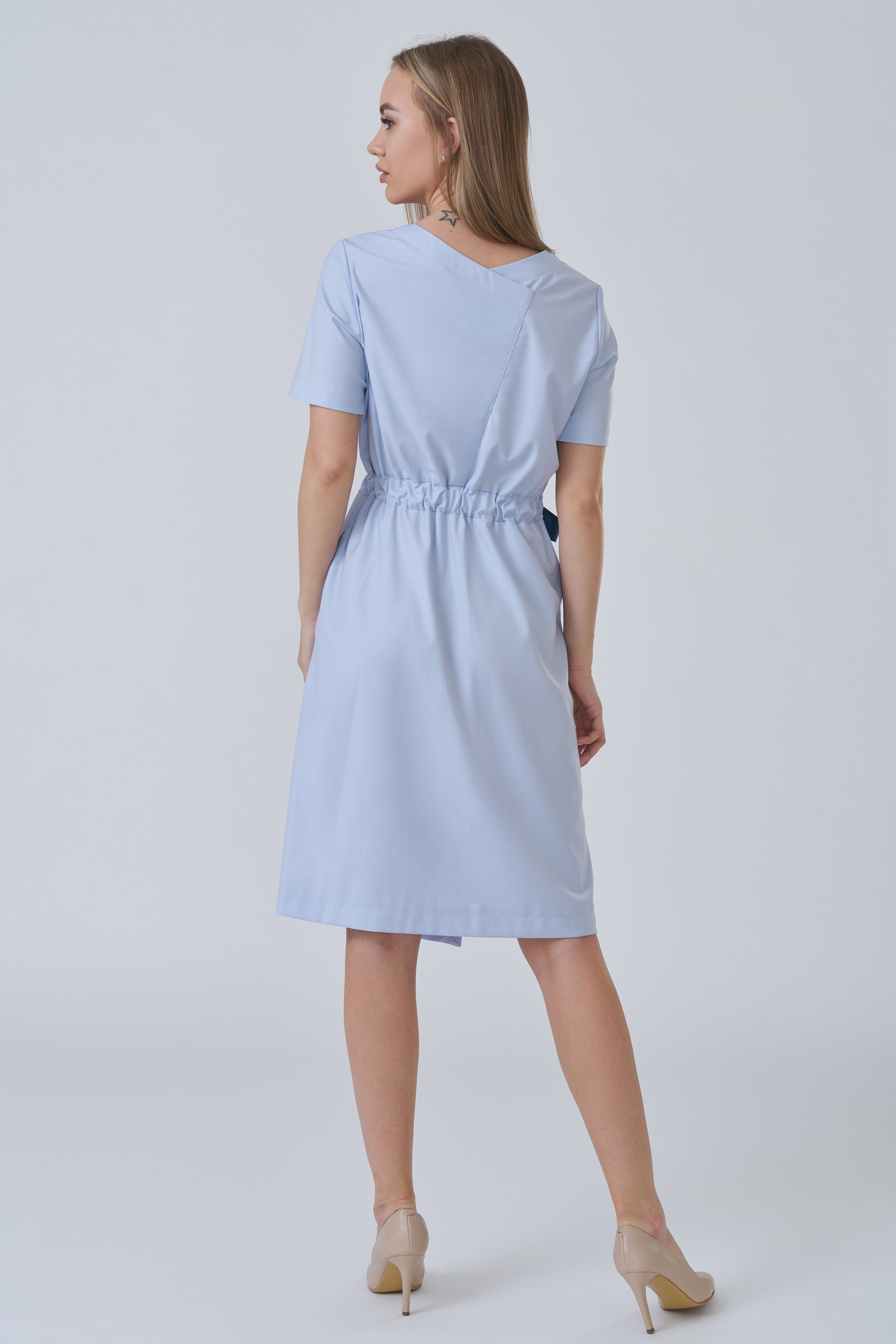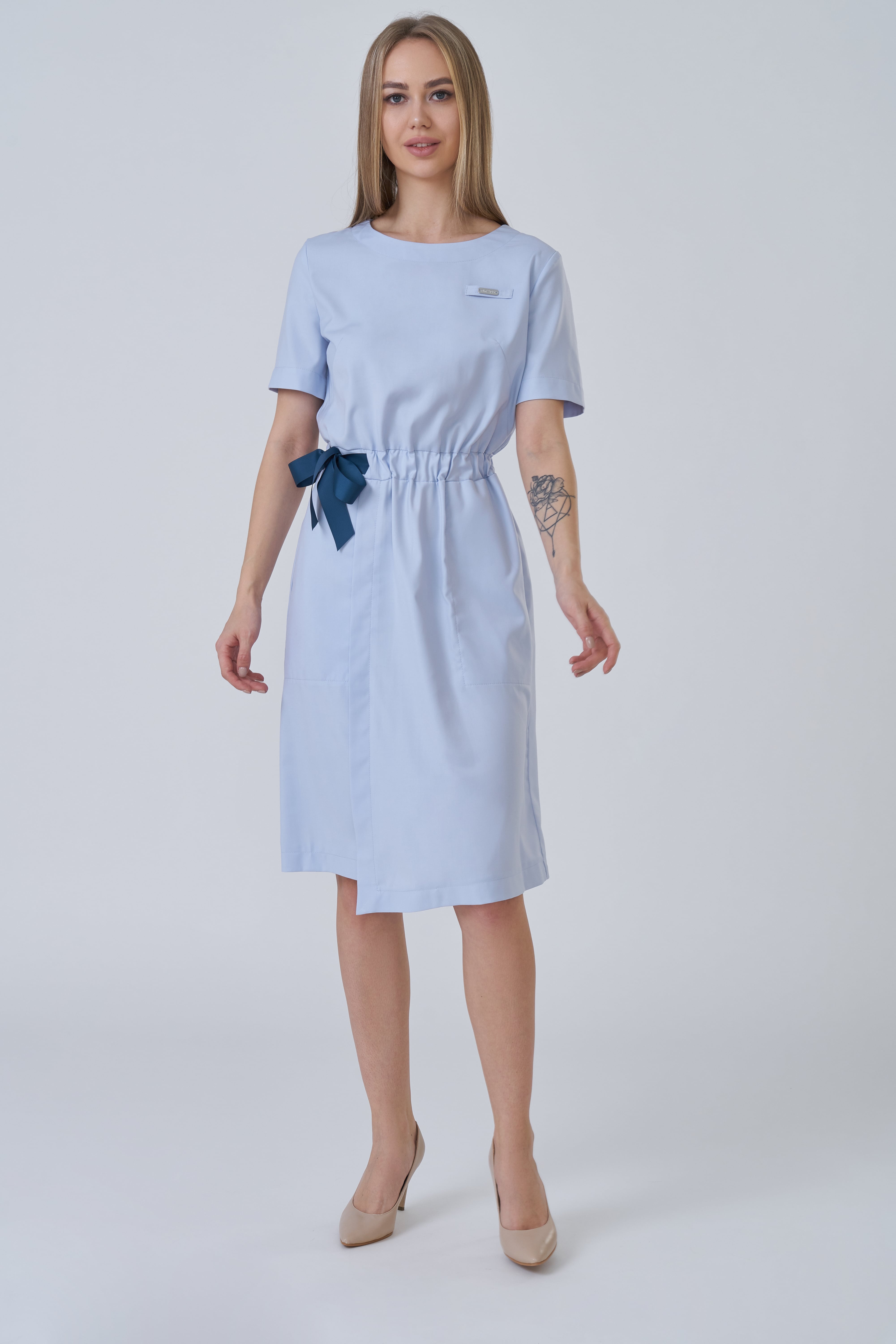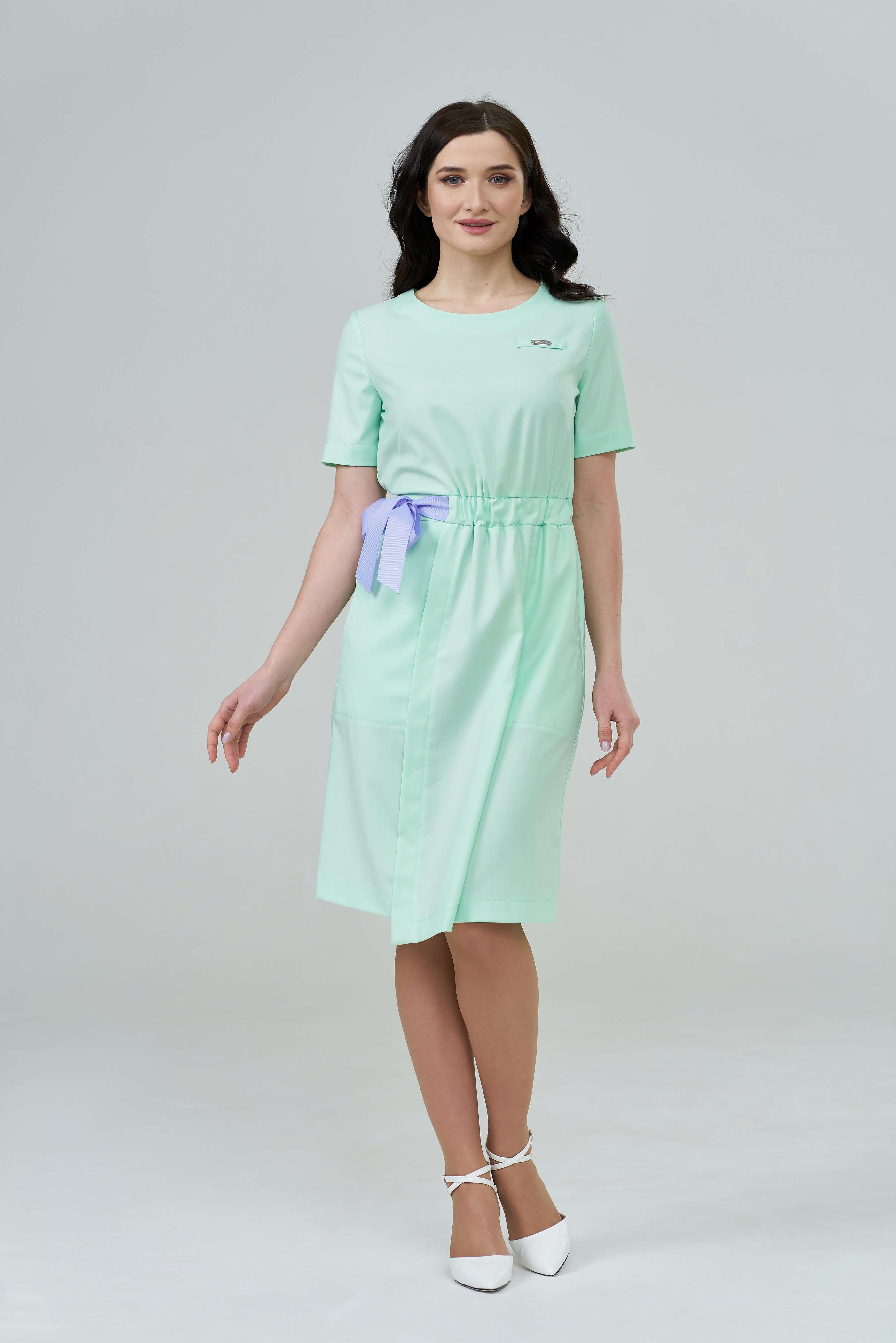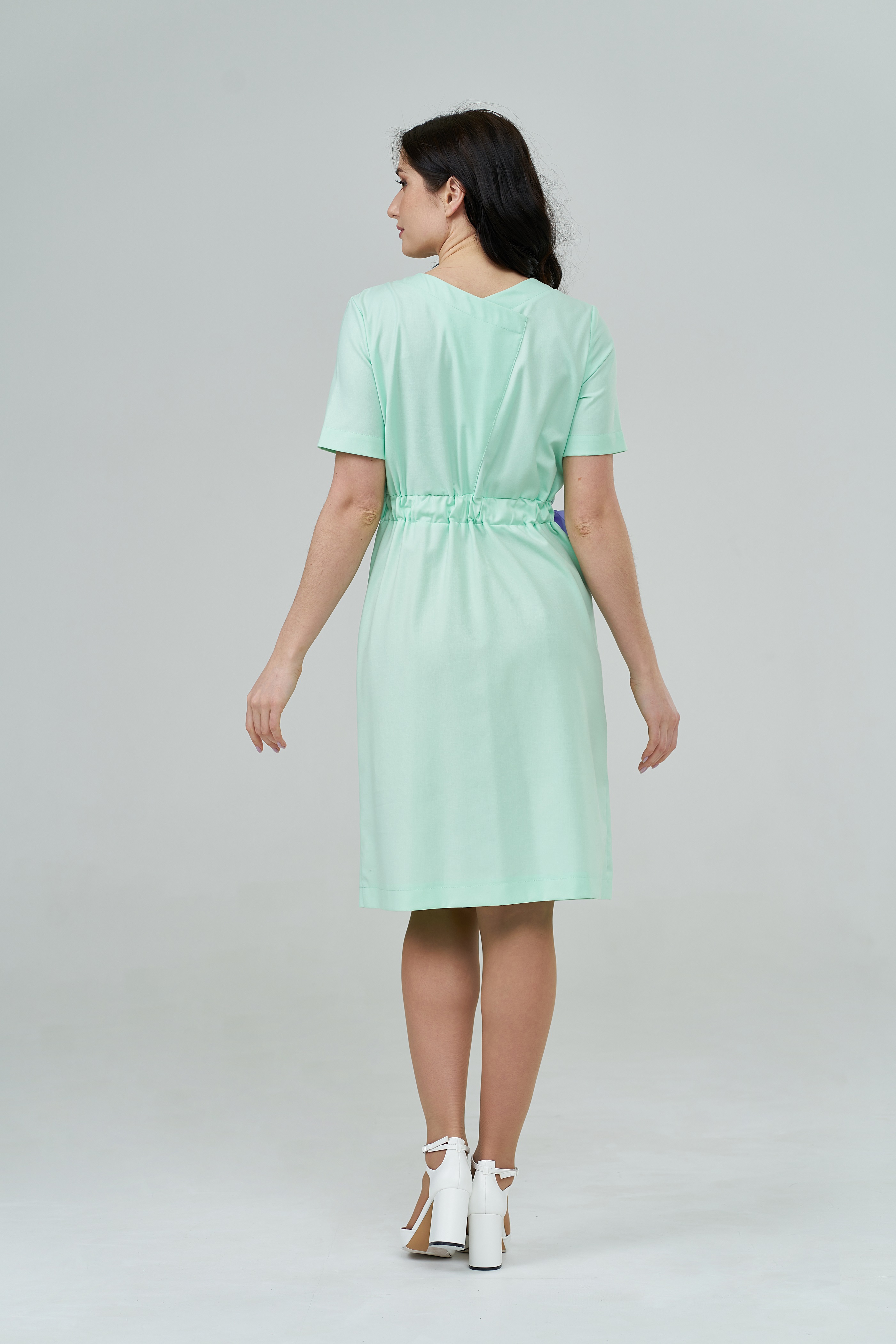 Халат женский, полуприлегающего силуэта, отрезной по линии талии. Верхняя часть полочки с нагрудными выточками, нижняя часть полочки из двух частей с ассиметричным низом и имитацией запаха. Боковые карманы в швах. Спинка верхняя часть ассиметричная. Горловина круглая ,обработана обтачкой. В подрез по талии вставлена резинка и декоративная тесьма. Рукава втачные, одношовные