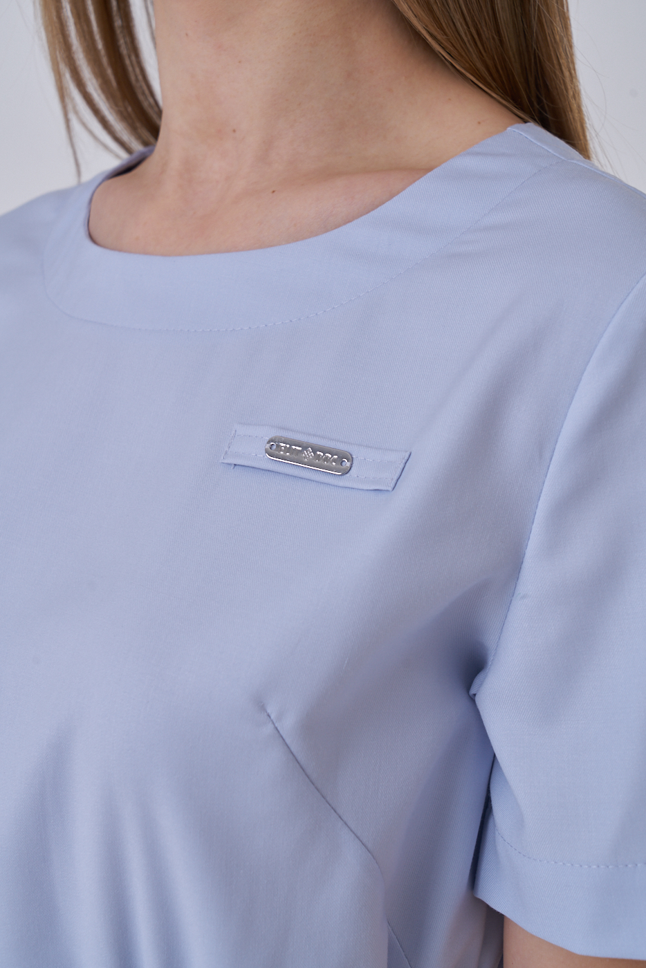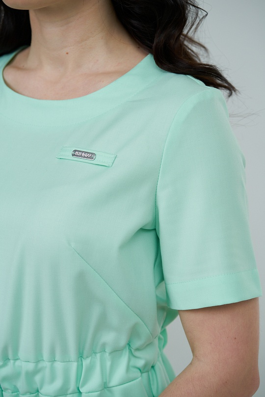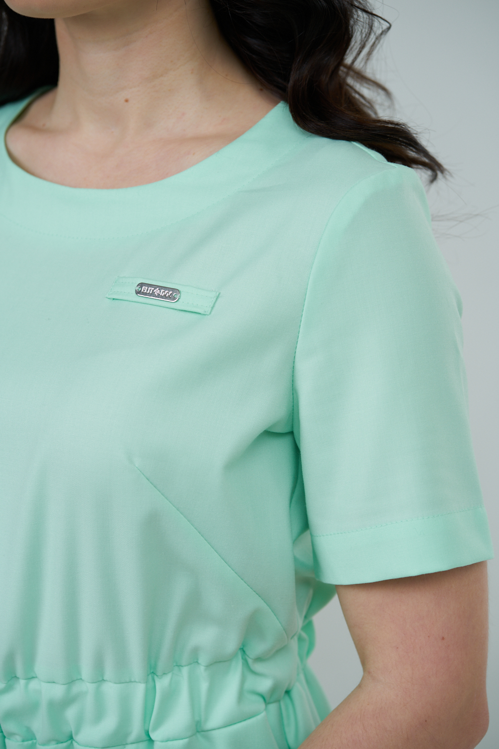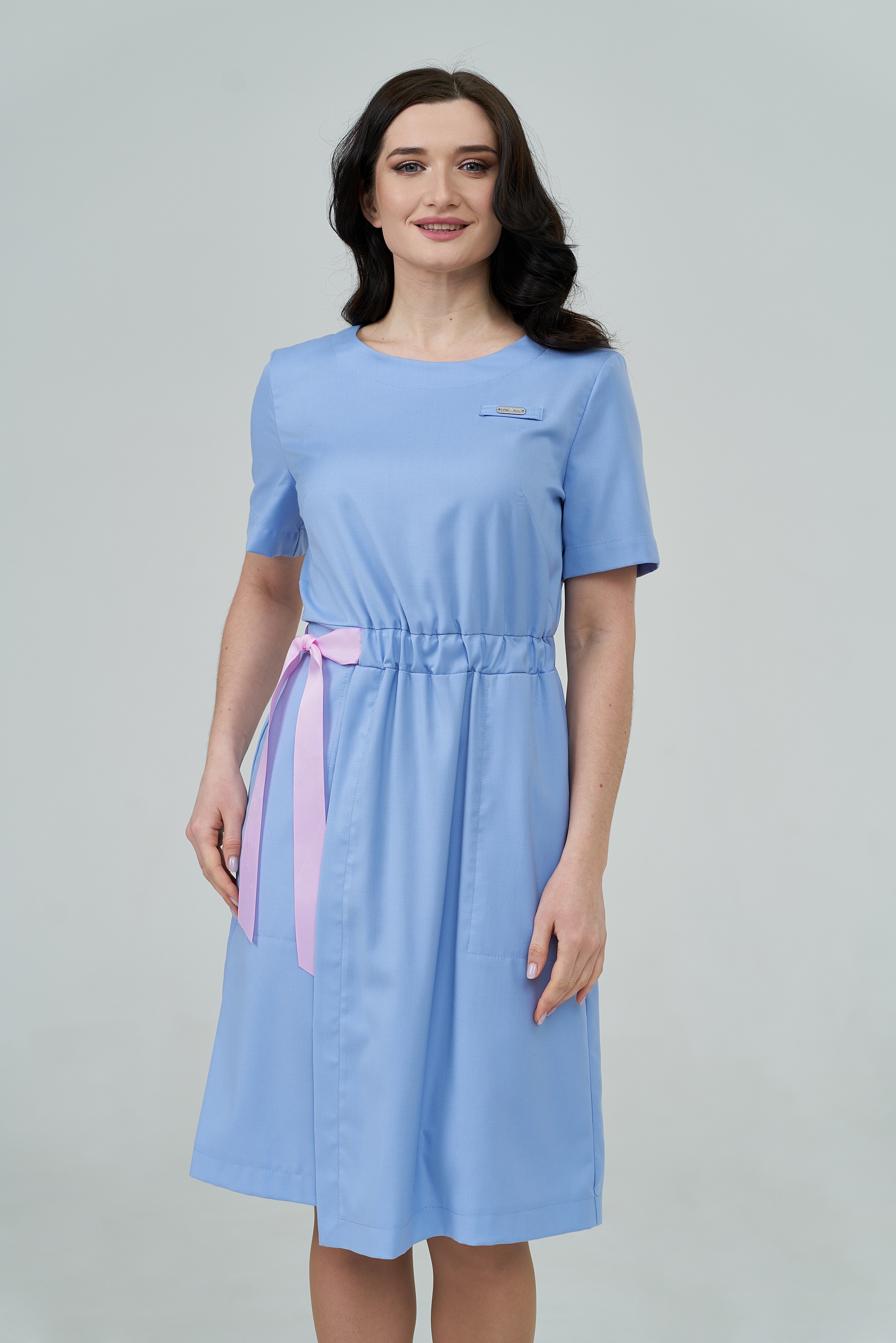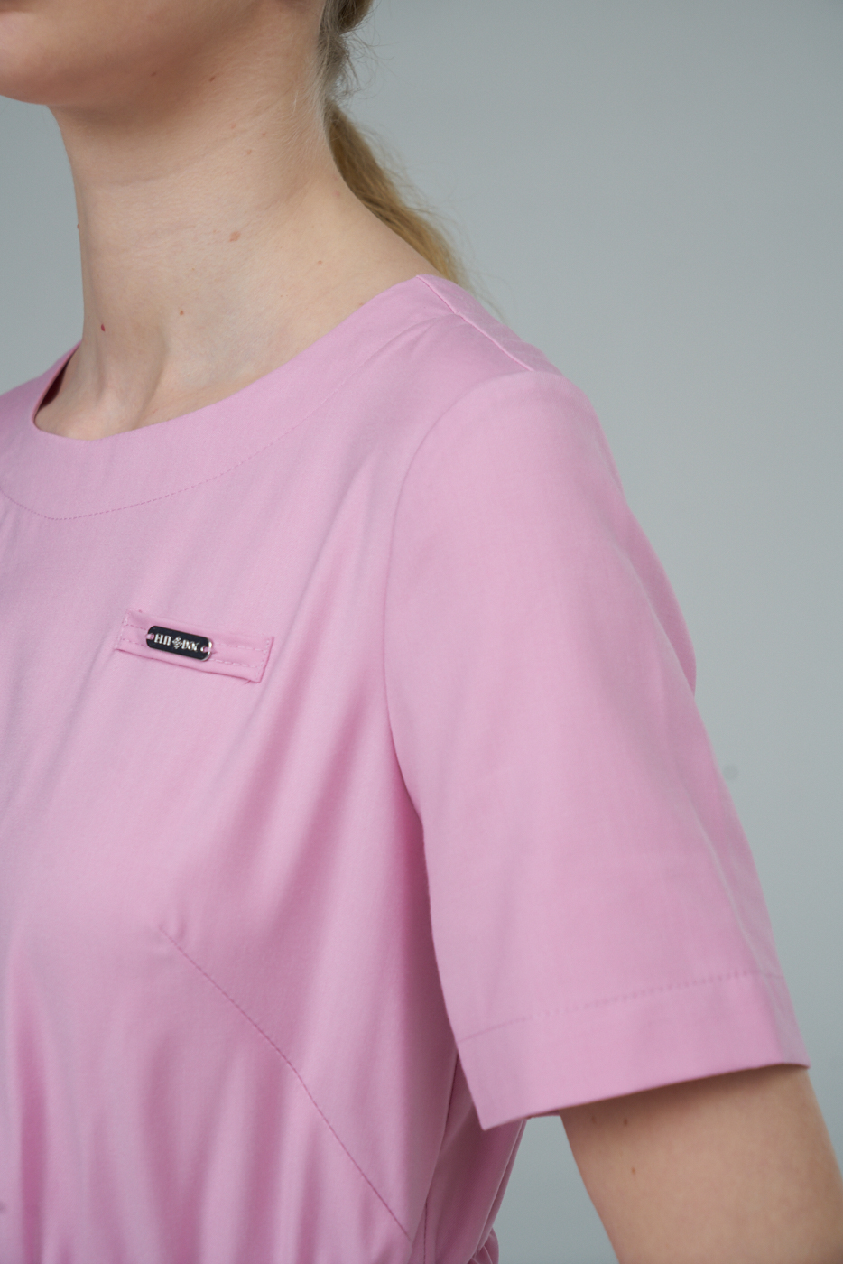Халат женский, полуприлегающего силуэта, отрезной по линии талии. Верхняя часть полочки с нагрудными выточками, нижняя часть полочки из двух частей с ассиметричным низом и имитацией запаха. Боковые карманы в швах. Спинка верхняя часть ассиметричная. Горловина круглая ,обработана обтачкой. В подрез по талии вставлена резинка и декоративная тесьма. Рукава втачные, одношовные