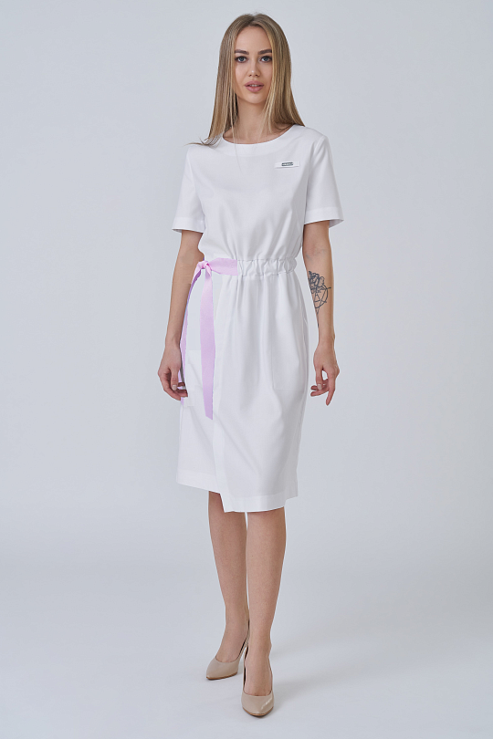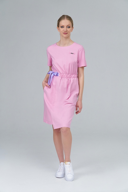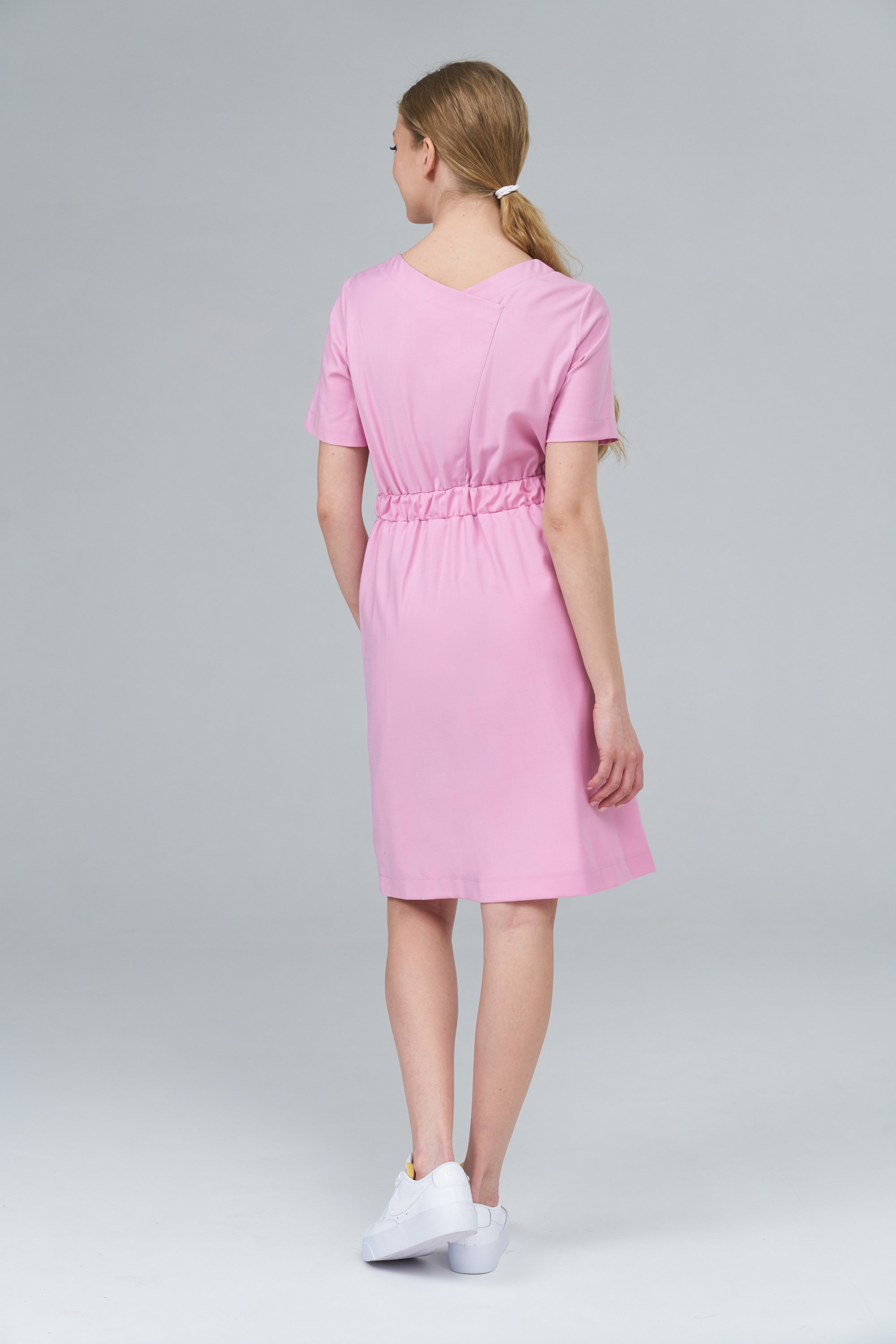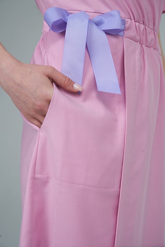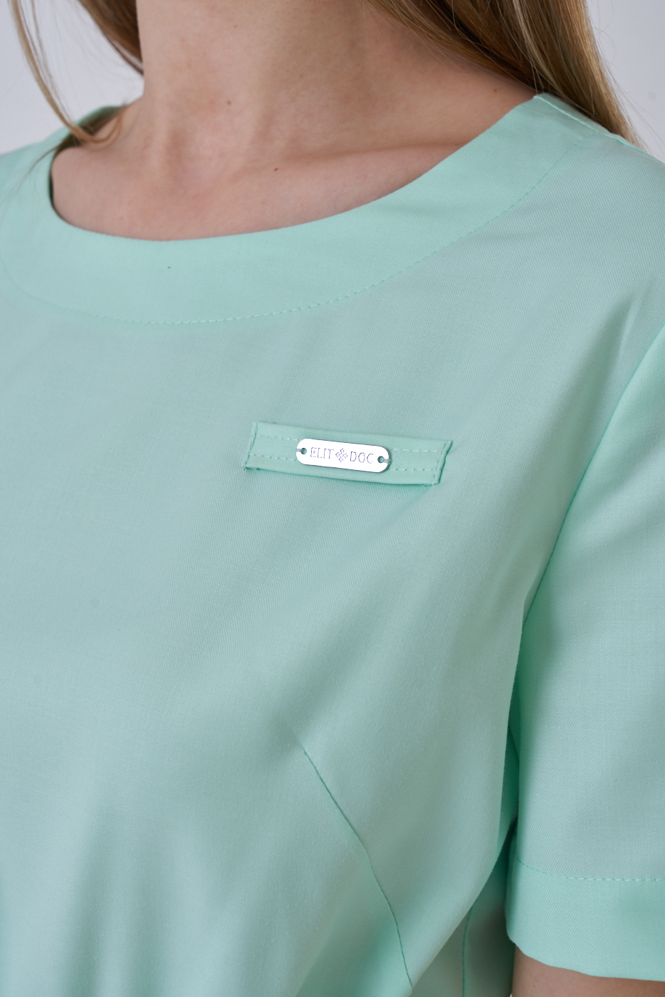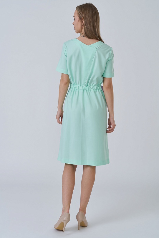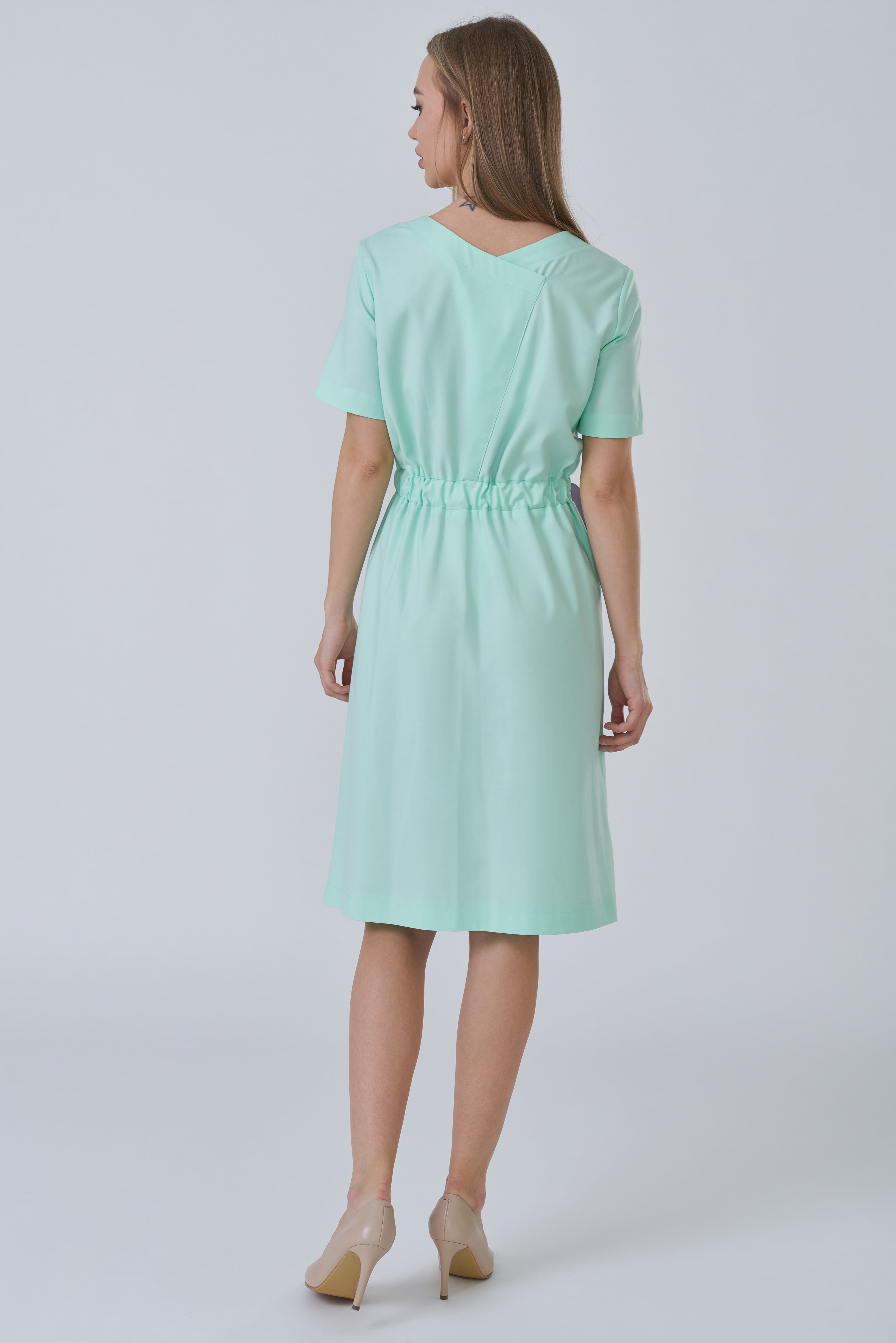 Халат женский, полуприлегающего силуэта, отрезной по линии талии. Верхняя часть полочки с нагрудными выточками, нижняя часть полочки из двух частей с ассиметричным низом и имитацией запаха. Боковые карманы в швах. Спинка верхняя часть ассиметричная. Горловина круглая ,обработана обтачкой. В подрез по талии вставлена резинка и декоративная тесьма. Рукава втачные, одношовные