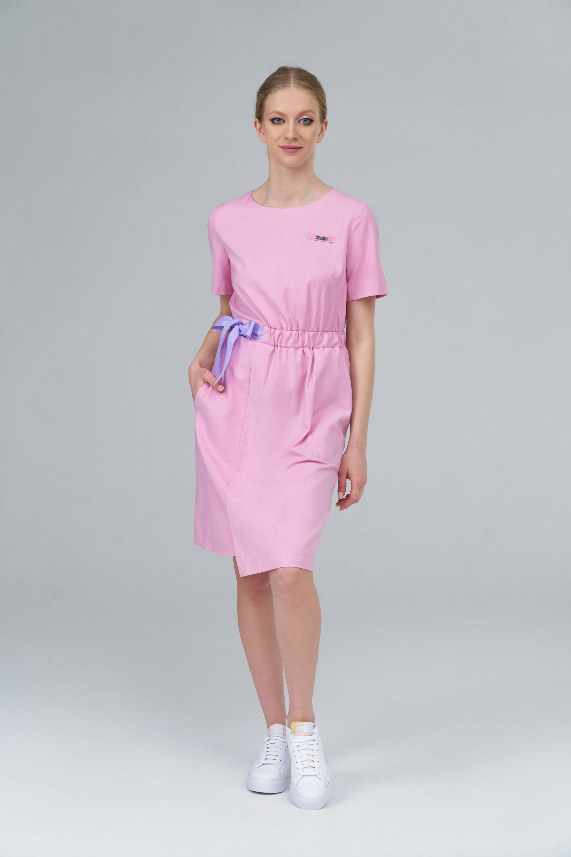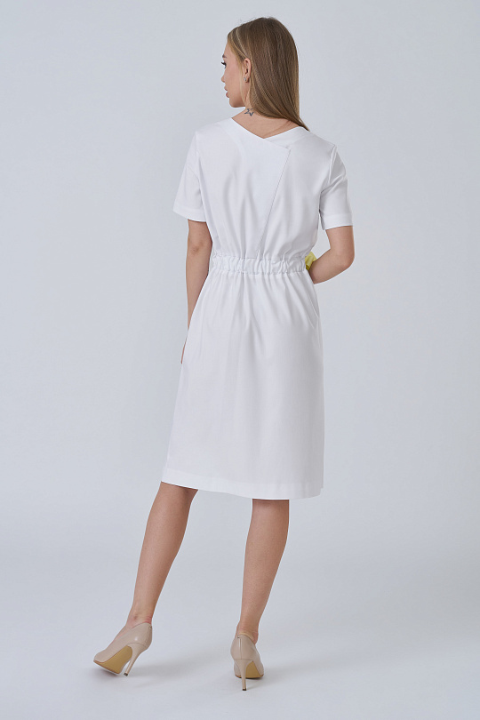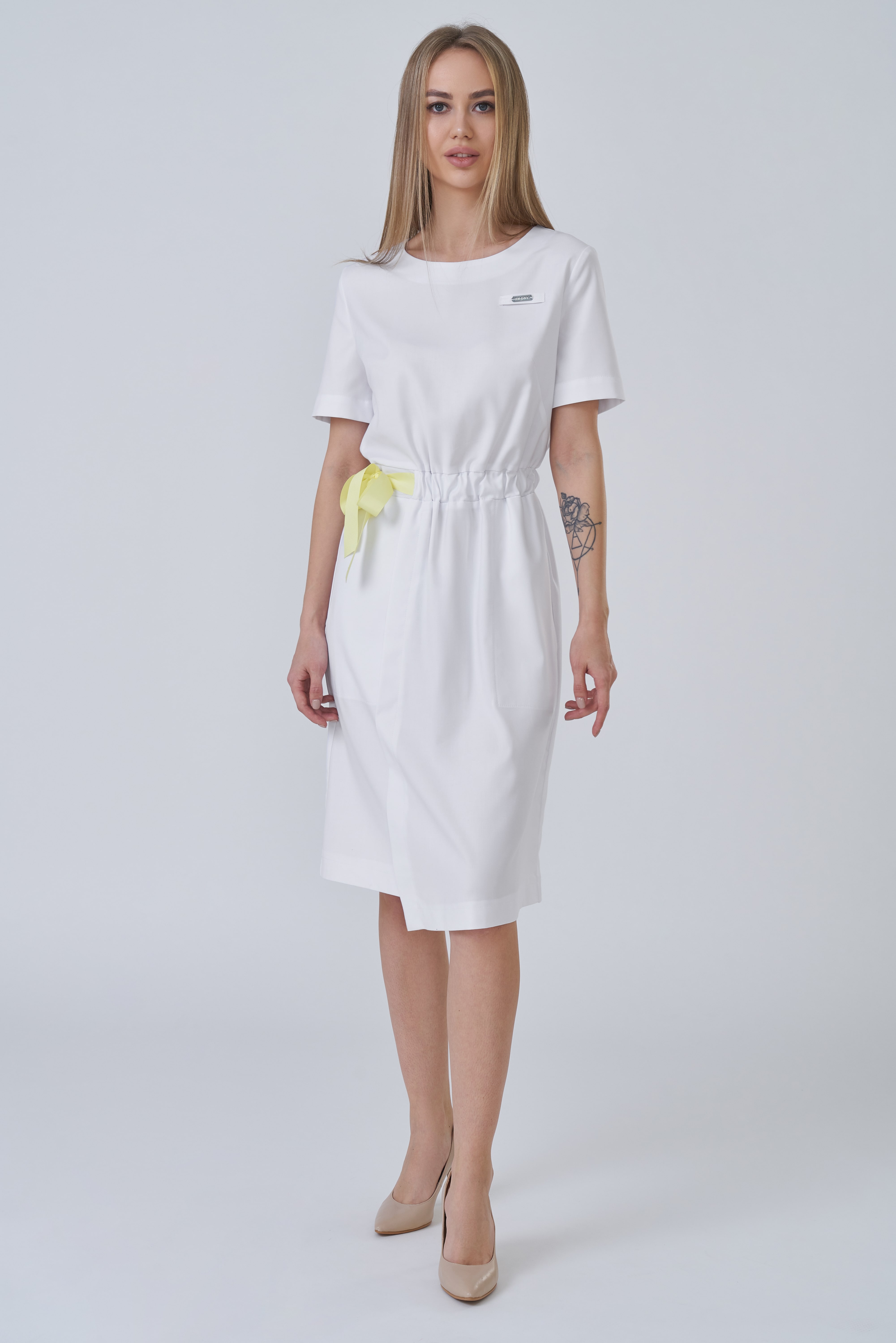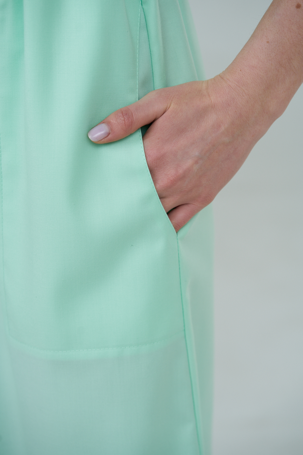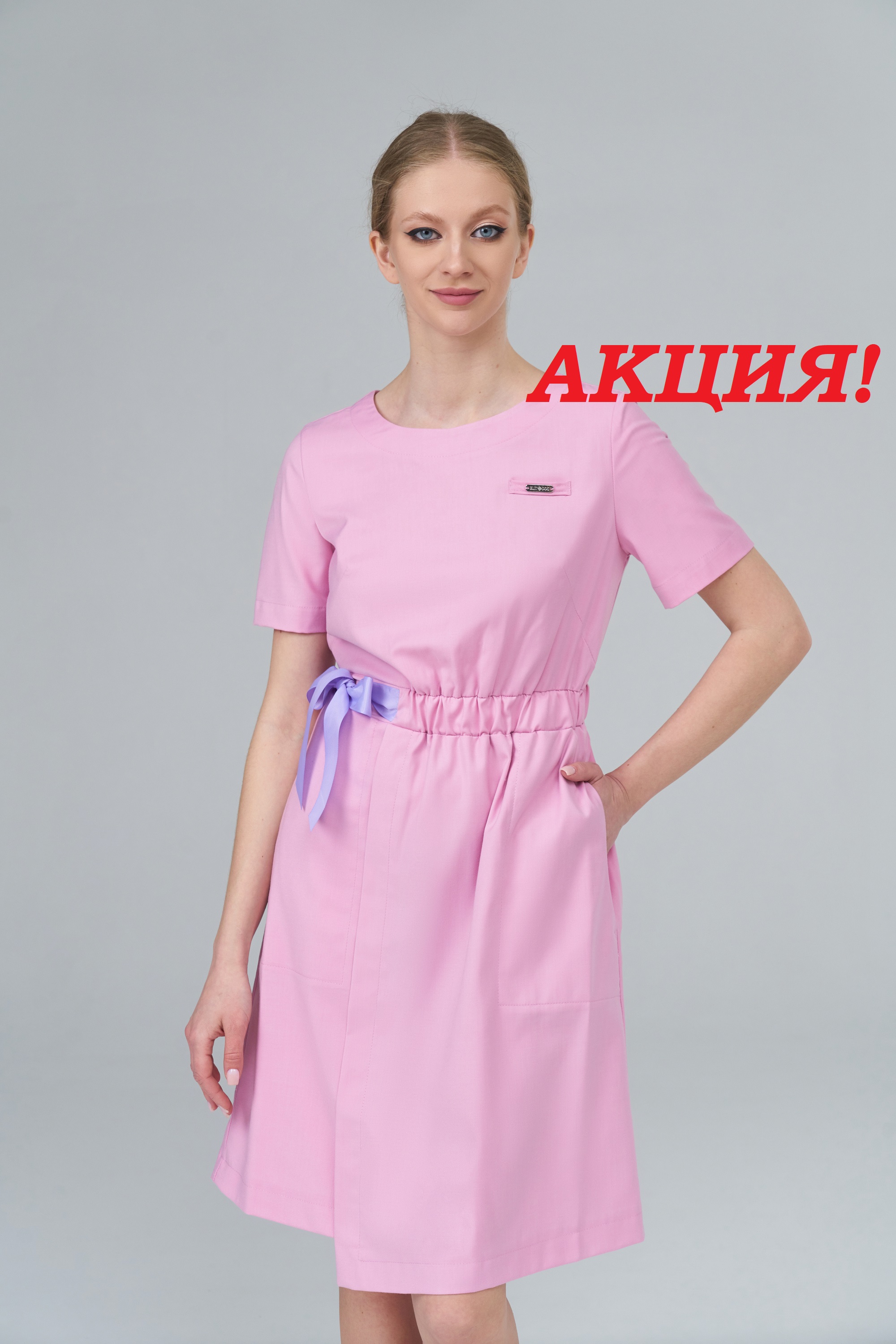 Халат женский, полуприлегающего силуэта, отрезной по линии талии. Верхняя часть полочки с нагрудными выточками, нижняя часть полочки из двух частей с ассиметричным низом и имитацией запаха. Боковые карманы в швах. Спинка верхняя часть ассиметричная. Горловина круглая ,обработана обтачкой. В подрез по талии вставлена резинка и декоративная тесьма. Рукава втачные, одношовные