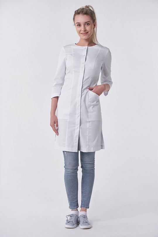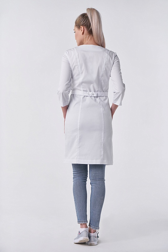 Халат женский, полуприлегающего силуэта, без воротника, с застежкой по планке на девять металлических кнопок, три из них видимые, остальные в супатной застежке, разрезами в боковых швах. Перед с рельефами от плеча до низа изделия. Отрезными частями полочек , с настрочной тесьмой, наклонным входом в боковой карман, на правом кармане настрочена тесьма. Спинка с рельефами от плеча до низа изделия, хлястиками, выходящими из рельефных швов, длина которых регулируется двумя кнопками. Рукава втачные, одношовные