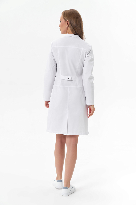 Халат женский медицинский, полуприлегающего силуэта с центральнобортовой застёжкой на планке, на металлические кнопки. Полочка с отрезной кокеткой от проймы до планки, отрезной нижней частью, чуть ниже линии талии, рельефами между кокетками и линией отреза, одним нагрудным накладным и двумя нижними боковыми карманами, расположенными под наклоном, на нижней детали полочки. По левой кокетке и правому бочку настрочены бейки с металлической фурнитурой, соответствующей внешнему виду кнопки Спинка с отрезной кокеткой, отрезной нижней частью, между которыми расположены рельефы. Из рельефов по линии талии выходят хлястики, скрепляющиеся по середине кнопкой. Воротник втачной, отложной с острыми концами. Рукава втачные, одношовные