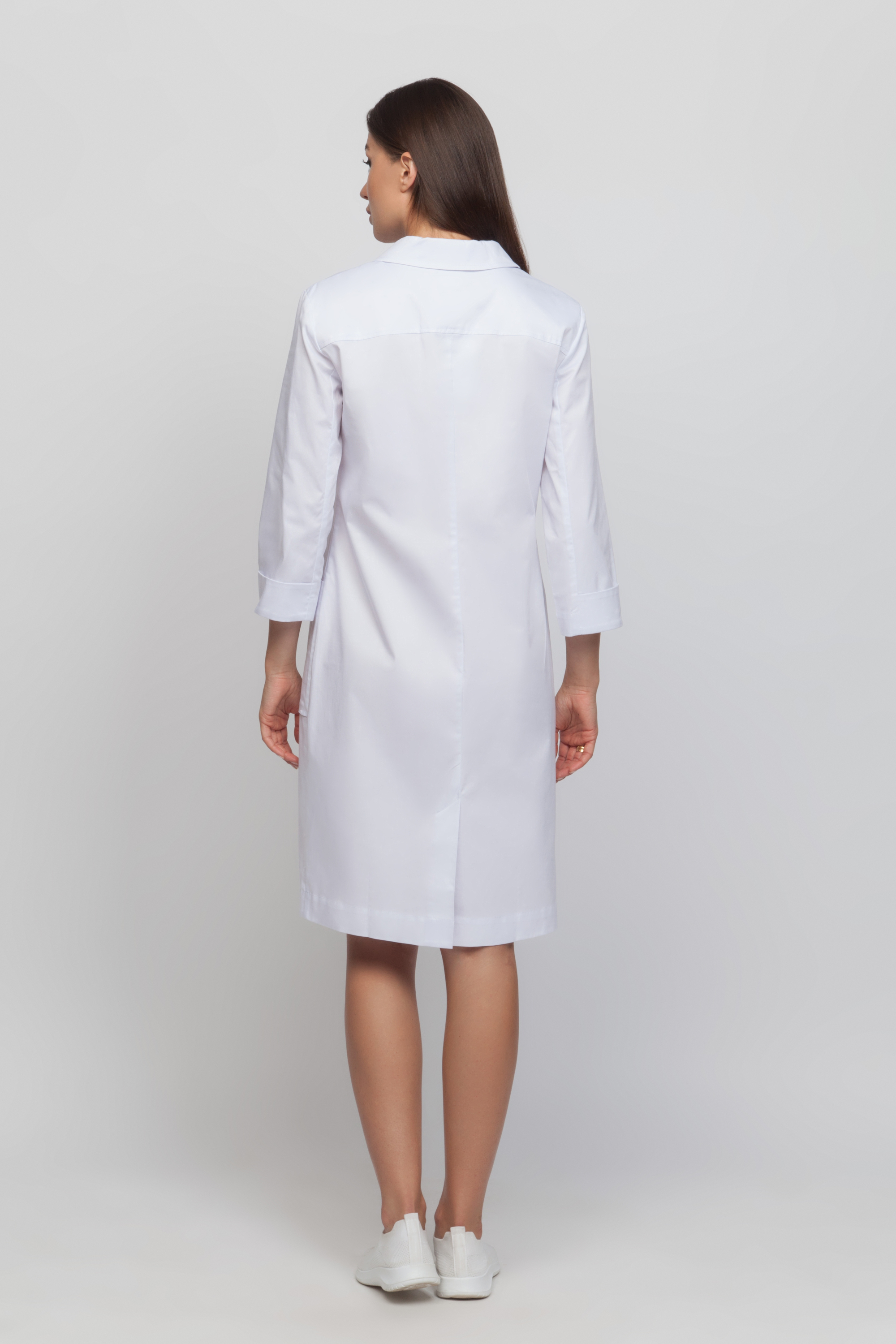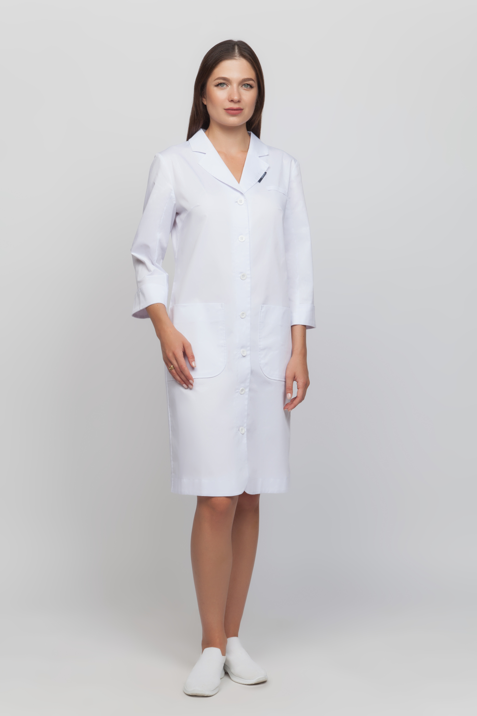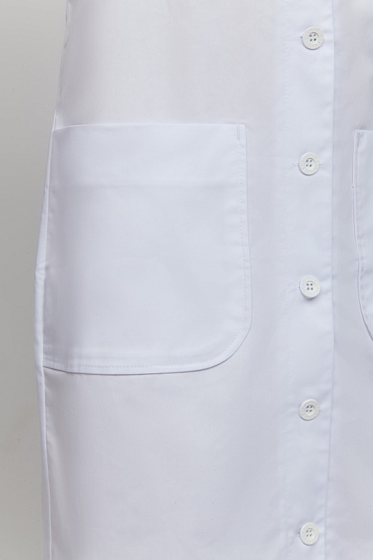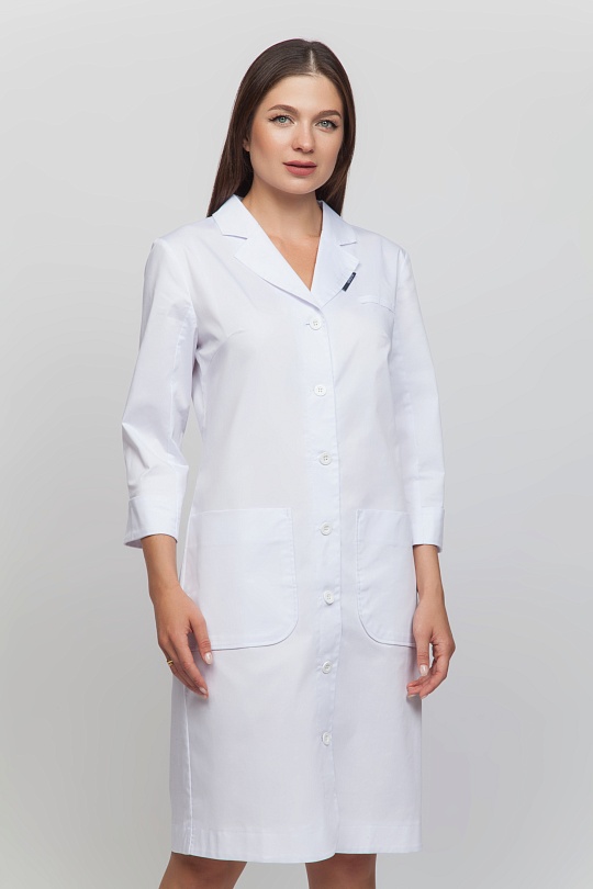 Халат женский с центральной застежкой . Халат может выпускаться с застежкой на кнопки или пуговицы. Полочка с нагрудной вытачкой из бокового шва до центра груди, боковыми карманами . На левой полочке расположена шлевка на груди для бейджа. Спинка с отрезной кокеткой, средним швом переходящим в шлицу. Воротник втачной , отложной, с отложными лацканами. Рукава втачные, с передним и задним швом. По средней части рукава притачная манжета, с отворотом.