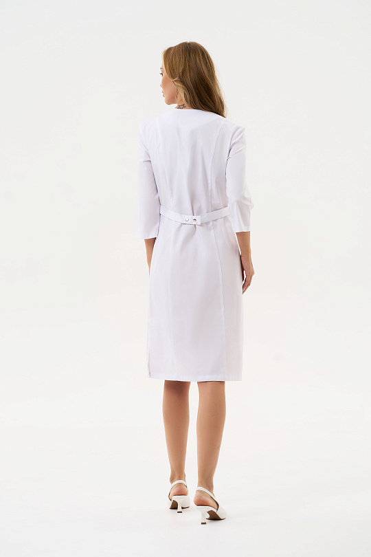 Халат женский, полуприлегающего силуэта с центральной бортовой застежкой на потайные металлические кнопки и разрезами в боковых швах. Полочка с рельефами, выходящими из плечевых швов до низа изделия. На боковой части полочки боковые карманы с планкой . На левой боковой части полочки декоративная нашивка. Спинка с рельефами, выходящими из плечевых швов до низа изделия. Горловина с планками. Рукава — втачные, одношовные