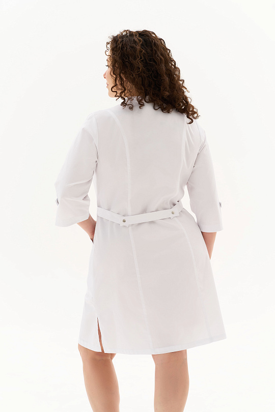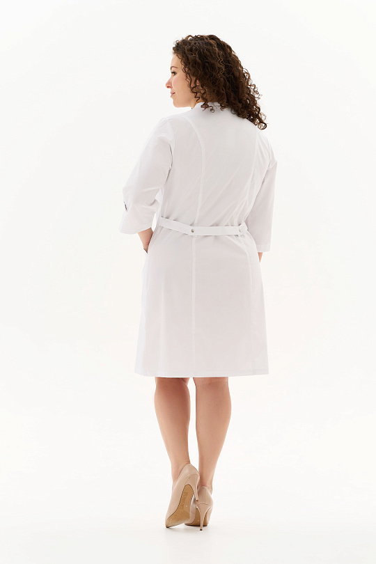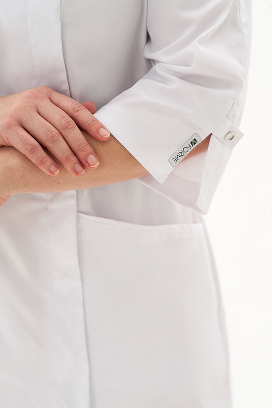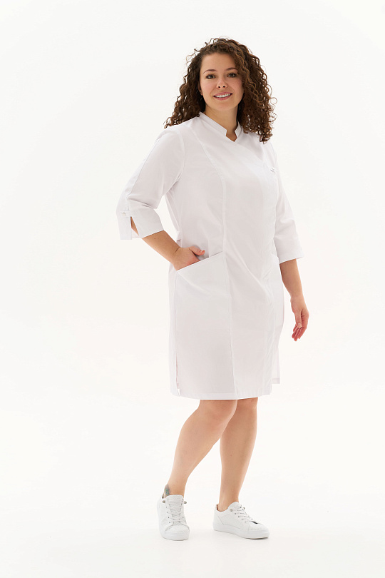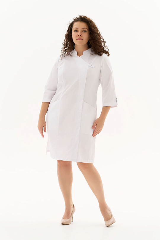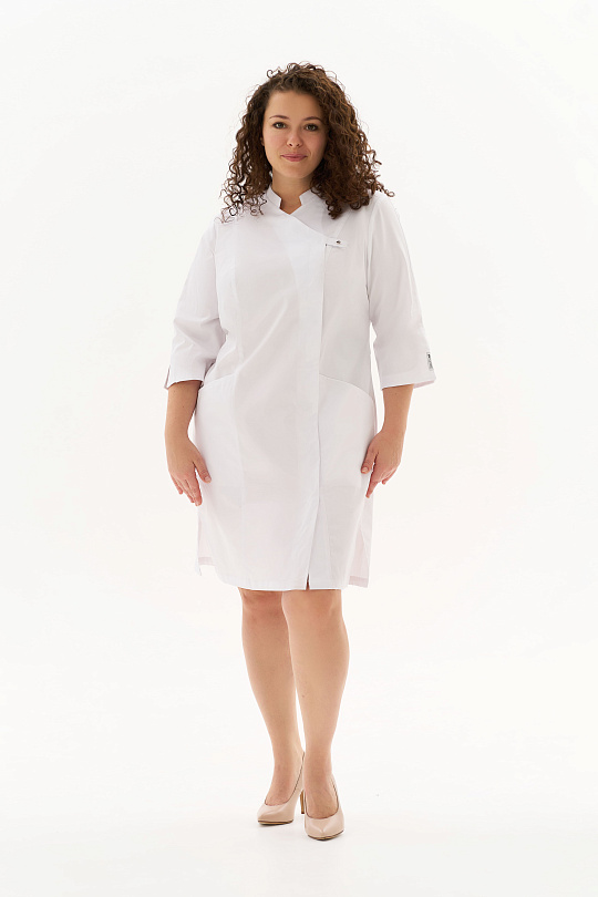 Халат женский укороченный со смещенной застежкой на потайные кнопки, с разрезами в боковых швах. Полочка с рельефами от плеча до низа изделия, боковыми карманами . На правой полочке пата с кнопкой. Спинка с рельефами «углом» от плеча до низа изделия, п /поясами . Воротник втачной, стойка. Рукава втачные, одношовные