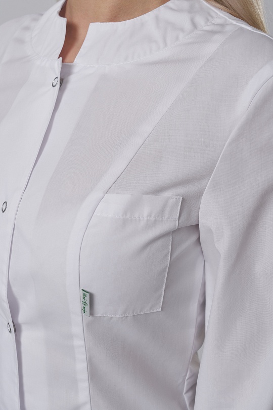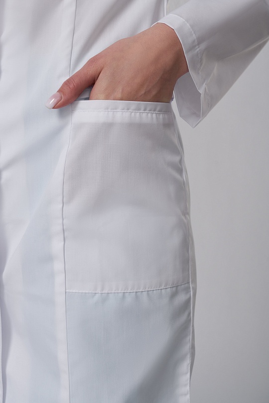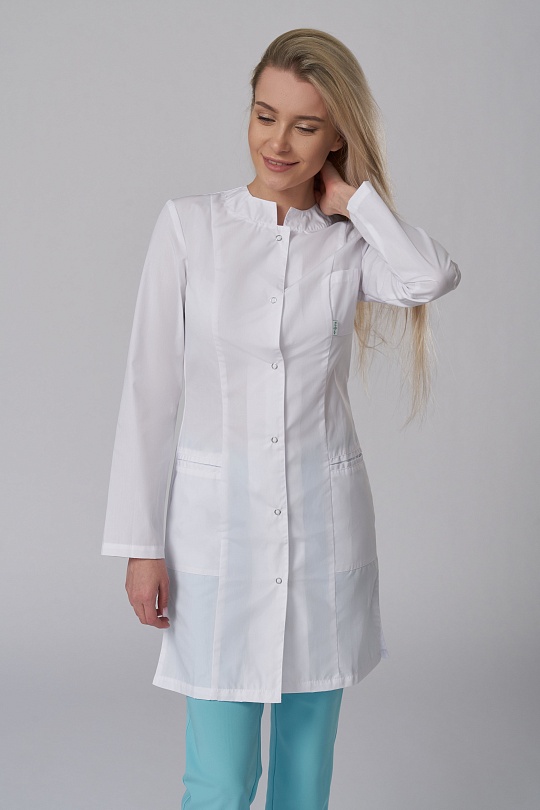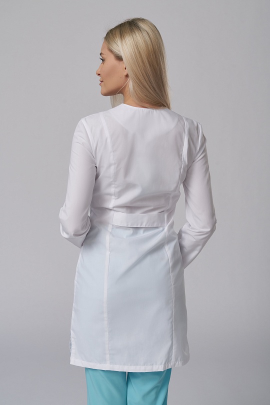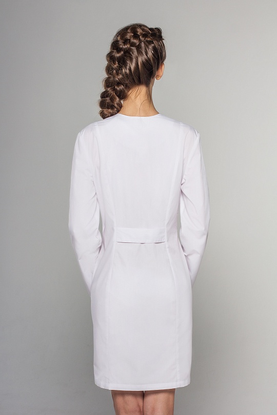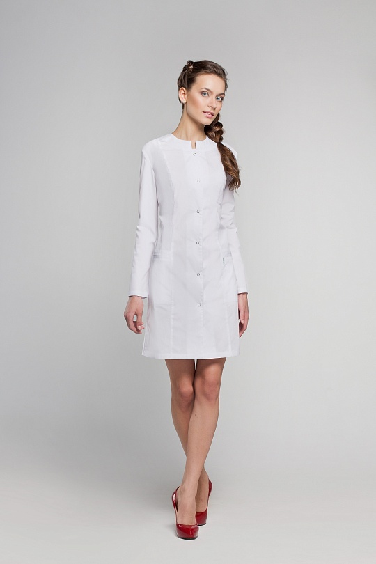 Халат женский укороченный полу прилегающего силуэта с центральной застежкой на 6 кнопок и разрезами в боковых швах. Полочка с рельефами. На боковой части полочки боковые карманы с обтачками. На левой боковой части полочки нагрудный карман. Спинка с рельефами. На спинке полу пояс из рельефных швов. Горловина с планками. Рукава — втачные длинные.