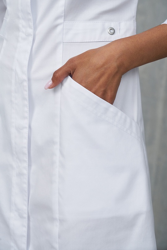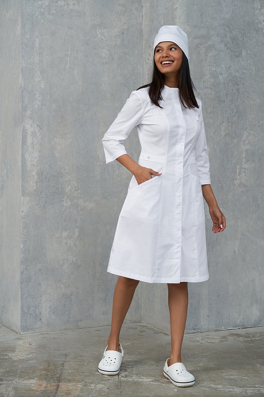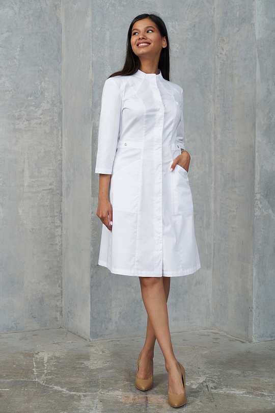 Халат женский, полуприлегающего силуэта, с застежкой на металлические кнопки по планке борта. Перед с подрезными кокетками расположенными под наклоном от горловины до проймы; рельефными швами от кокетки до низа, боковыми карманами расположенными под наклоном от рельефных швов до бокового шва. Спинка с рельефными швами от подрезных кокеток до низа. Рукава втачные, одношовные.