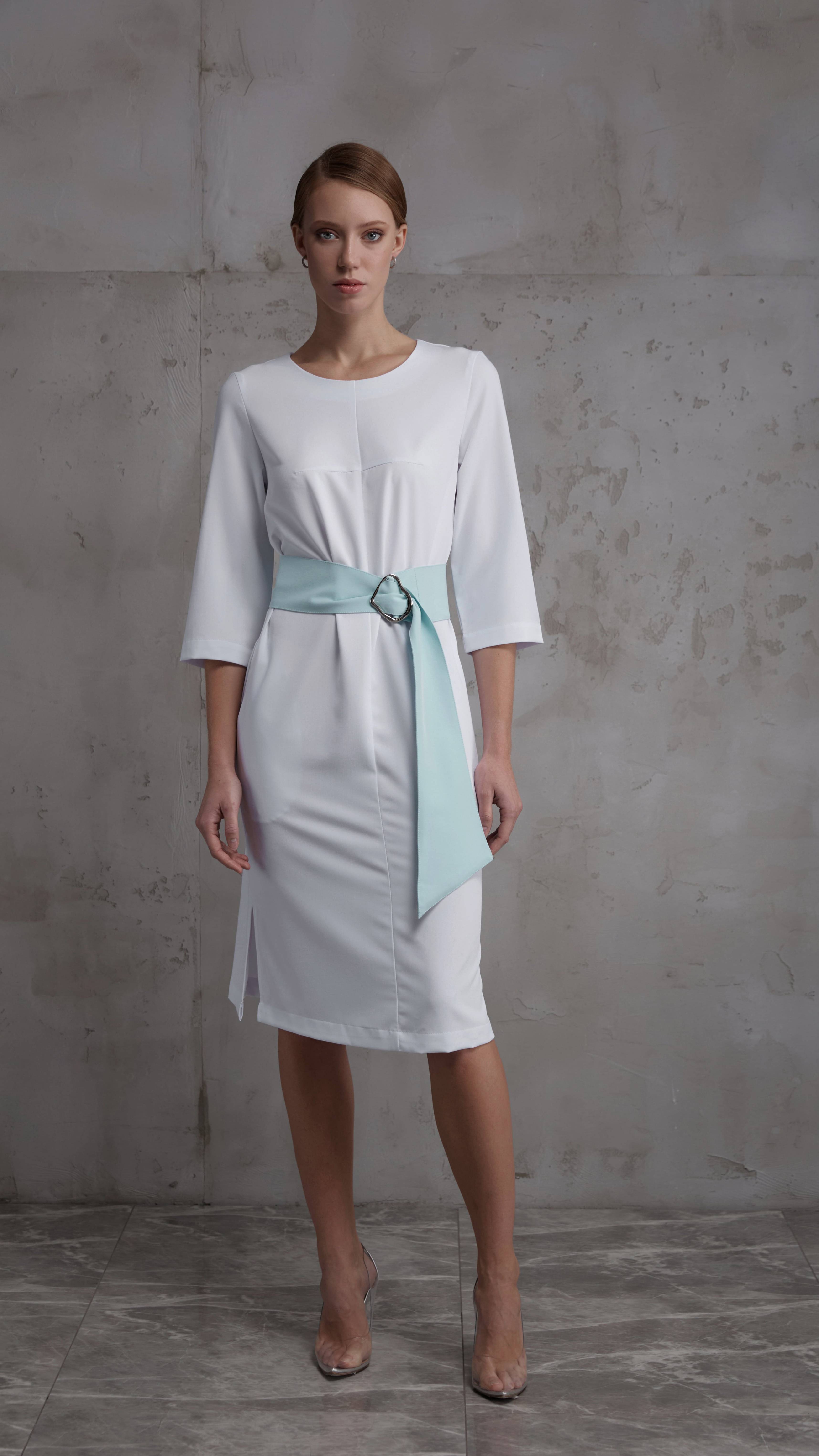 Халат женский, прямого силуэта, без застёжки. Горловина круглая обработана обтачкой. Пояс съёмный с пряжкой. В боковых швах разрезы. На полочке нагрудные выточки из среднего шва,боковые карманы. Спинка со средним швом и плечевыми выточками. В среднем шве спинки от горловины вставка треугольной формы.