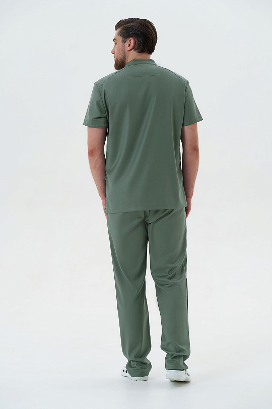 Куртка мужская, прямого силуэта, с застежкой на 3 кнопки до шва кокетки, с разрезами в боковых швах. Перед с отрезной кокеткой, нагрудными карманами расположенными в шве кокетки , нижними боковыми накладными карманами. Спинка с отрезными кокетками от горловины до проймы и настрочной фигурной деталью по верху. Рукава втачные, одношовные, короткие, с обтачкой по низу и возможность отвернуть как манжету. Воротник втачной , стойка. Нижняя стойка, подкладка кармана, и обтачки рукавов (манжеты) могут быть выполнены из отделочной ткани Брюки мужские, зауженные к низу, с цельновыкроенным поясом, боковыми карманами от пояса до бокового шва. Ширина пояса регулируется эластичной резиной и шнуром