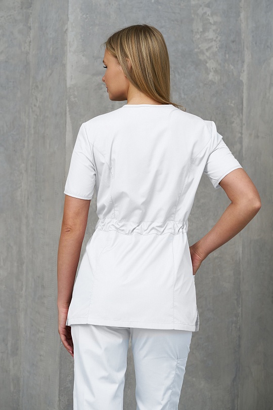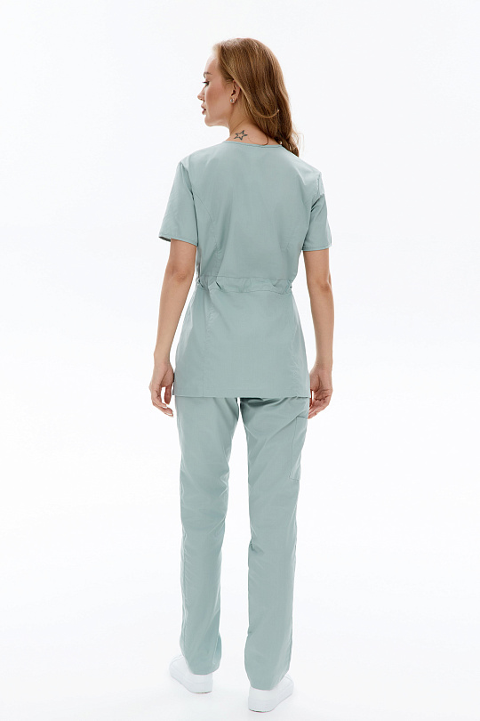 Куртка женская, полуприлегающего силуэта, без застежки, горловина с запахом, разрезами в боковых швах. Перед с отрезным поясом по талии, рельефами от проймы до пояса, нижними карманами. Спинка с отрезным поясом по талии, рельефными швами от проймы до пояса и от пояса до низа. Рукава втачные, одношовные, короткие. По поясу продернут рулик, выходящий с левой стороны куртки и регулирующий объем по талии. Брюки женские зауженные к низу, с поясом по талии, вставками по боковым швам (лампасами). Пояс брюк с продернутой эластичной резиной, фиксированной тремя строчками на расстоянии 1,0 см друг от друга и вставкой посередине переда. На правой стороне , чуть ниже линии бедер боковой карман.