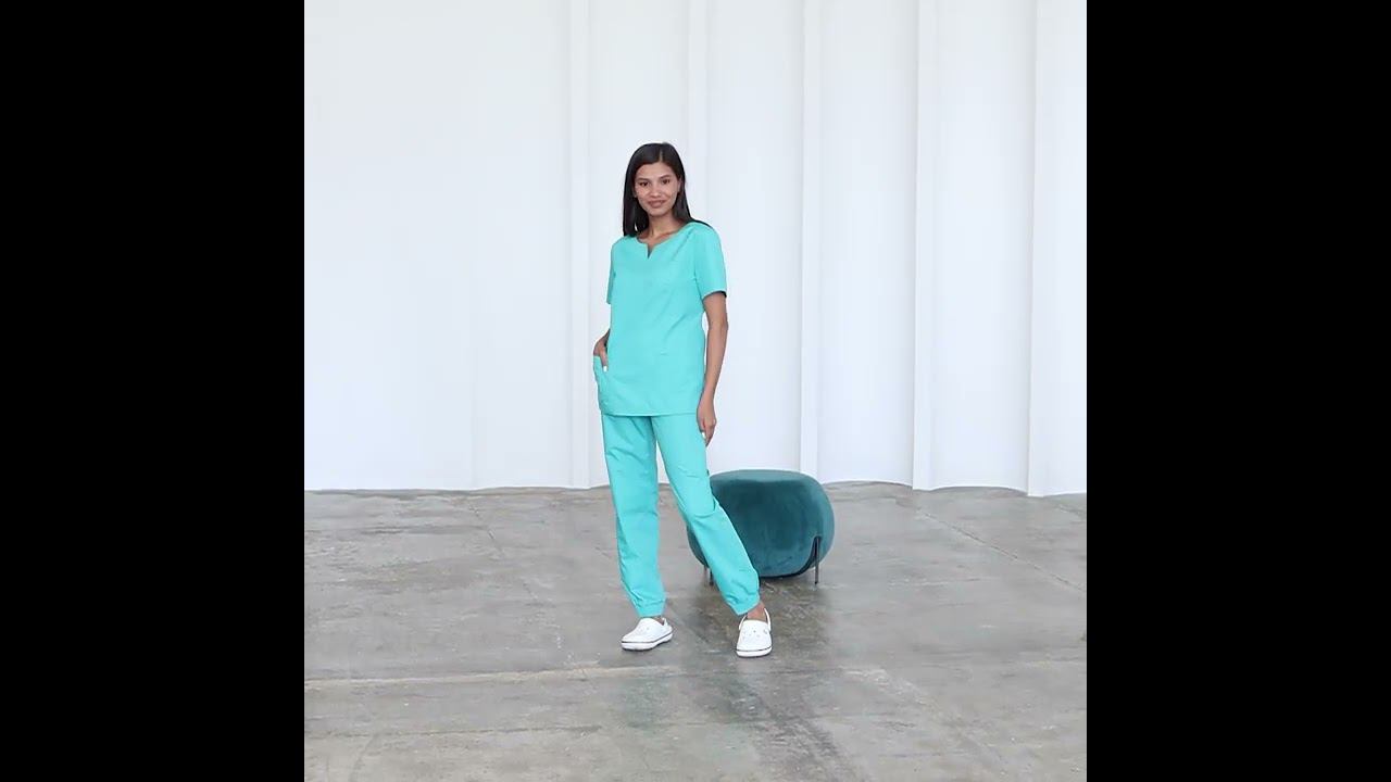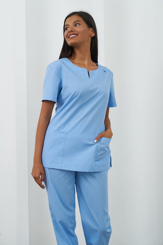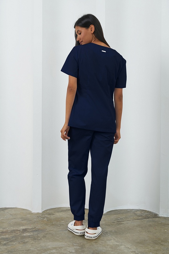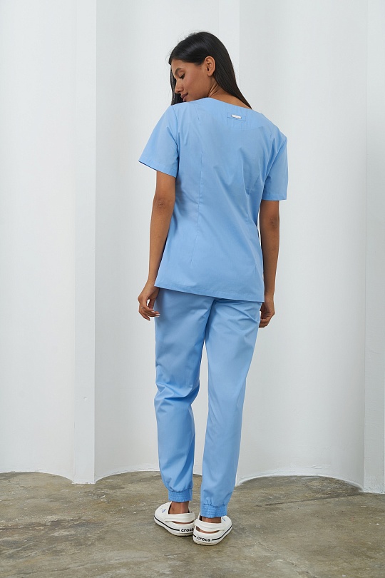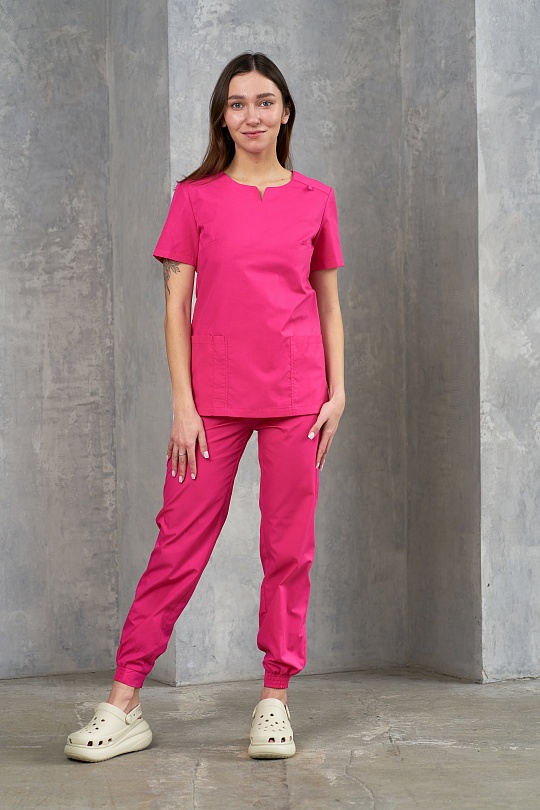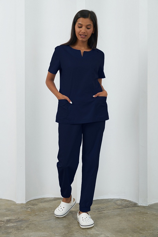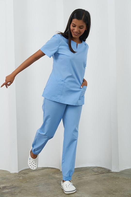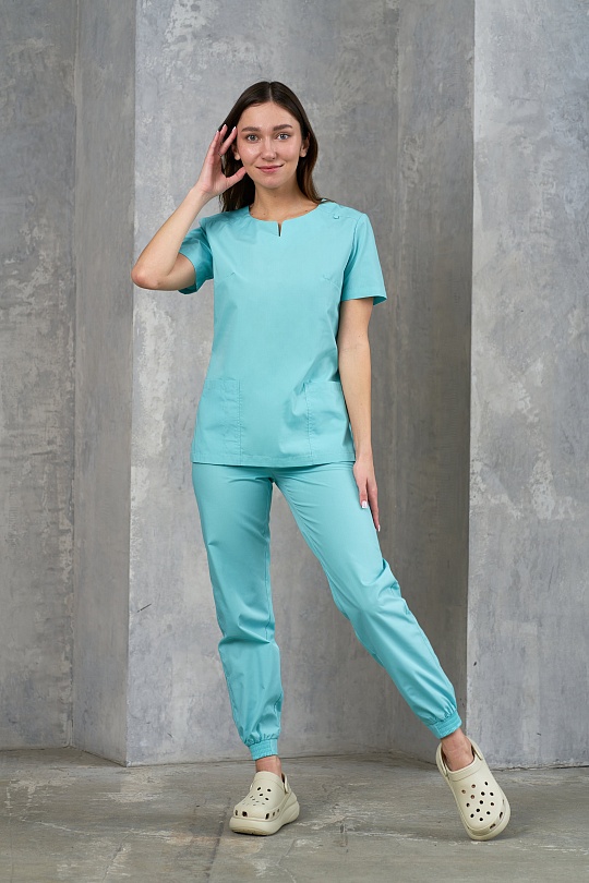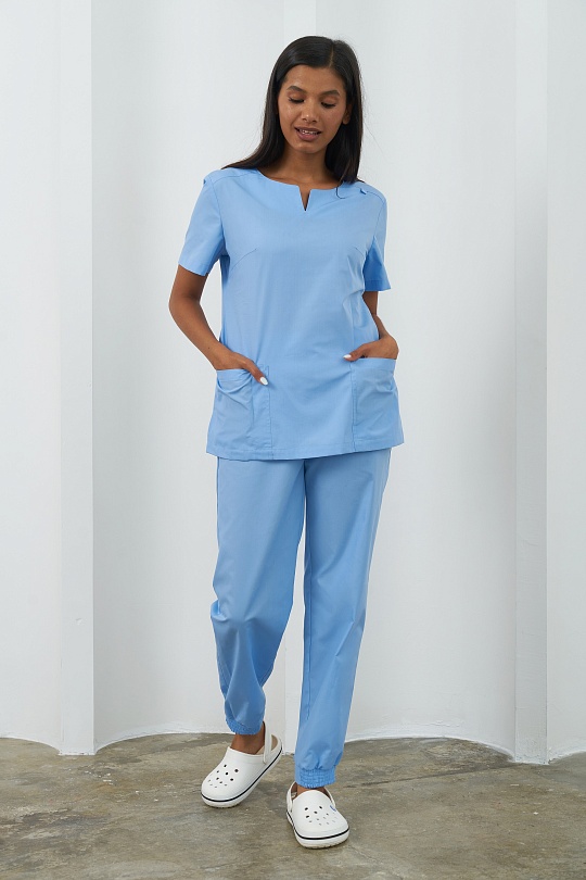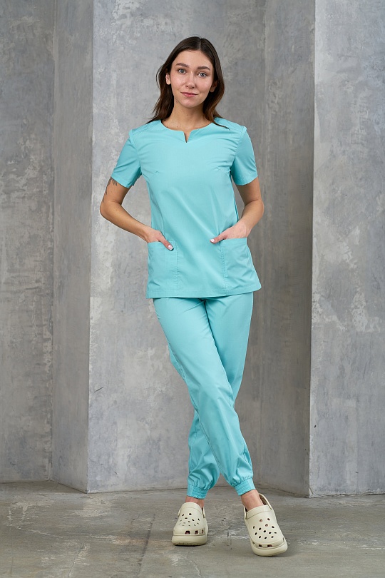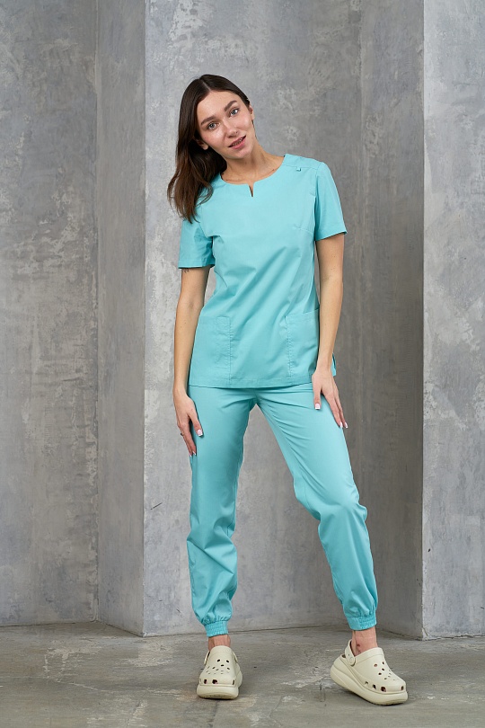 Куртка полуприлегающего силуэта, без застежки, с разрезами в боковых швах. Перед с нагрудными вытачками, кокетками, нижними боковыми накладными карманами. На правом кармане дополнительная строчка. В шов кокетки левой полочки вшита шлевка (петля) для бейджика. Вырез горловины фигурный обработан обтачками. Спинка с плечевыми и талевыми вытачками. По верху спинки настрочена отделочная деталь Брюки женские, зауженные к низу, на притачном поясе со вставкой посередине и с продернутой эластичной резиной. По низу брюк притачная манжета с продернутой эластичной тесьмой, и со вставкой посередине.