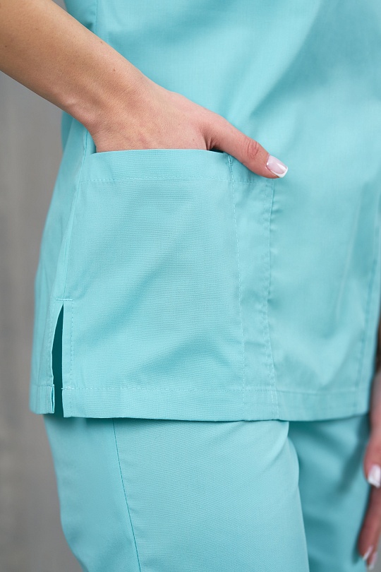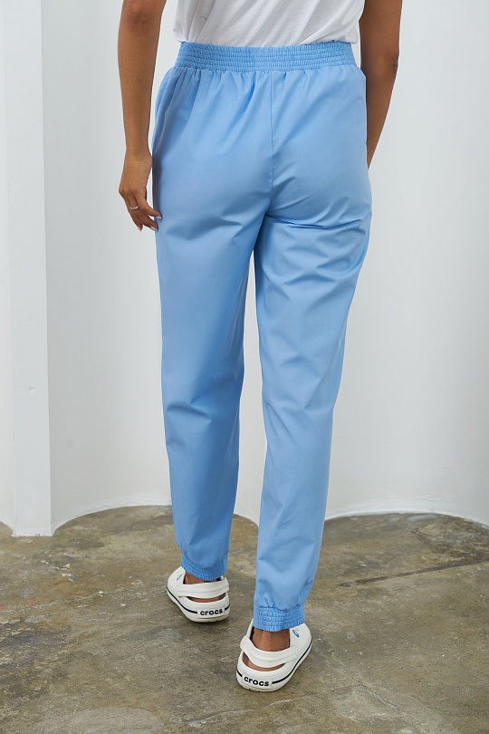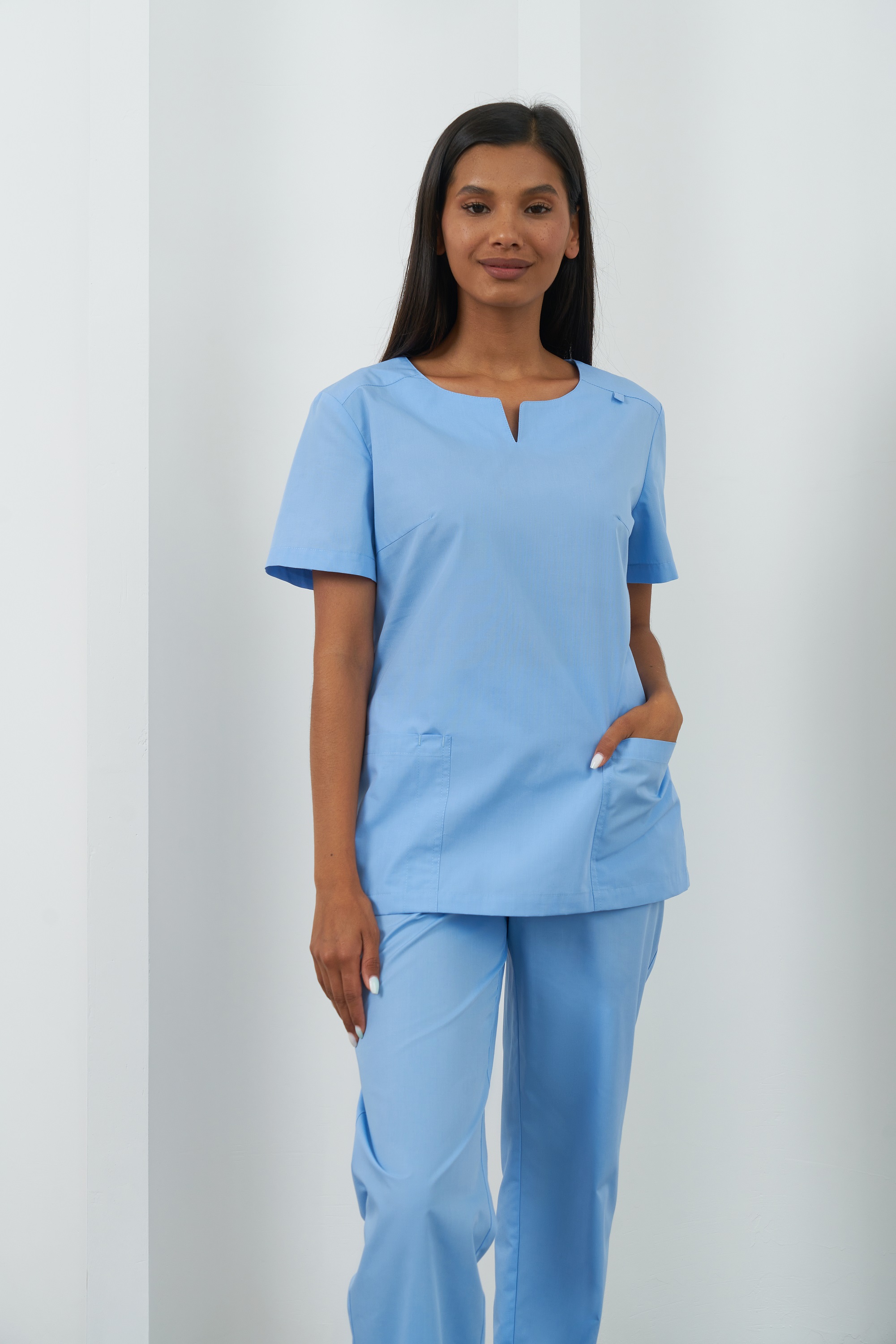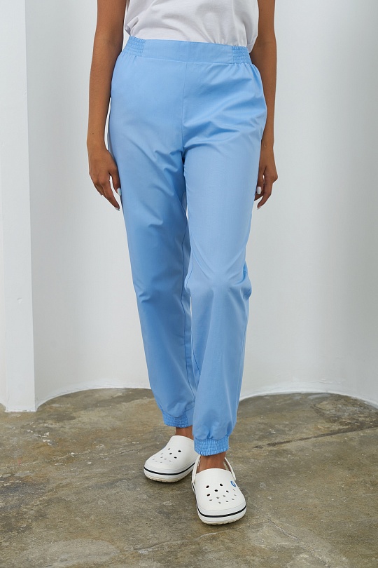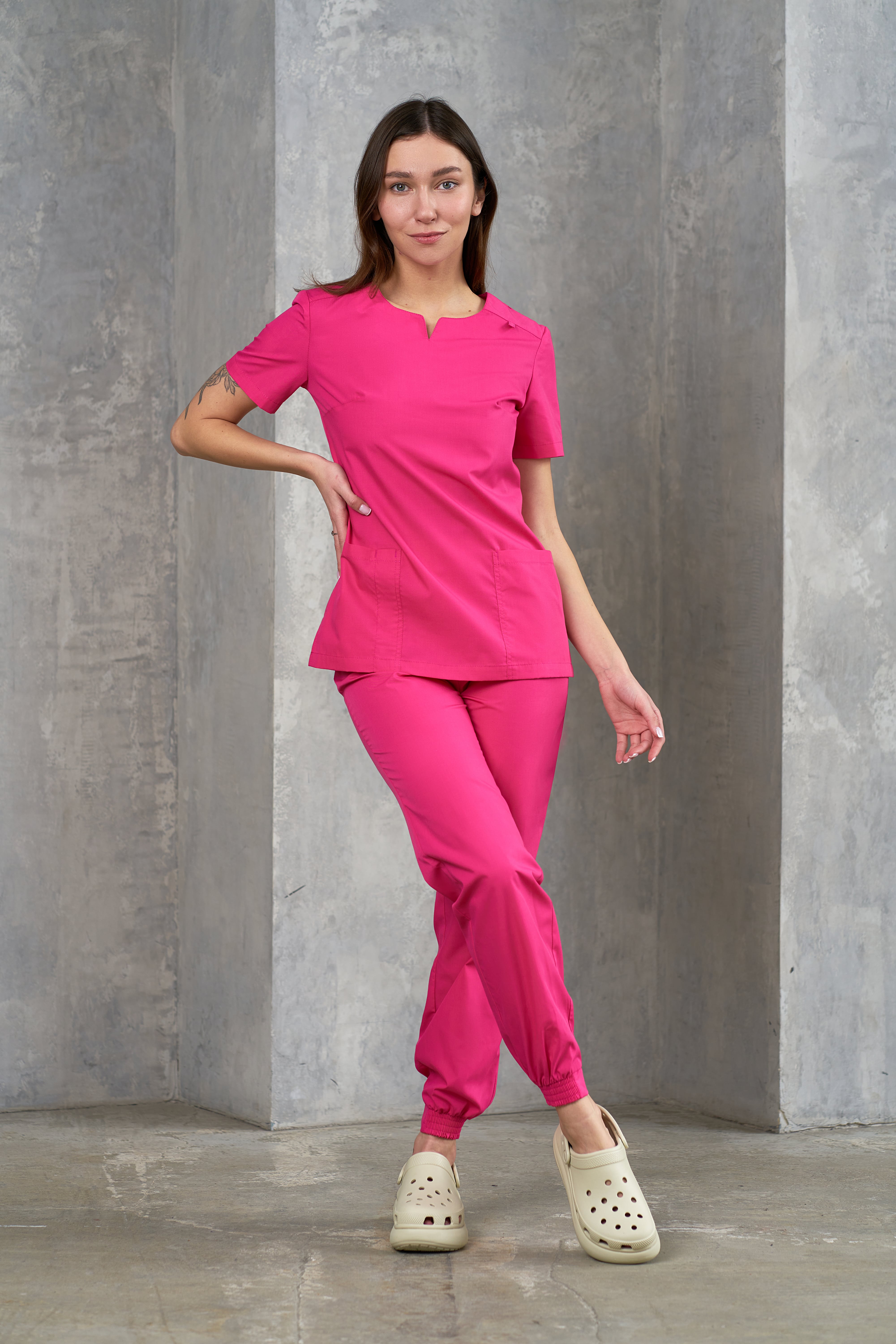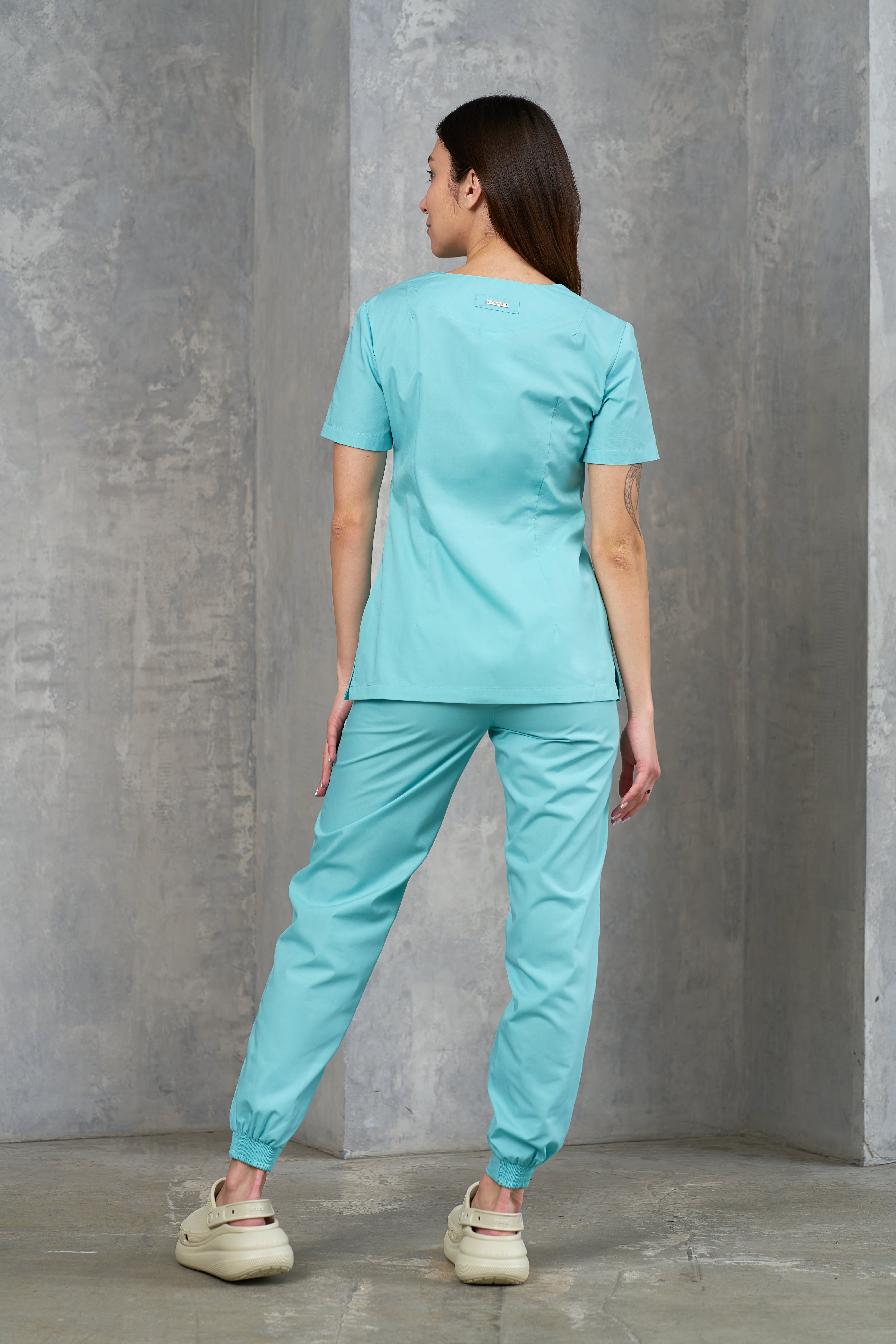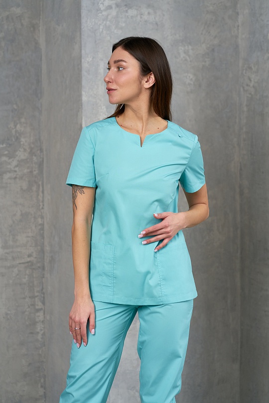 Куртка полуприлегающего силуэта, без застежки, с разрезами в боковых швах. Перед с нагрудными вытачками, кокетками, нижними боковыми накладными карманами. На правом кармане дополнительная строчка. В шов кокетки левой полочки вшита шлевка (петля) для бейджика. Вырез горловины фигурный обработан обтачками. Спинка с плечевыми и талевыми вытачками. По верху спинки настрочена отделочная деталь Брюки женские, зауженные к низу, на притачном поясе со вставкой посередине и с продернутой эластичной резиной. По низу брюк притачная манжета с продернутой эластичной тесьмой, и со вставкой посередине.