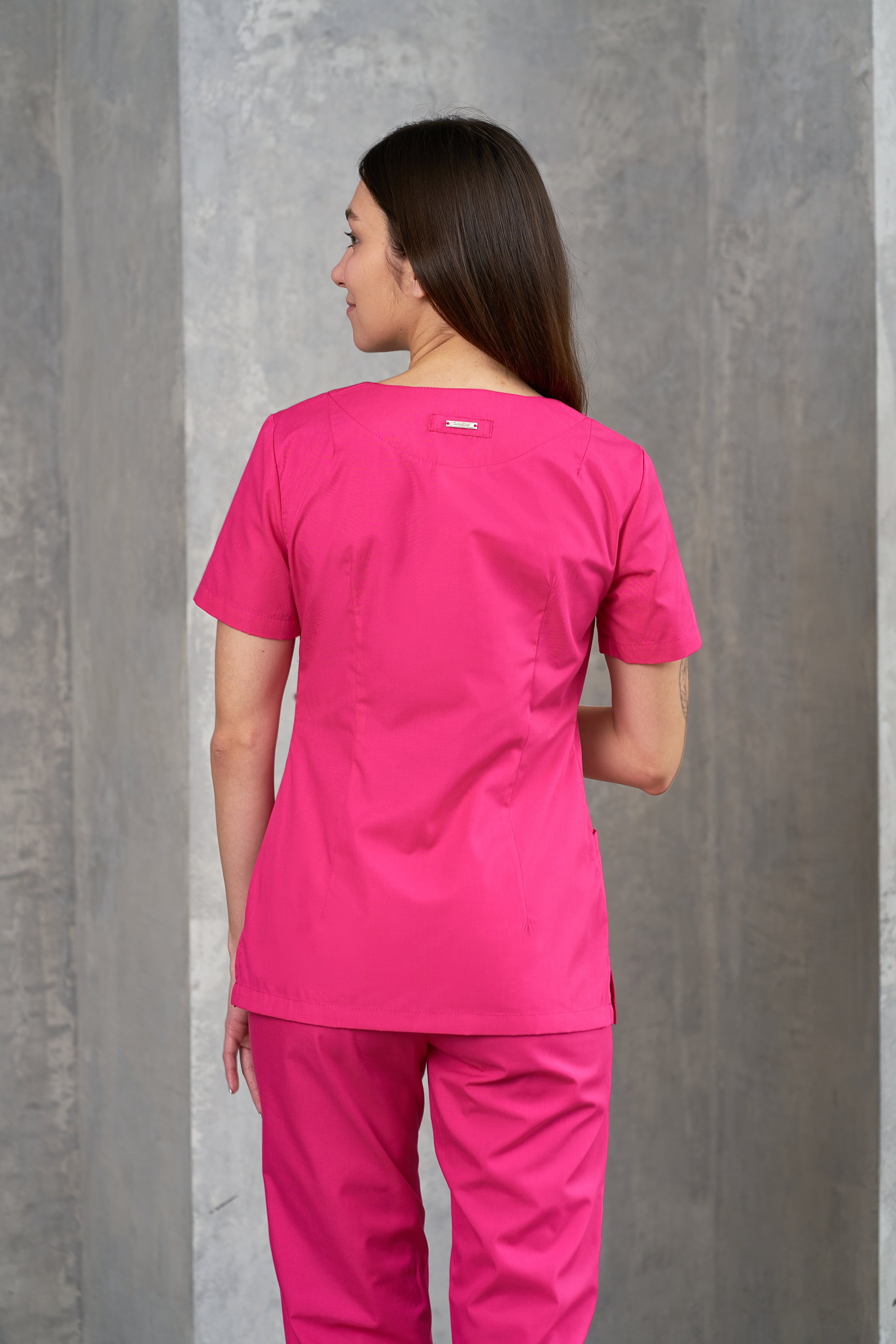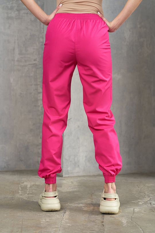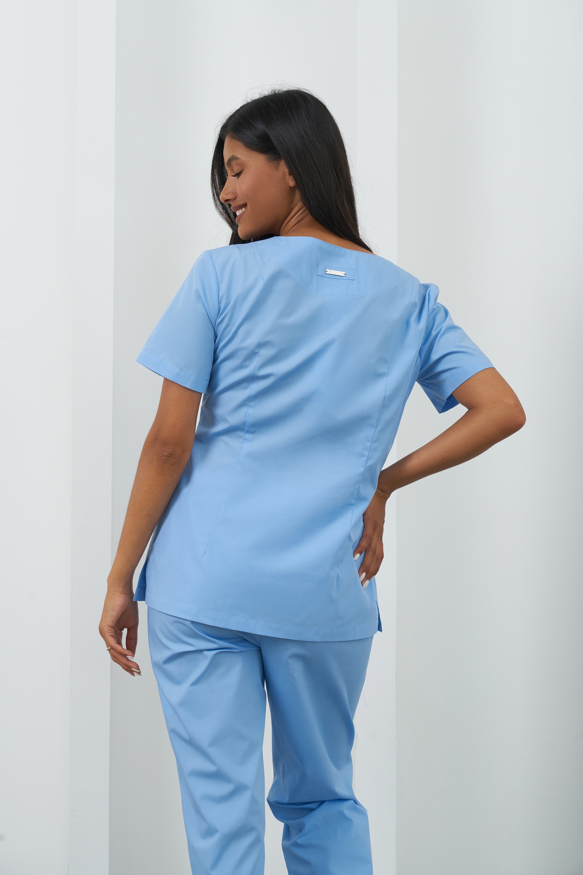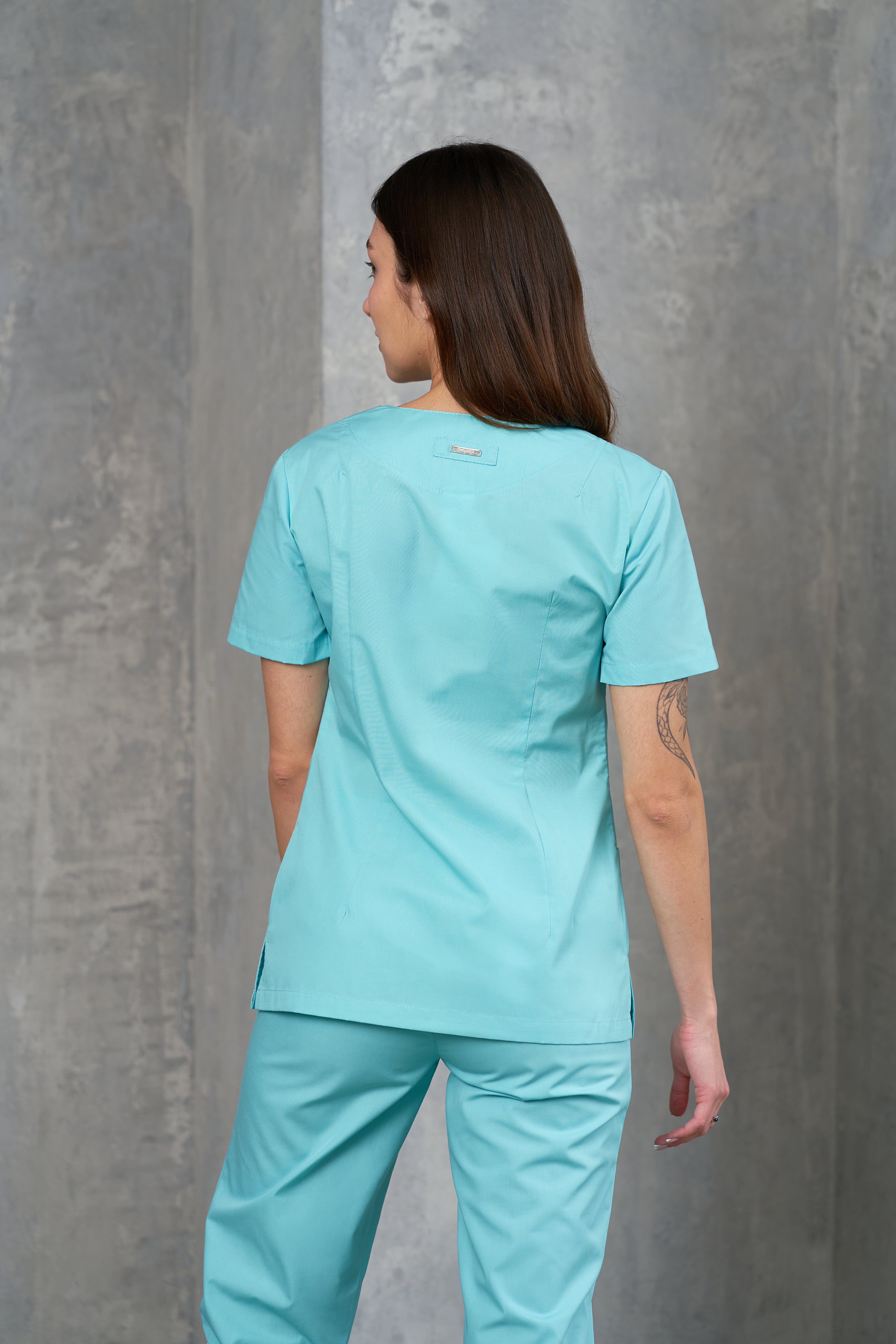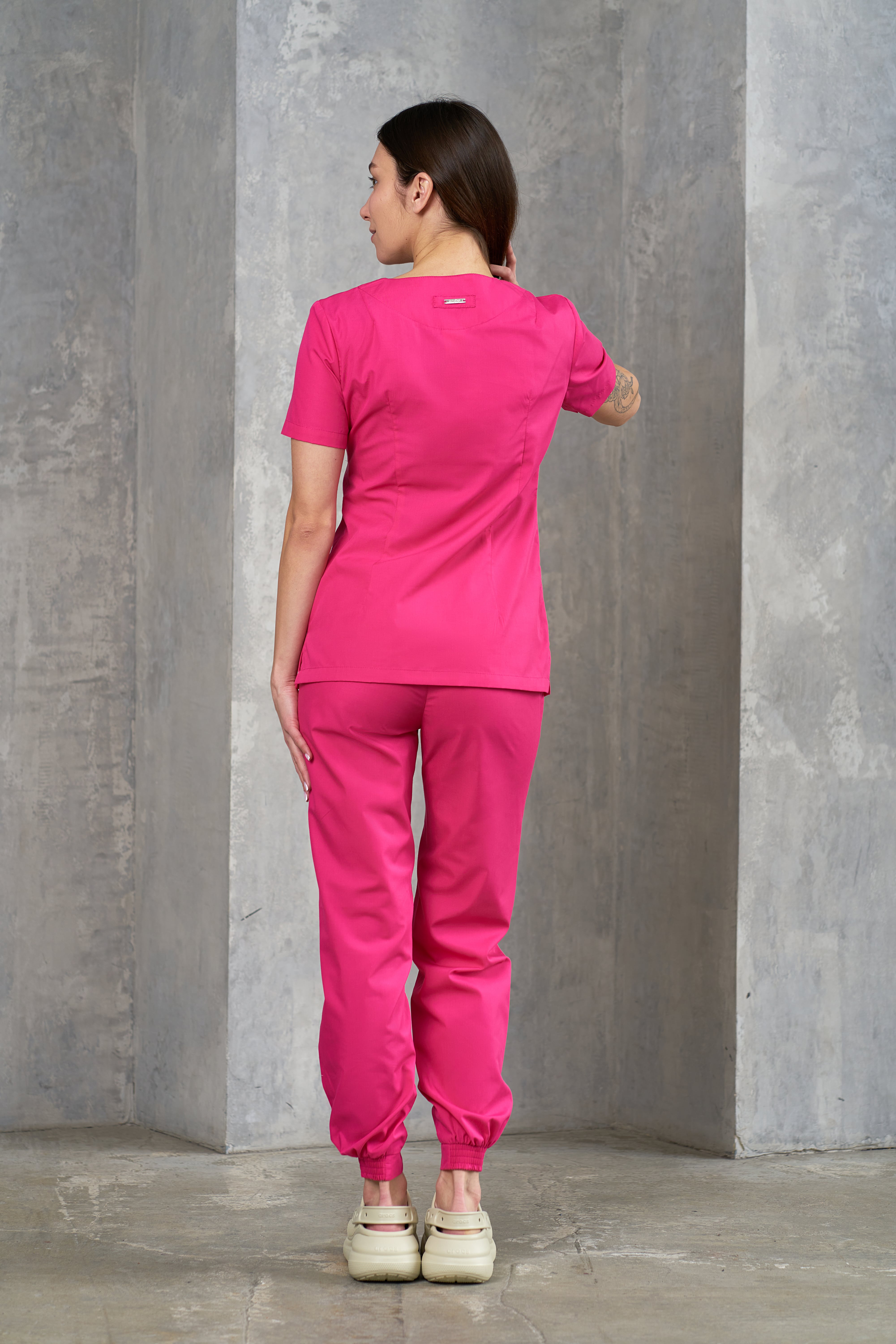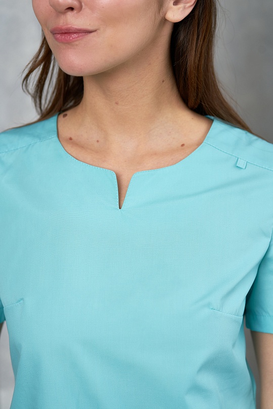 Куртка полуприлегающего силуэта, без застежки, с разрезами в боковых швах. Перед с нагрудными вытачками, кокетками, нижними боковыми накладными карманами. На правом кармане дополнительная строчка. В шов кокетки левой полочки вшита шлевка (петля) для бейджика. Вырез горловины фигурный обработан обтачками. Спинка с плечевыми и талевыми вытачками. По верху спинки настрочена отделочная деталь Брюки женские, зауженные к низу, на притачном поясе со вставкой посередине и с продернутой эластичной резиной. По низу брюк притачная манжета с продернутой эластичной тесьмой, и со вставкой посередине.