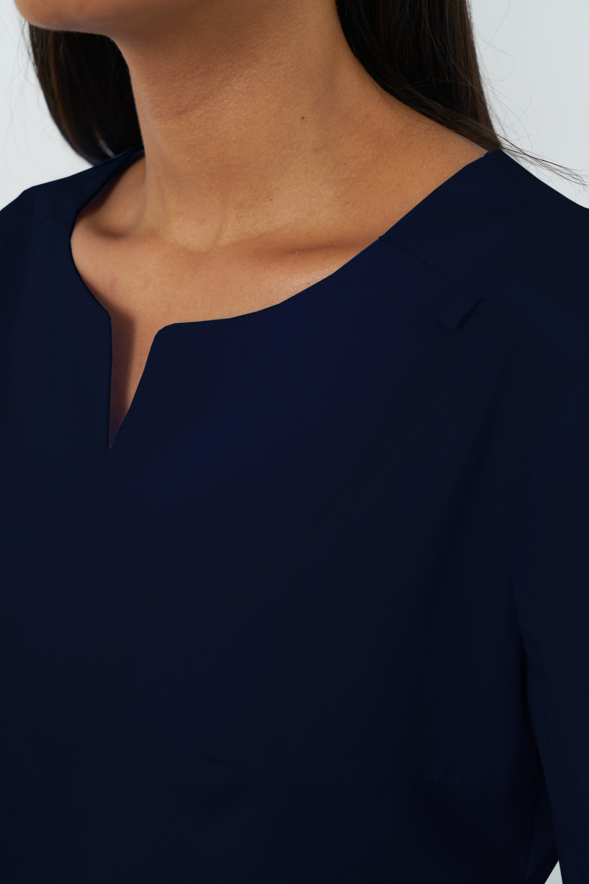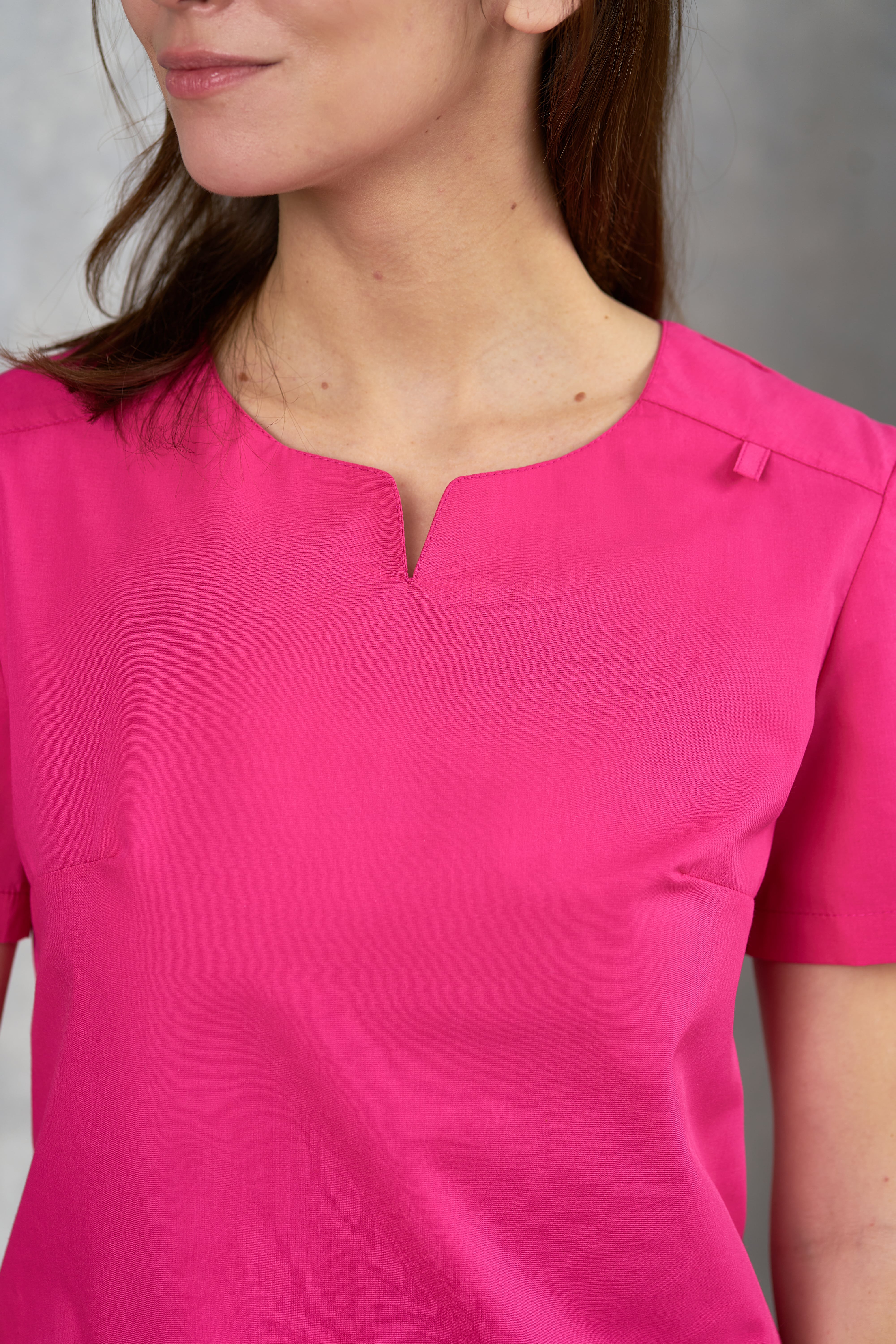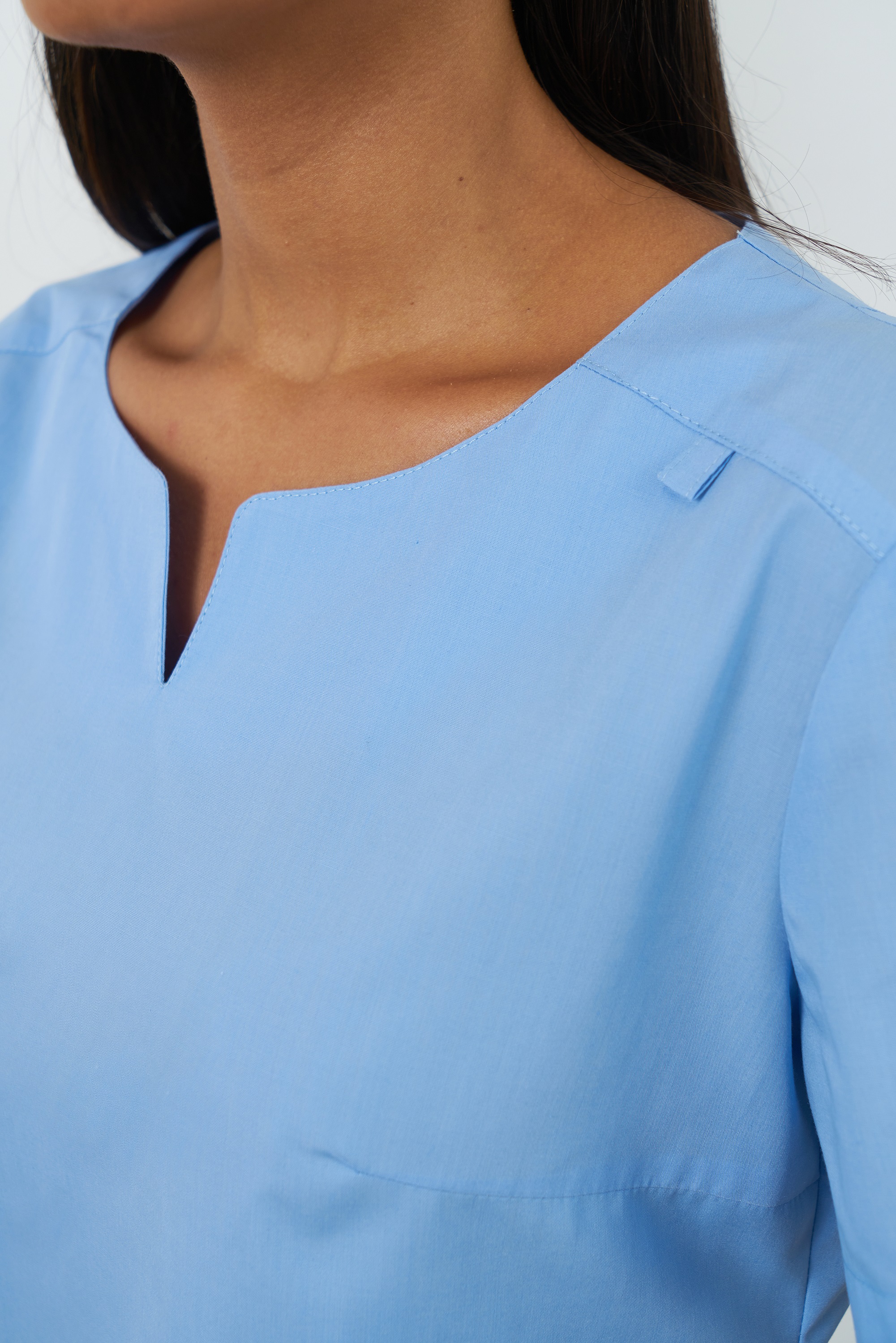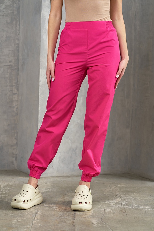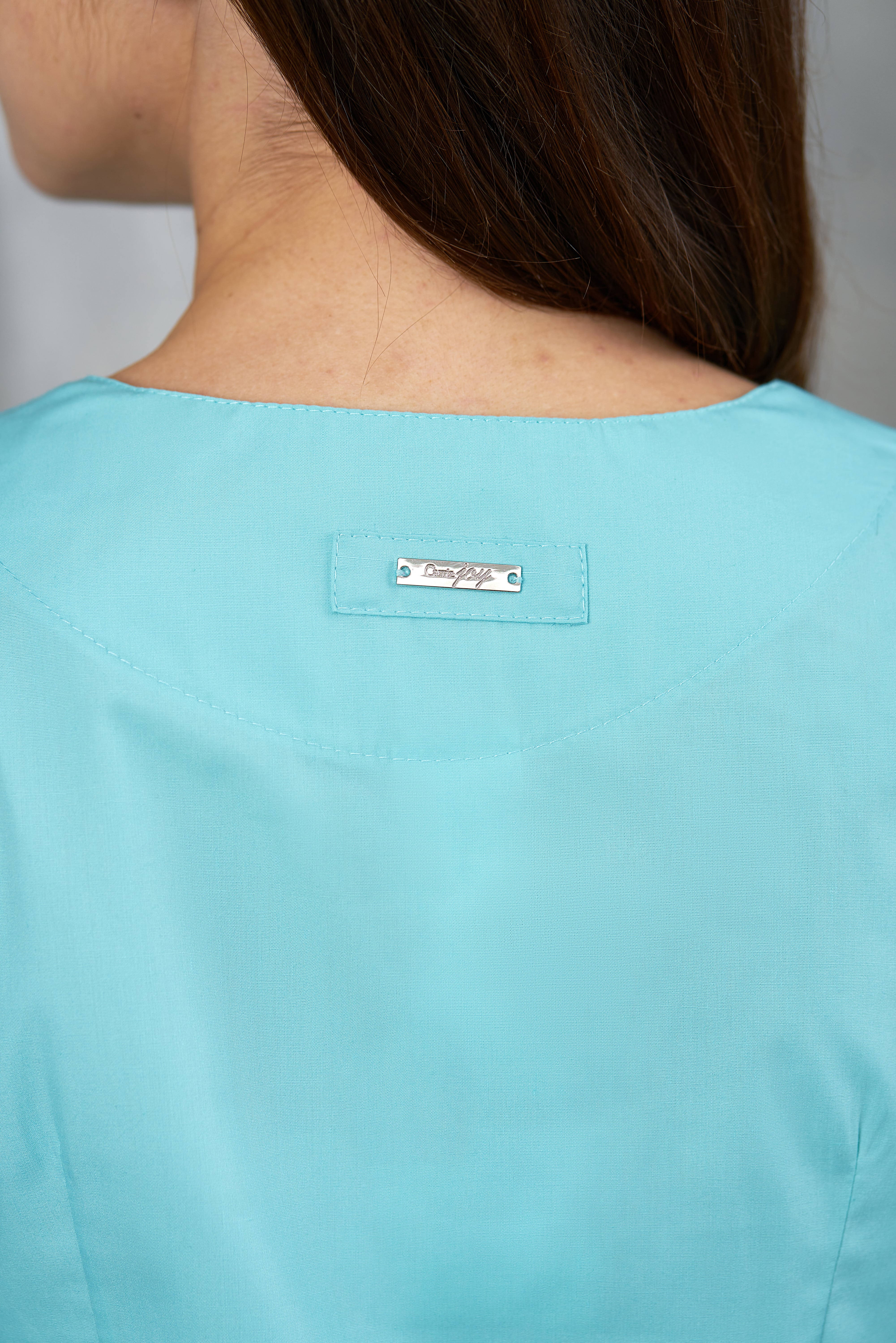 Куртка полуприлегающего силуэта, без застежки, с разрезами в боковых швах. Перед с нагрудными вытачками, кокетками, нижними боковыми накладными карманами. На правом кармане дополнительная строчка. В шов кокетки левой полочки вшита шлевка (петля) для бейджика. Вырез горловины фигурный обработан обтачками. Спинка с плечевыми и талевыми вытачками. По верху спинки настрочена отделочная деталь Брюки женские, зауженные к низу, на притачном поясе со вставкой посередине и с продернутой эластичной резиной. По низу брюк притачная манжета с продернутой эластичной тесьмой, и со вставкой посередине.