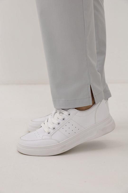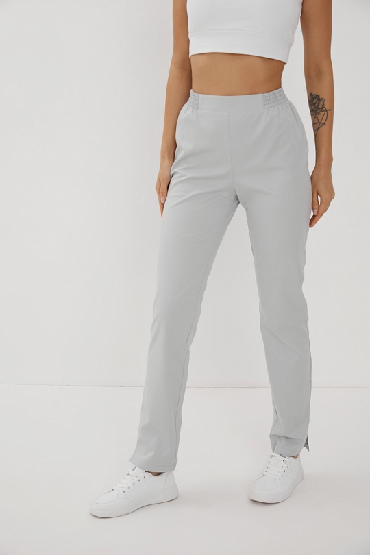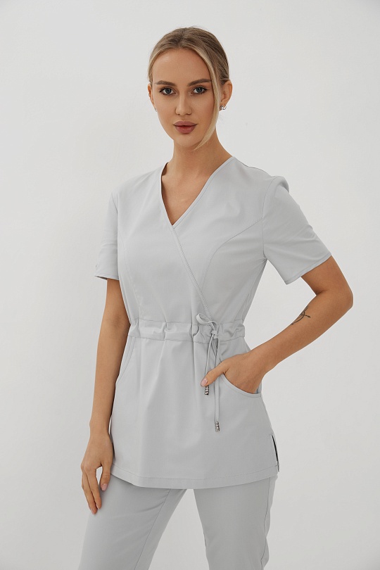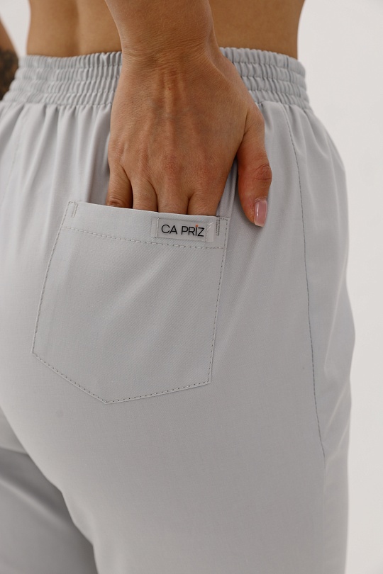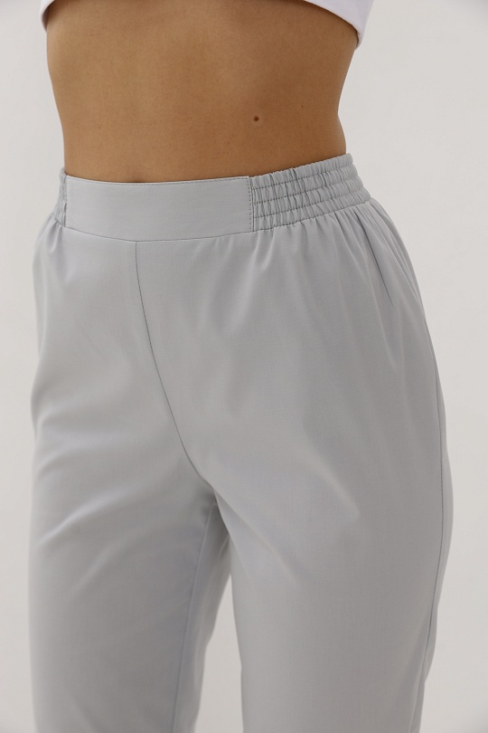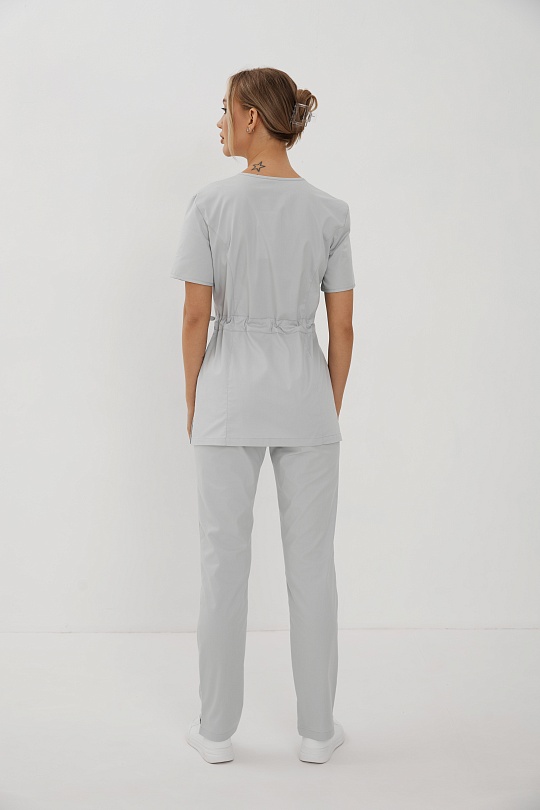 Куртка женская, полуприлегающего силуэта, без застежки, горловина с запахом, разрезами в боковых швах. Перед с отрезным поясом по талии, рельефами от проймы до пояса, нижними карманами. Cпинка с отрезным поясом по талии, рельефными швами от проймы до пояса и от пояса до низа. Рукава втачные, одношовные, короткие. По поясу продернут рулик, выходящий с левой стороны куртки и регулирующий объем по талии. Брюки женские, зауженные к низу, на притачном поясе со вставкой посередине и с продернутой эластичной резиной. Брюки с разрезами в боковых швах. На задних половинках брюк накладные карманы.