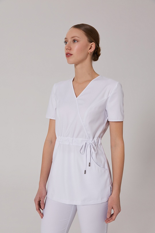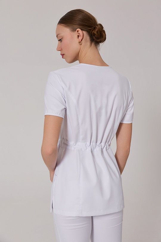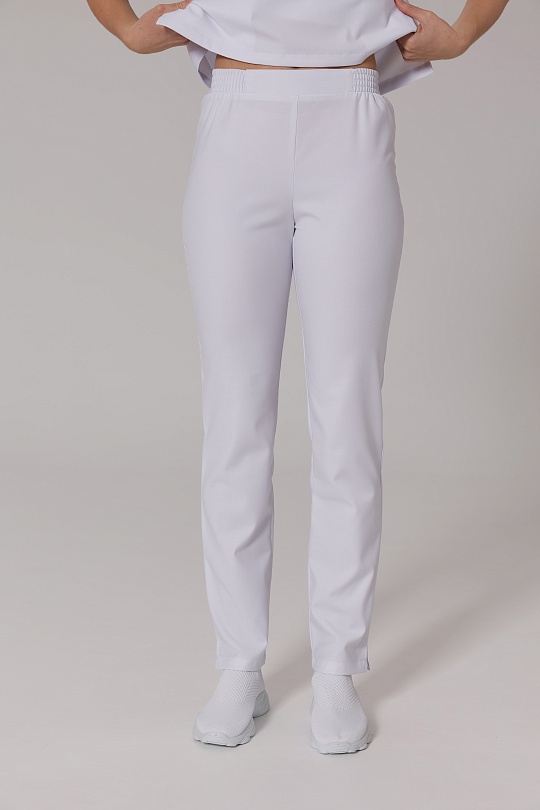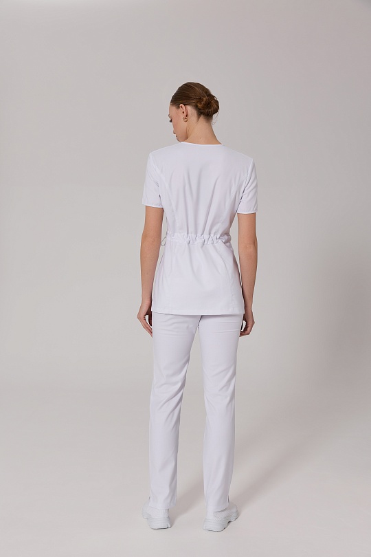Куртка женская, полуприлегающего силуэта, без застежки, горловина с запахом, разрезами в боковых швах. Перед с отрезным поясом по талии, рельефами от проймы до пояса, нижними карманами. Cпинка с отрезным поясом по талии, рельефными швами от проймы до пояса и от пояса до низа. Рукава втачные, одношовные, короткие. По поясу продернут рулик, выходящий с левой стороны куртки и регулирующий объем по талии. Брюки женские, зауженные к низу, на притачном поясе со вставкой посередине и с продернутой эластичной резиной. Брюки с разрезами в боковых швах. На задних половинках брюк накладные карманы.