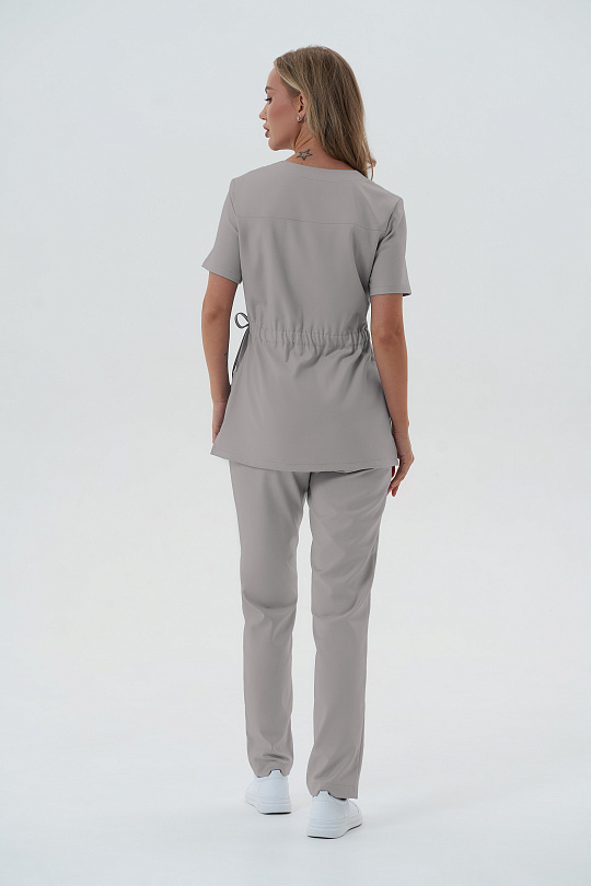 Куртка женская полуприлегающего силуэта без застёжки, без воротника. По линии талии кулиска с резинкой в спинке и шнуром в полочке. Разрезы в боковых швах. Полочка с нагрудными выточками и кокетками, в карман левой полочки вшит флажок, на левой полочке в районе груди настрочена шлёвка. В нижней части полочки накладные карманы. Спинка с кокеткой. Рукава втачные, одношовные, короткие. Брюки женские, зауженные к низу, на притачном поясе со вставкой посередине и с продернутой эластичной резиной. В среднем шве передних половинок строчка, имитирующая гульфик