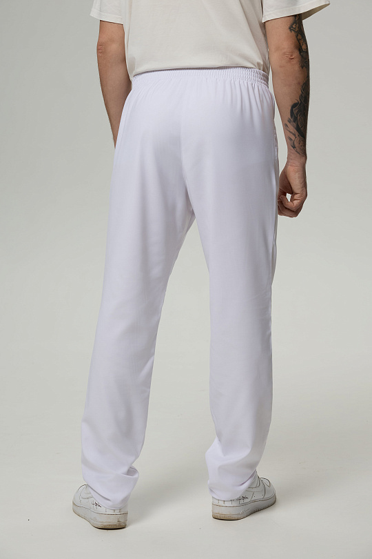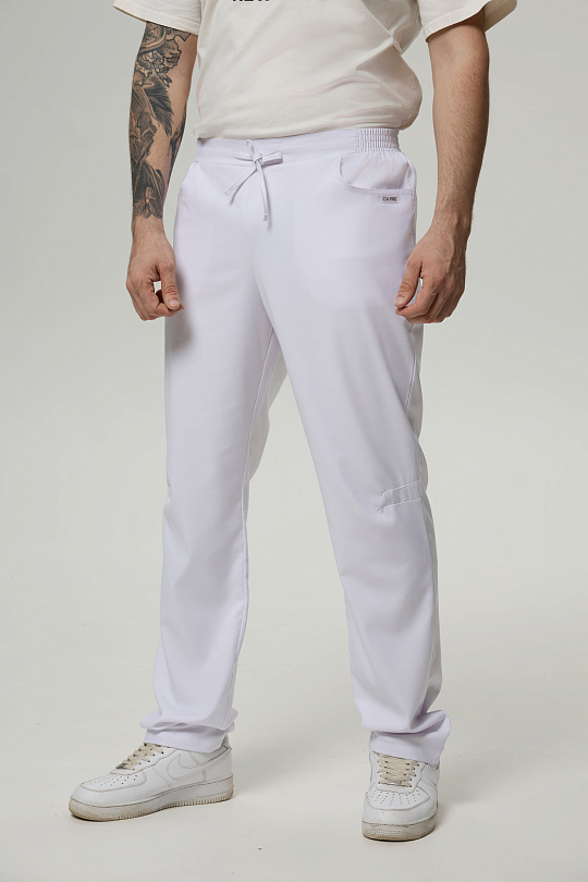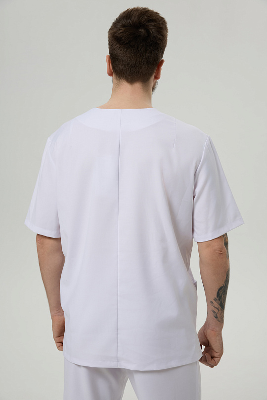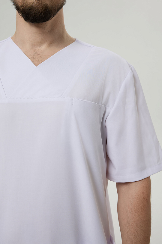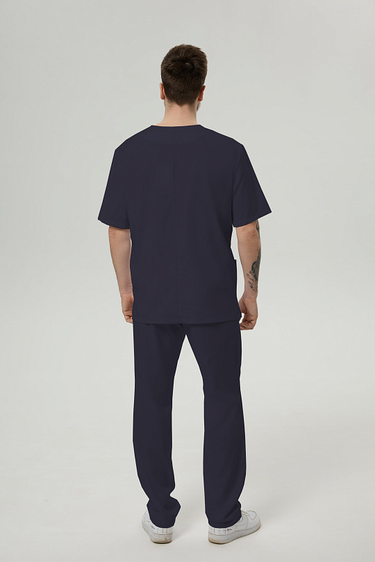 Куртка мужская, прямого силуэта, без воротника, с разрезами в боковых швах. На полочке фигурная горловина обработана планками. Полочка с двумя боковыми накладными карманами и одним нагрудным карманом в шве кокетки. Спинка со средним швом и плечевыми вытачками. Рукава втачные, одношовные, короткие. Брюки мужские на притачном поясе, прямые. Передние половинки с вытачками на уровне колена, с отрезным бочком и боковыми карманами с фигурным входом от пояса до бока. Пояс с эластичной тесьмой прошитой на многоигольной машине и со вставкой по переду с завязками.