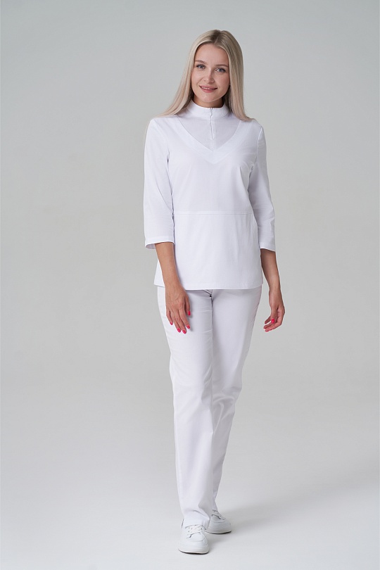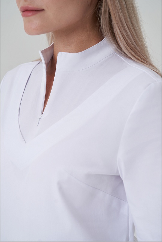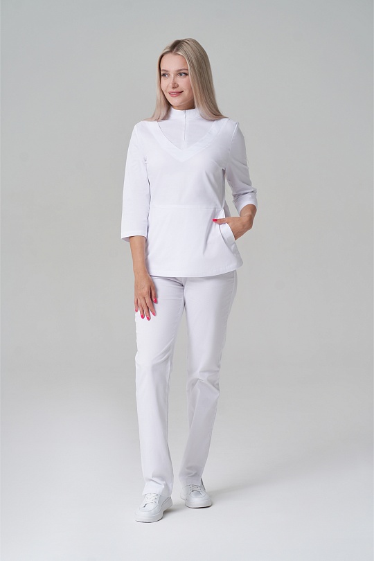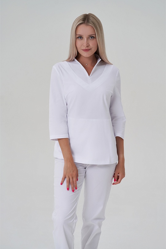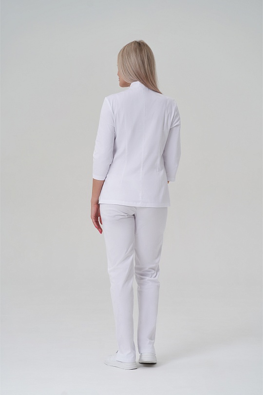 Куртка женская, полуприлегающего силуэта, с воротником-стойкой, с застёжкой на потайную молнию. Полочка с нагрудными вытачками из боковых швов, кокеткой, в нижней отрезной части полочки карманы. Спинка с талиевыми вытачками и средним швом. Рукава втачные, одношовные, имеют длину ¾.