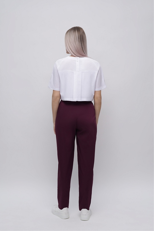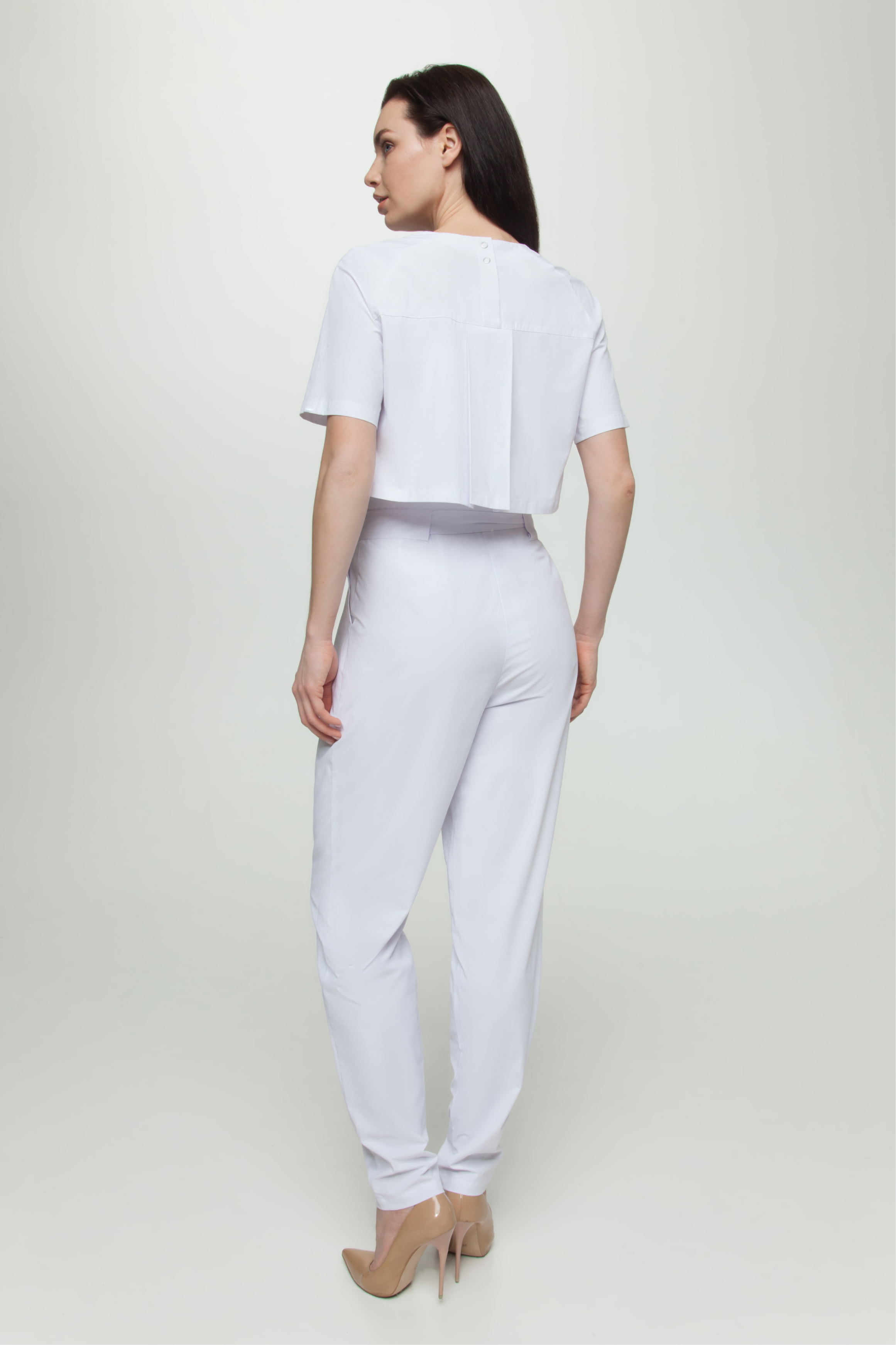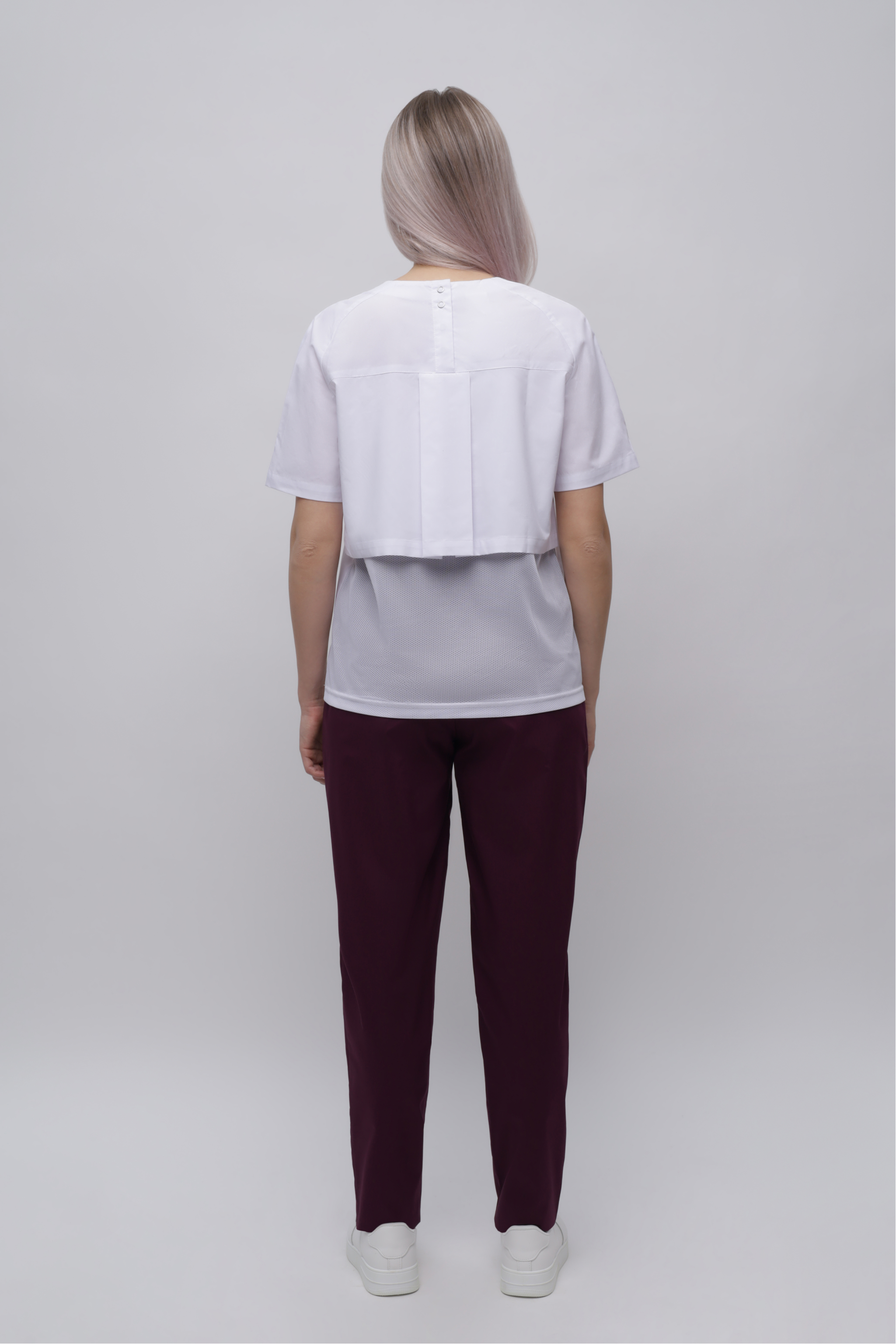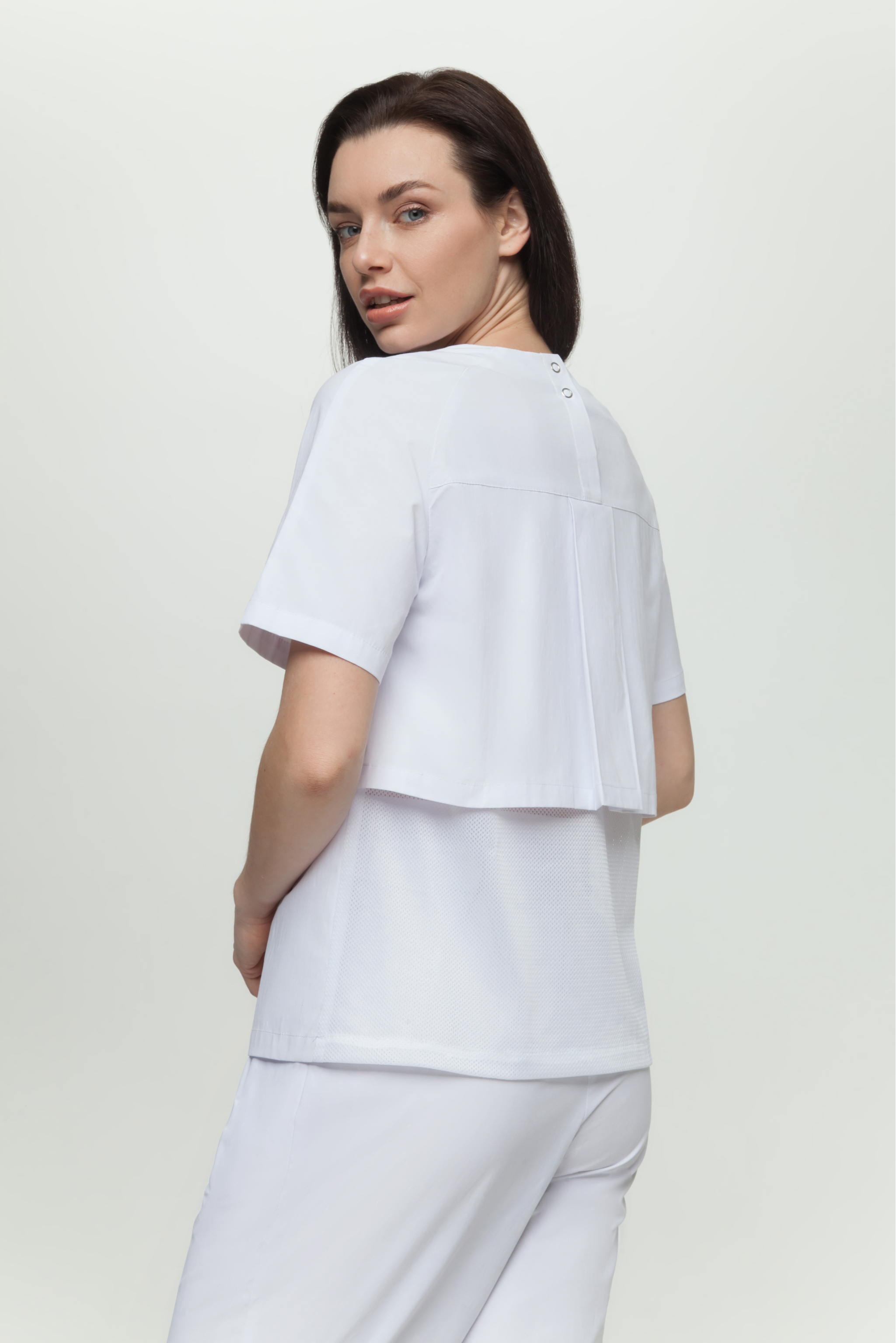Куртка прямого силуэта с округлым вырезом горловины, длинной до уровня бедер Перед с нагрудными вытачками Спинка с застежкой по центру кокетки на 4 кнопки, с отлетной кокеткой, нижняя спинка выполнена из отделочной ткани(сетка). Отлетная кокетка со складкой по центру и обработанными разрезами в боковых швах. Рукава покроя реглан, двухшовные, короткие Низ изделия, отлетной кокетки и рукава обработан швом в подгибку с закрытым срезом.