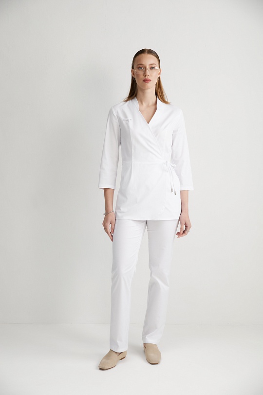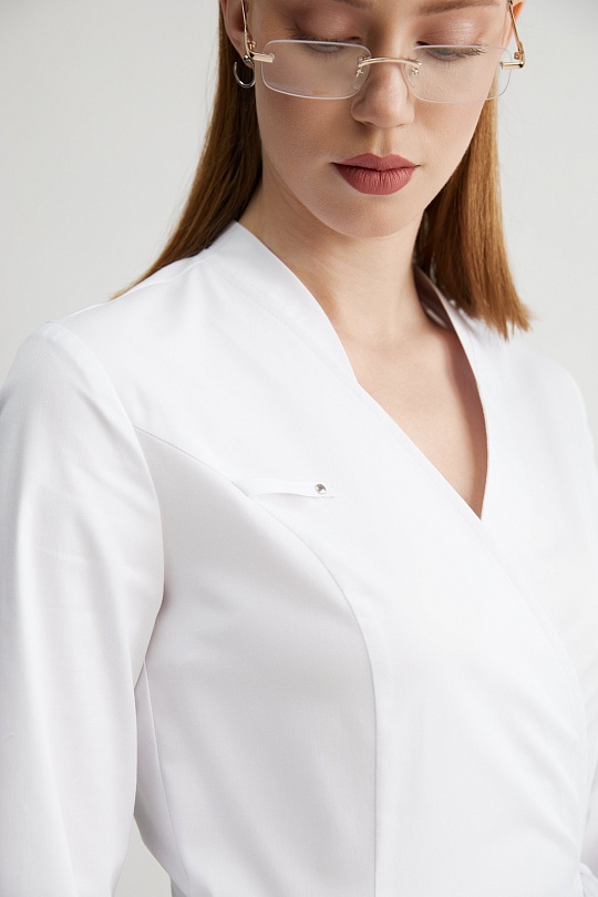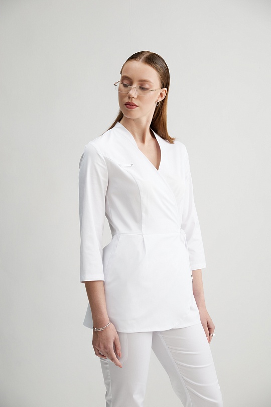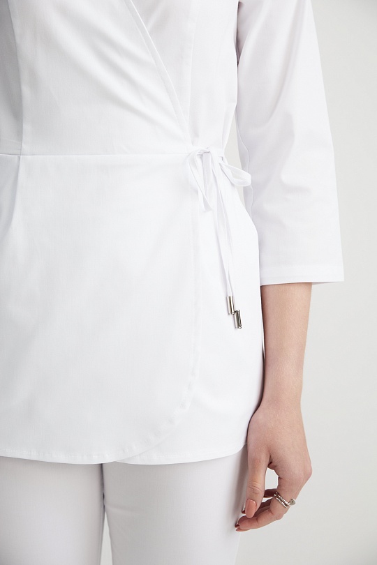 Куртка женская, полуприлегающего силуэта без застёжки с запахом, фиксация шнурком. Горловина обработана обтачкой. Воротник стойка Полочка с рельефами из проймы и подрезом по талии. В нижней части обработан карман. Спинка с подрезом по талии, в верхней части спинки вытачки.