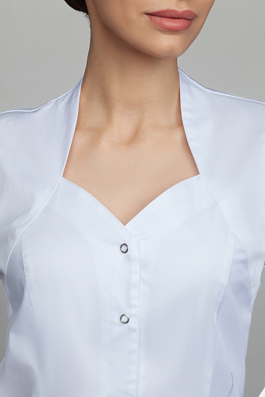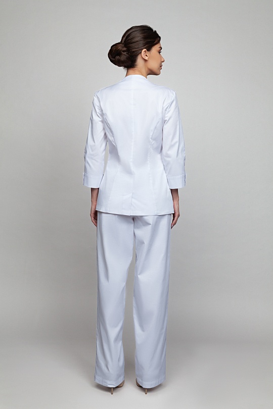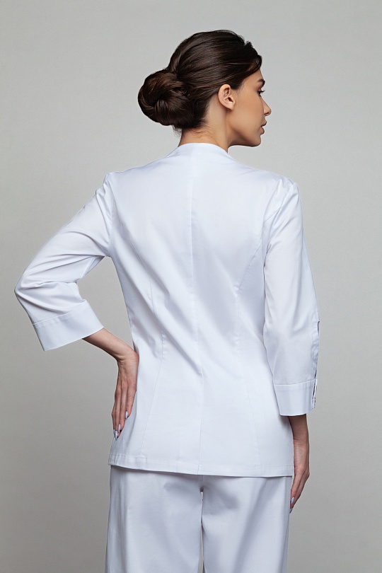 Куртка женская прилегающего силуэта, с центральной бортовой застежкой на кнопки: две видимые и потайные. Полочка с отрезной кокеткой , выходящей от бокового шва и переходящей в цельнокроенную стойку. Полочка с рельефами из кокетки переходящими в боковые карманы с планками. Спинка со средним швом, переходящим в шлицу, рельефами из проймы до низа изделия. Спинка с цельнокроенной стойкой. Рукава втачные, одношовные. Рукав ¾ — с отрезным манжетом с кнопками. На рукаве ¾ обтачен вырез в виде «капли» по центру рукава.