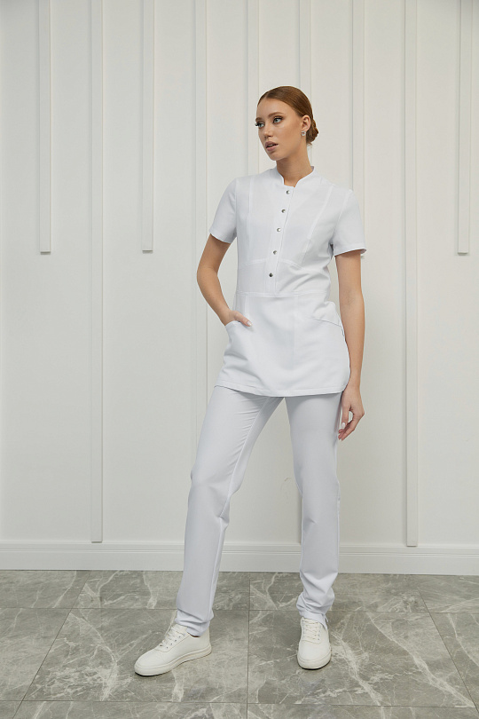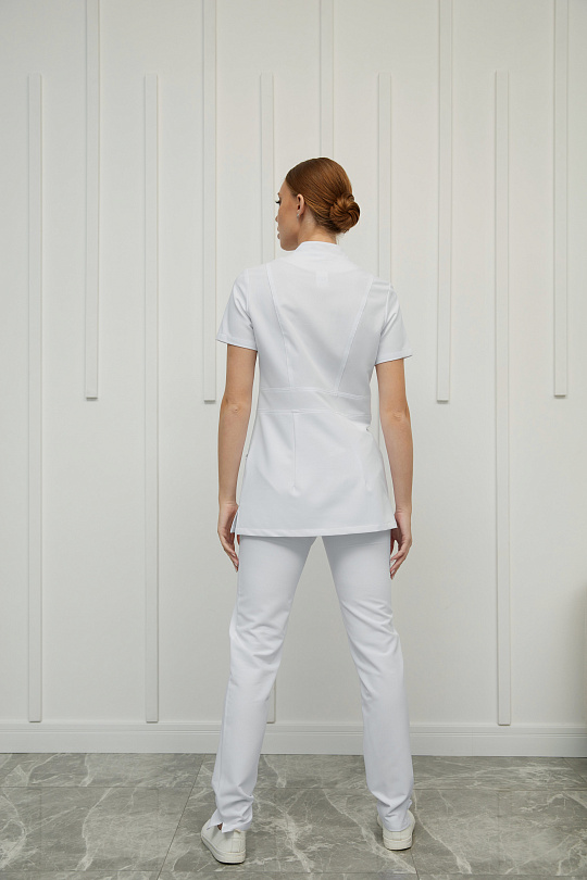 Куртка женская полуприлегающего силуэта, нераспашная с застежкой на кнопки с разрезами в боковых швах. Полочка с рельефами от плеча до отрезной части фигурной формы. Нижняя часть полочки также с рельефами от отрезной части, переходящие в боковые карманы. Полочка с притачной застежкой-планкой. Спинка с рельефами от плеча до отрезной части по спинке. Нижняя часть полочки с вытачками. Воротник втачной, стойка с закругленными концами. Рукава втачные, одношовные, короткие.