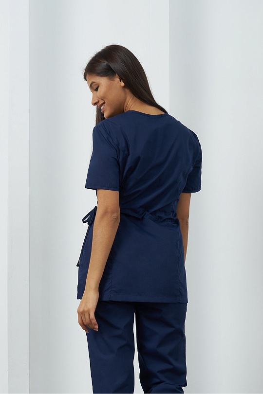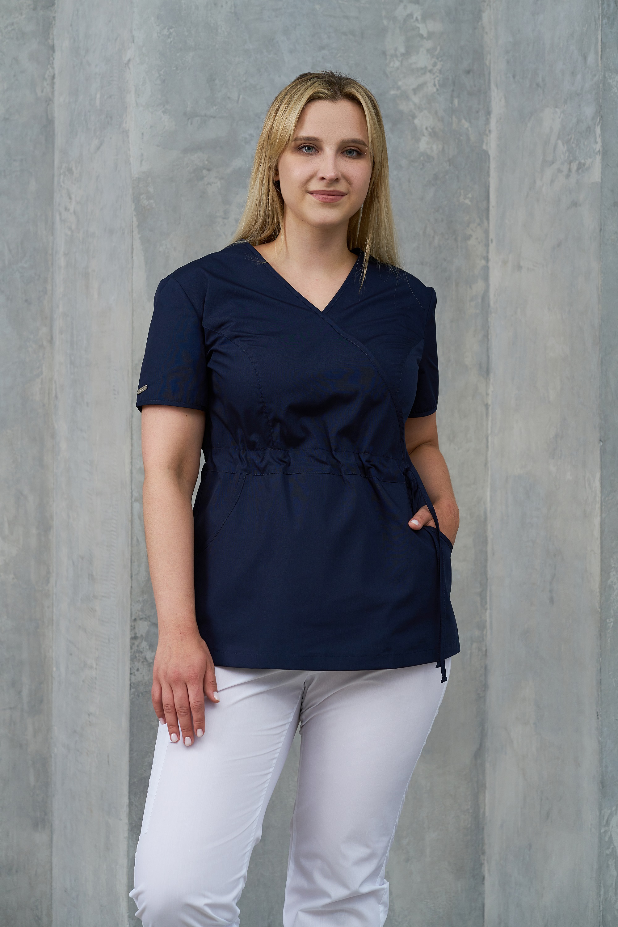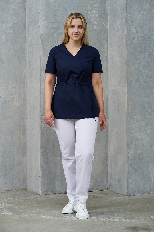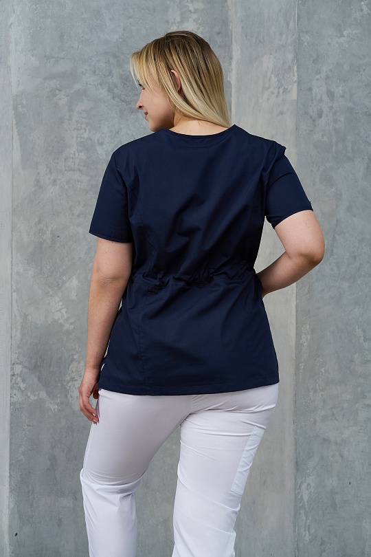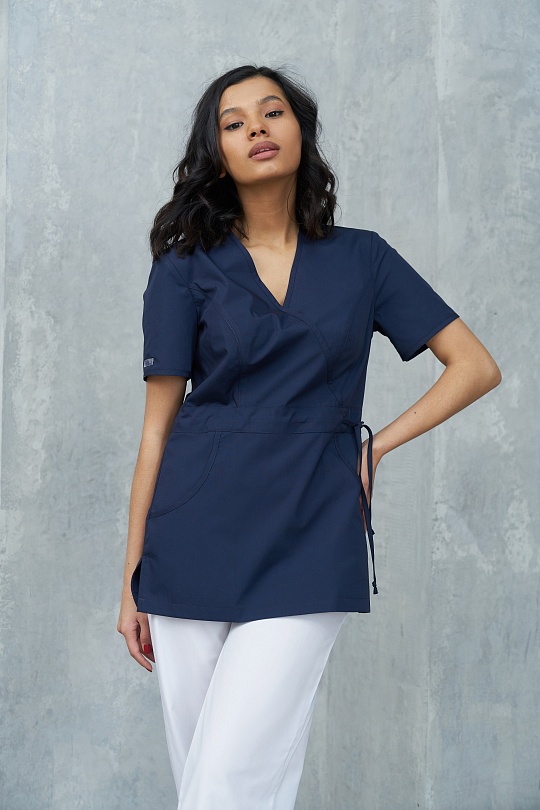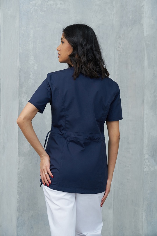 Куртка женская, полуприлегающего силуэта, без застежки, горловина с запахом, разрезами в боковых швах. Перед с отрезным поясом по талии, рельефами от проймы до пояса, нижними карманами. Спинка с отрезным поясом по талии, рельефными швами от проймы до пояса и от пояса до низа. Рукава втачные, одношовные, короткие. По поясу продернут рулик, выходящий с левой стороны куртки и регулирующий объем по талии.