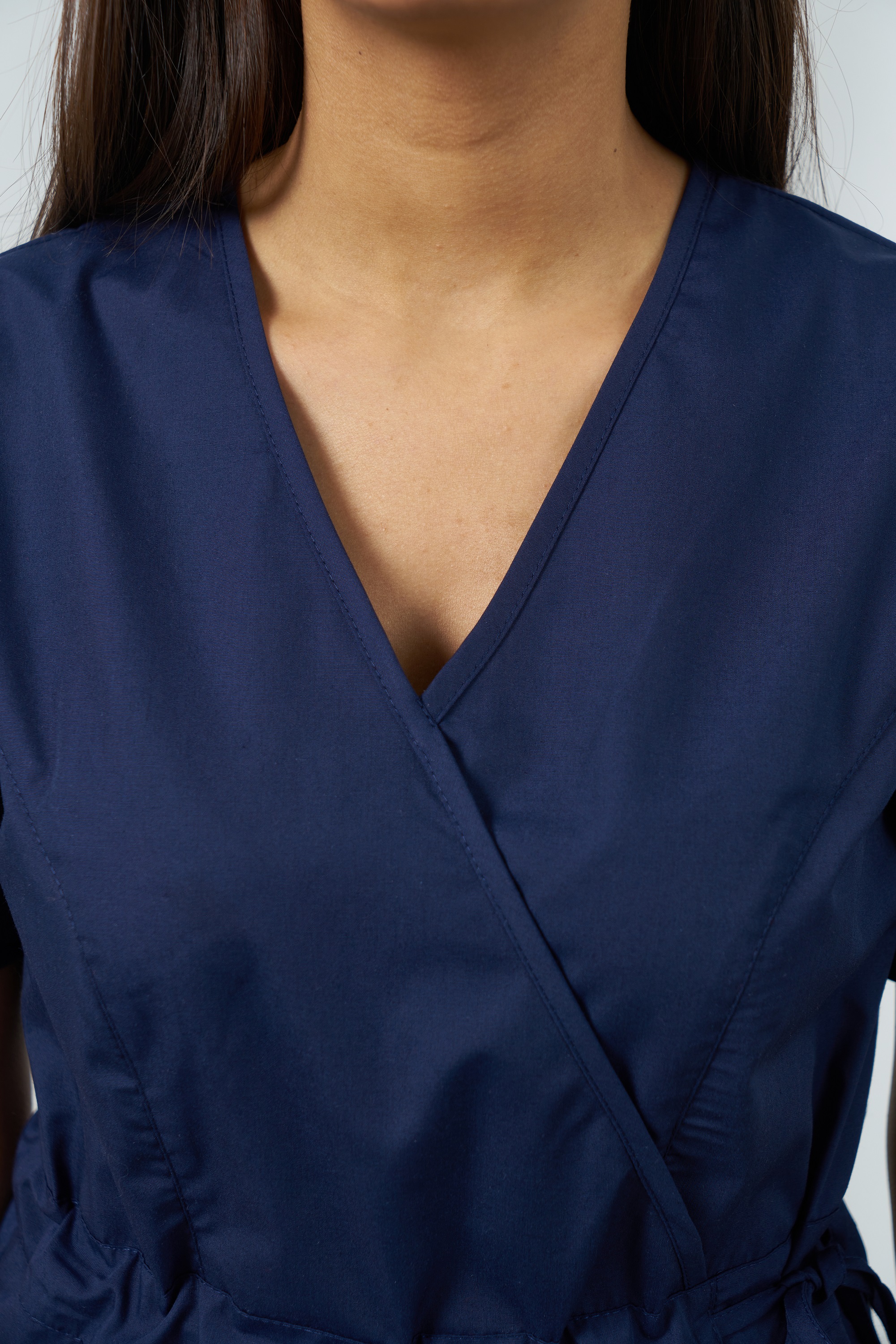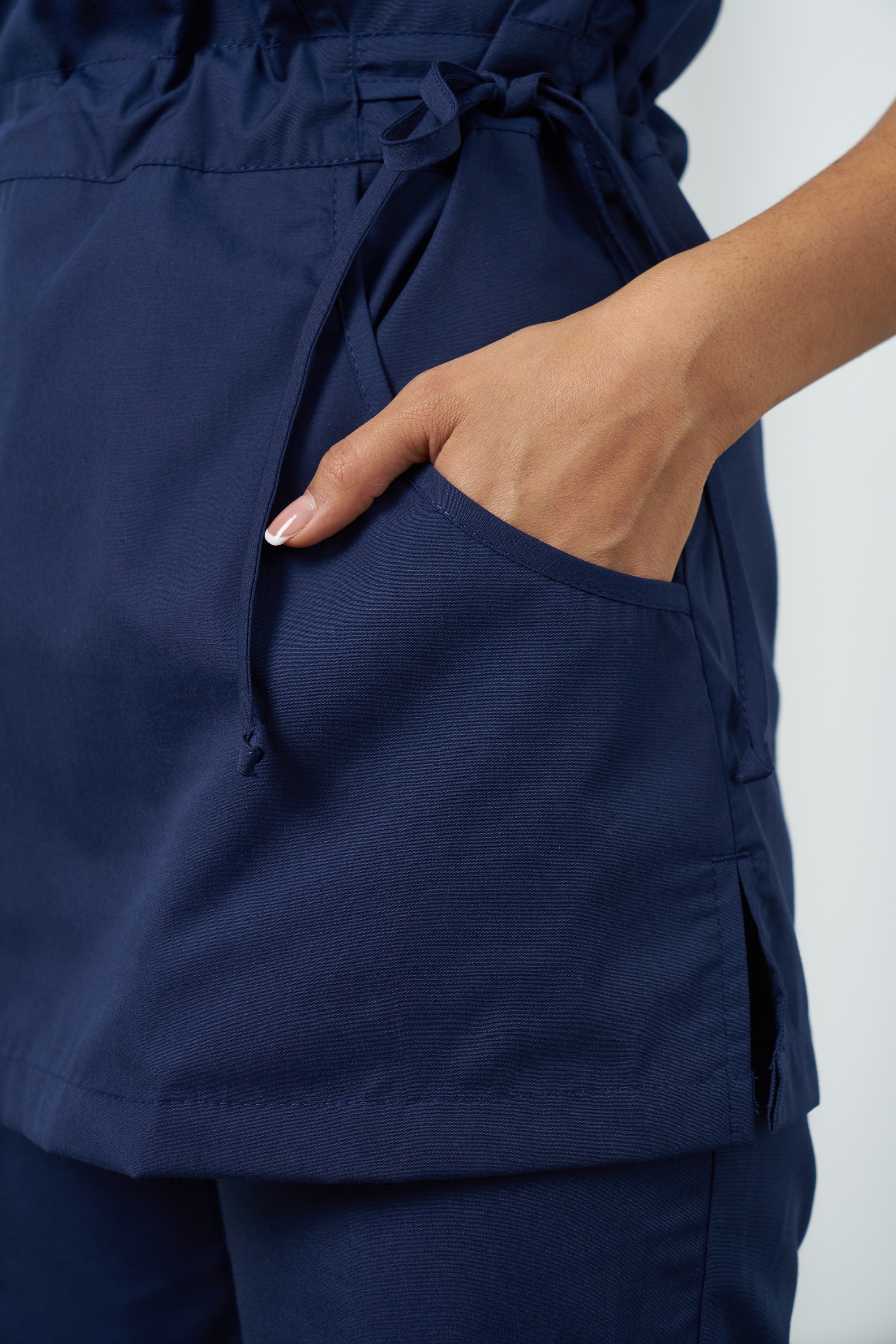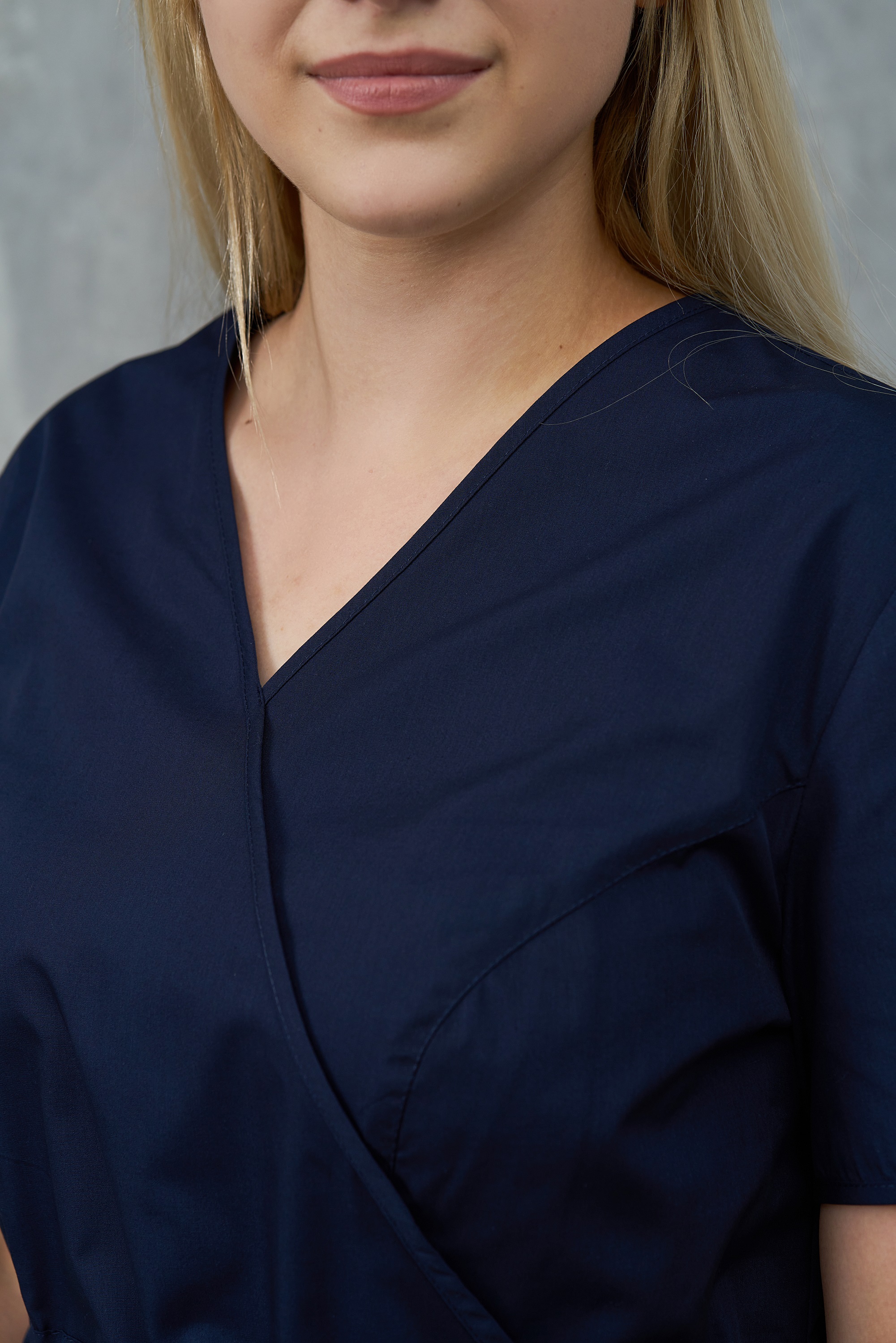 Куртка женская, полуприлегающего силуэта, без застежки, горловина с запахом, разрезами в боковых швах. Перед с отрезным поясом по талии, рельефами от проймы до пояса, нижними карманами. Спинка с отрезным поясом по талии, рельефными швами от проймы до пояса и от пояса до низа. Рукава втачные, одношовные, короткие. По поясу продернут рулик, выходящий с левой стороны куртки и регулирующий объем по талии.